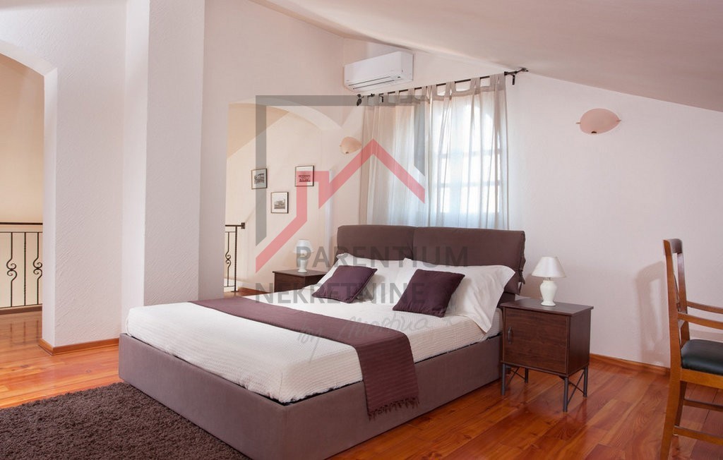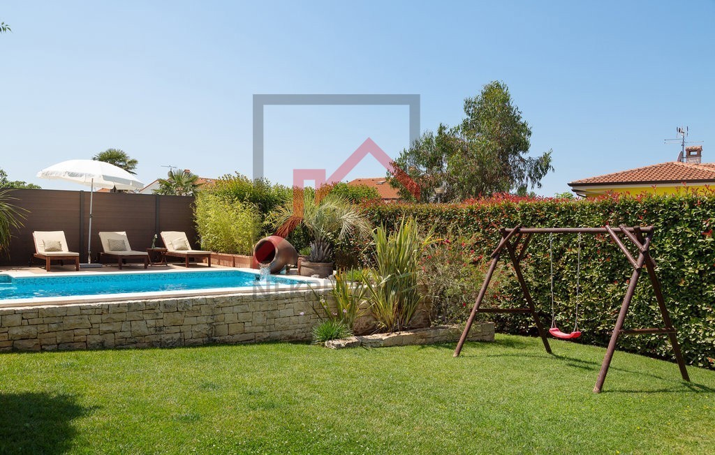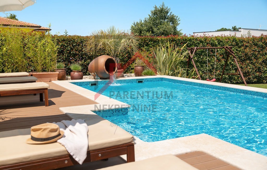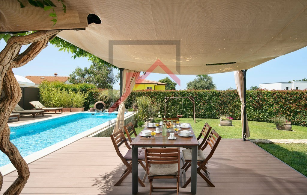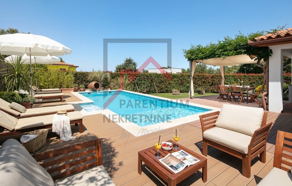 Ovo prekrasno imanje u neposrednoj blizini Poreča nudi savršen spoj luksuza, privatnosti i udobnosti, smješteno na prostranom zemljištu od 780 m² s pažljivo uređenom okućnicom. Uživajte u vlastitom bazenu, prostranom sunčalištu i ljetnoj kuhinji, dok natk