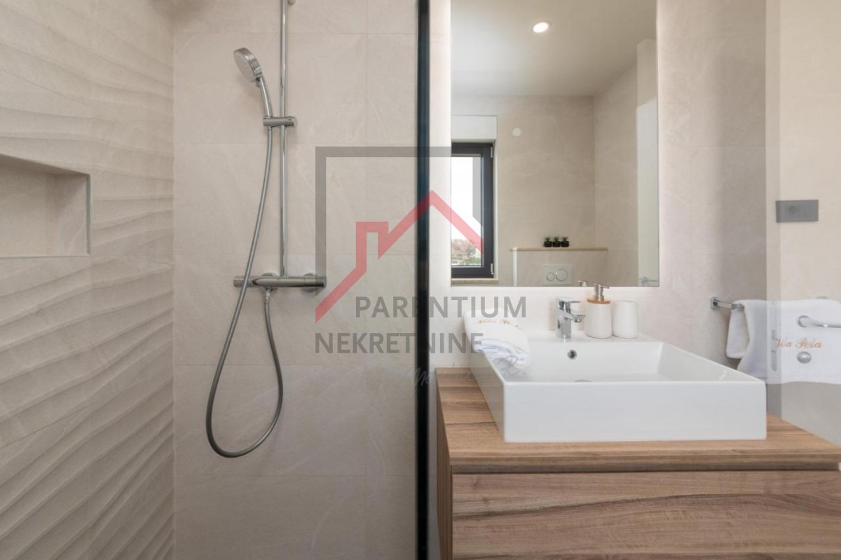 Istra, Poreč Na prodaju ova lijepa moderna kuća smještena na rubu građevinske zone, samo nekoliko kilometara od prekrasnog grada Poreča i u blizini mora. Kuća je okružena lijepo uređenim travnjakom i ograđena ogradom. U prizemlju se nalazi prostrani dn