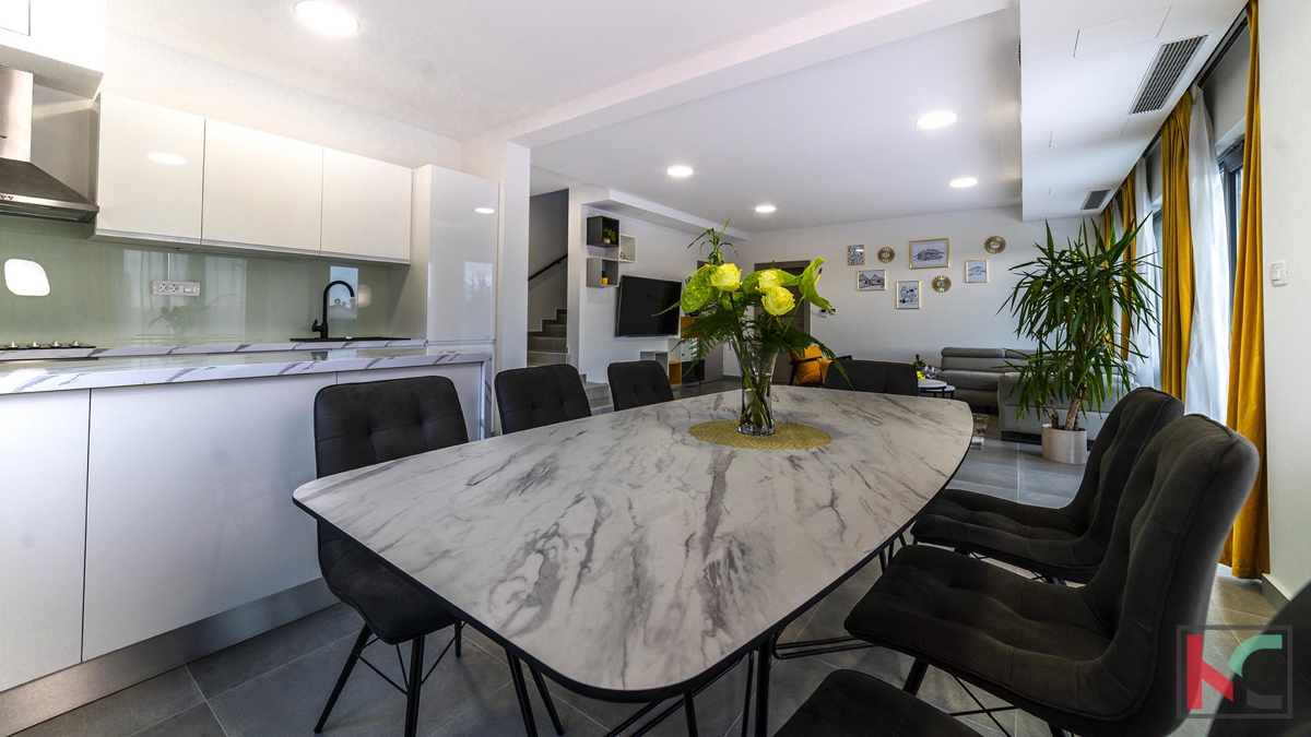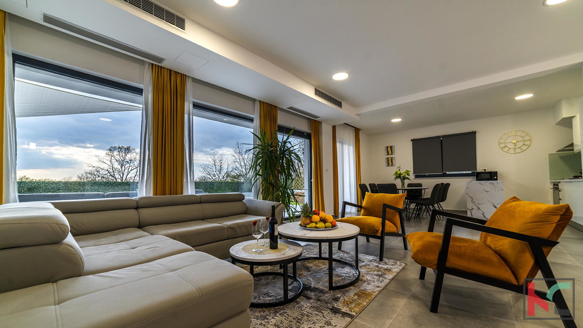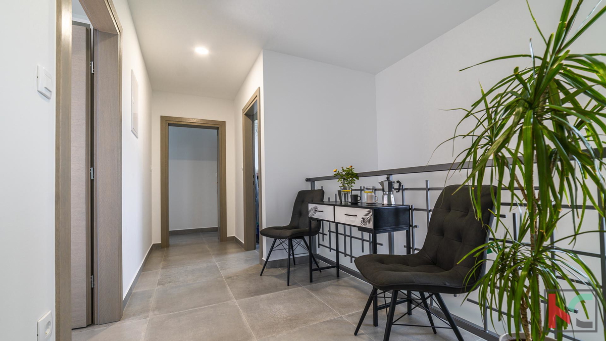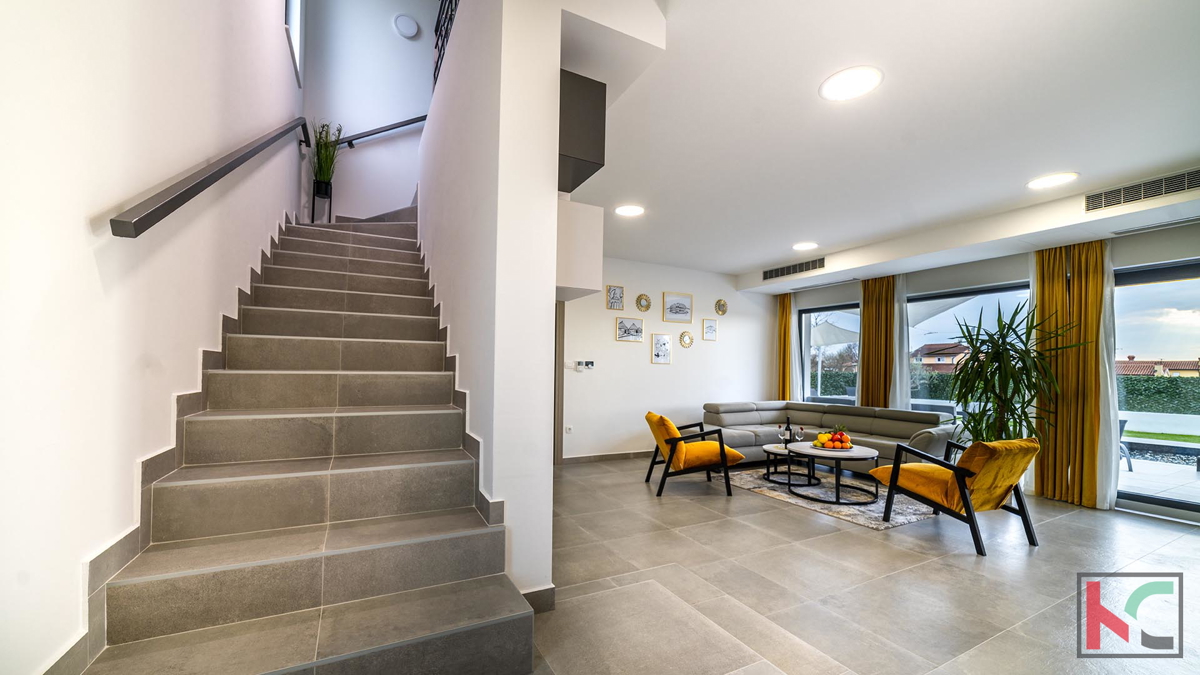 Prodaje se moderna vila u okolici Poreča, na mirnoj lokaciji udaljenoj na samo pet kilometara od centra i uređenih plaža. Prostire se na dvije etaže, ukupne površine 204 m2. Prizemlje se sastoji od ulaznog hodnika, prostranog dnevnog boravka sa izlazom n