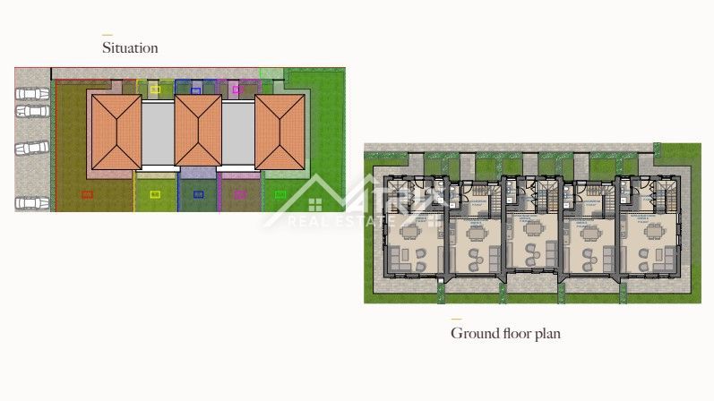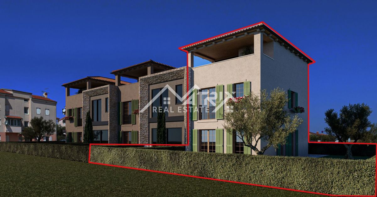 Na prodaju je suvremena kuća u nizu smještena u mirnom predgrađu Poreča, svega 3 km od centra grada. Ova nekretnina dio je modernog stambenog naselja koje uspješno spaja elegantne arhitektonske linije s toplim, tradicionalnim elementima istarskog stila gr