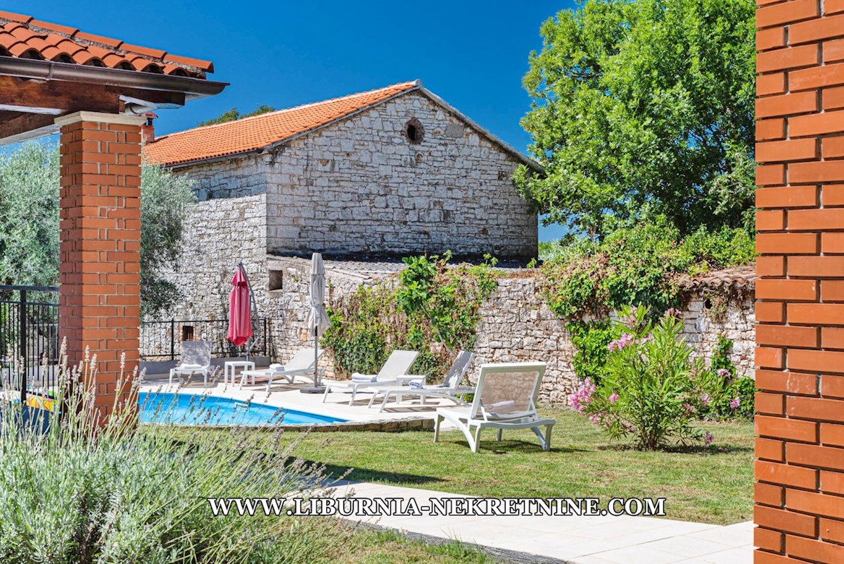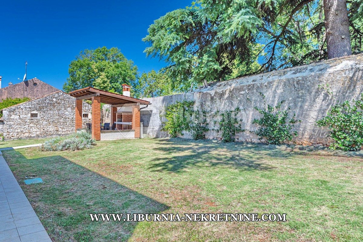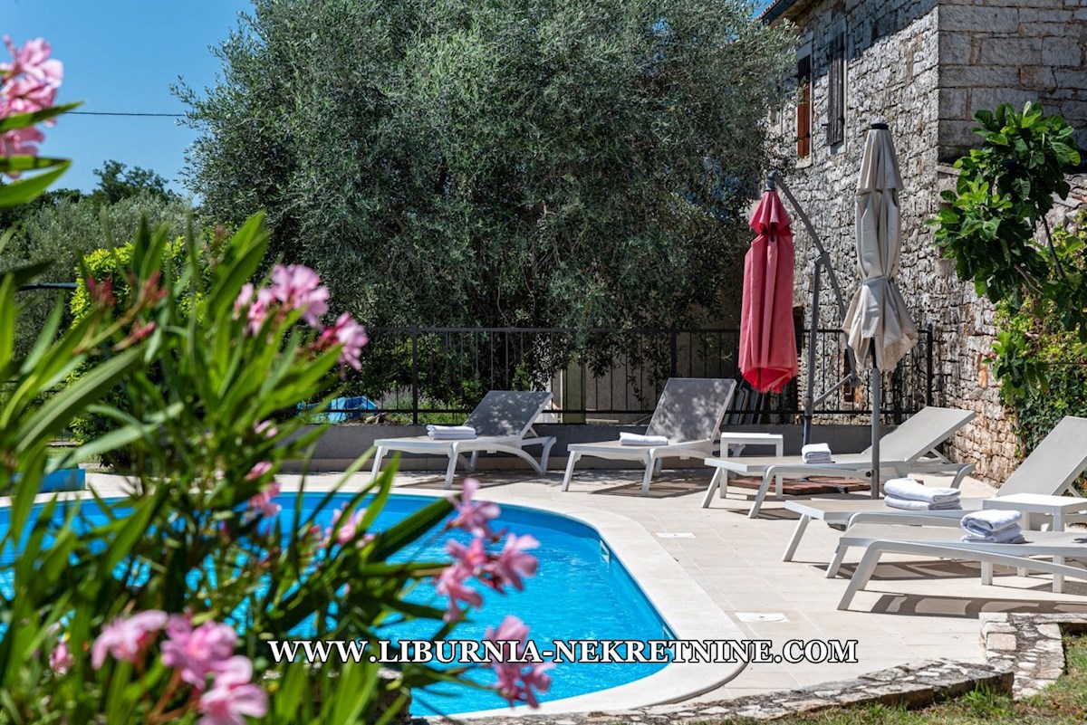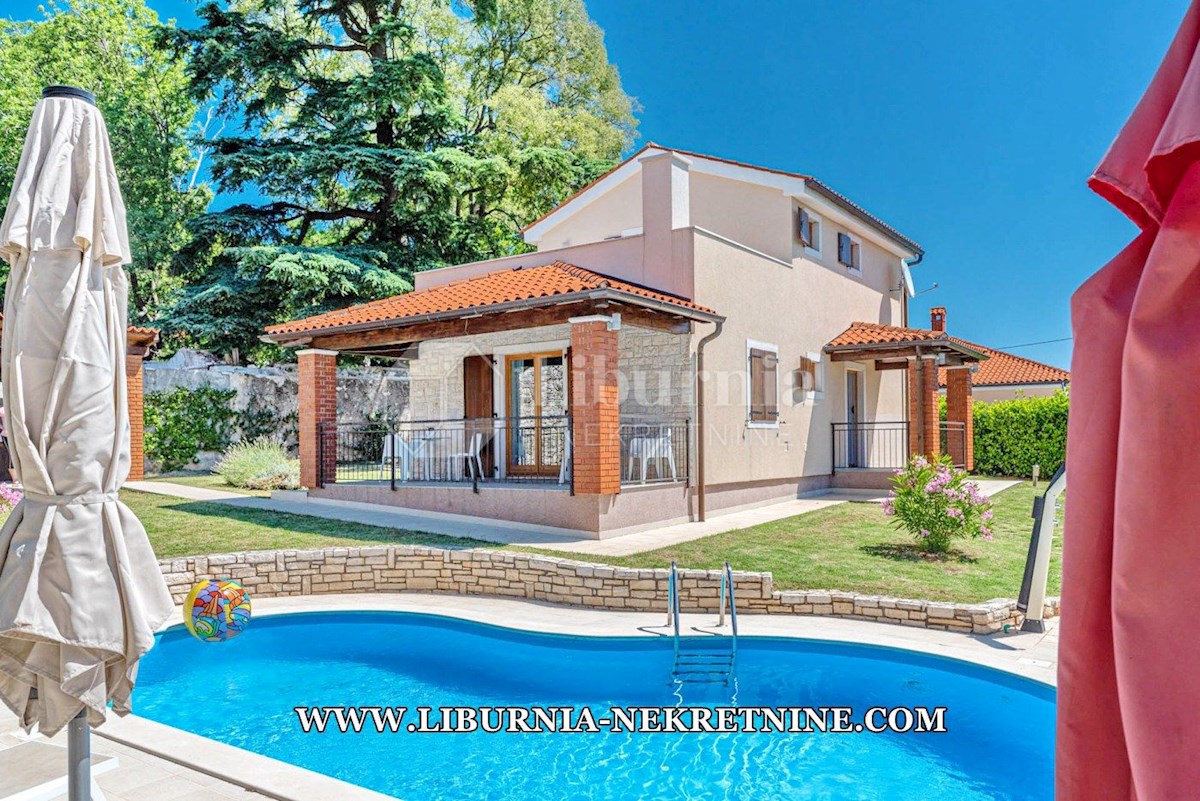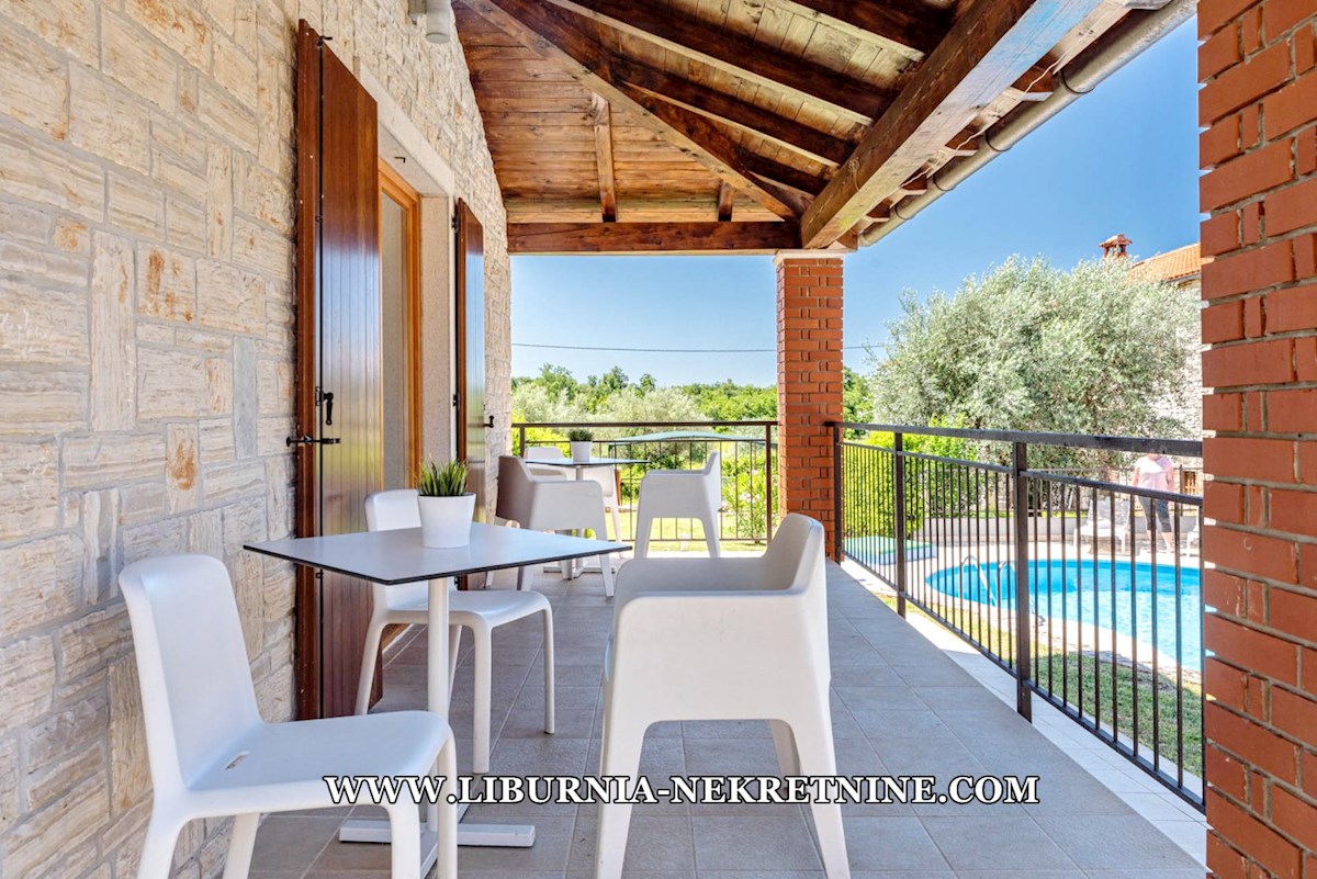 Poreč, šira okolica. Samostojeća kuća stambene površine 150 m2, sagrađena na parceli površine 768 m2, sastoji se od: -Prizemlje: dnevni boravak s kuhinjom i blagovaonicom, spavaća soba,gostinjski toalet, natkrivena terasa sa izlazom na okućnicu. -Kat: d
