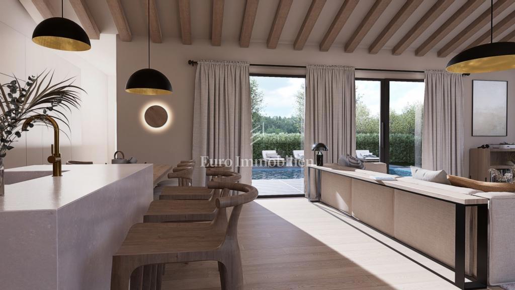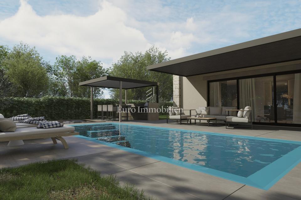 Prizemnica površine 150 m2 na parceli od 735 m2 s bazenom modernog dizajna, udaljena oko 5 km od Poreča i mora. Sastoji se od hodnika, dnevnog boravka, kuhinje, blagovaone, 3 spavaće sobe, 3 kupatila, wc-a i spremišta - u dvorištu se nalazi bazen, sunčali