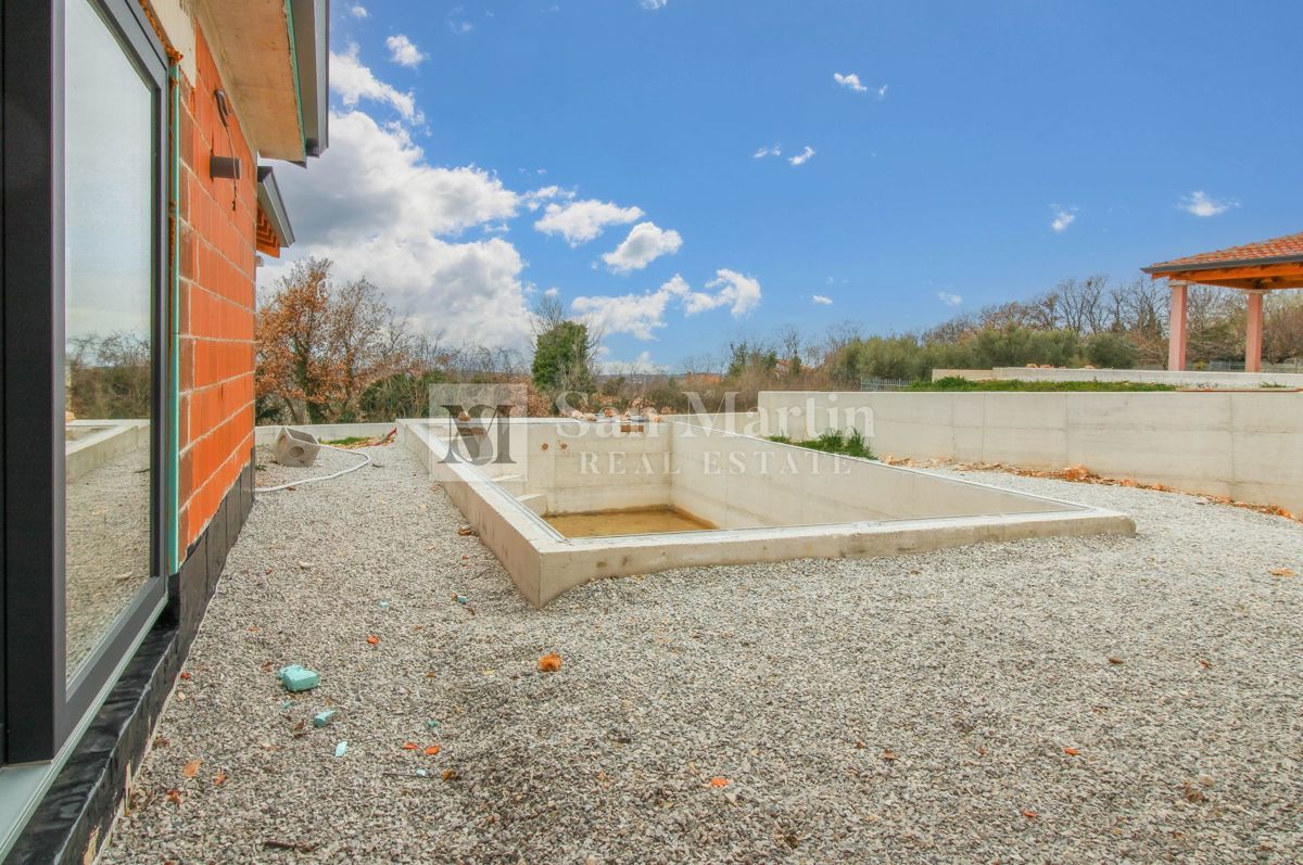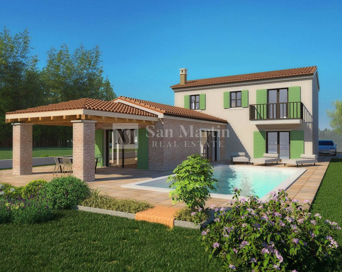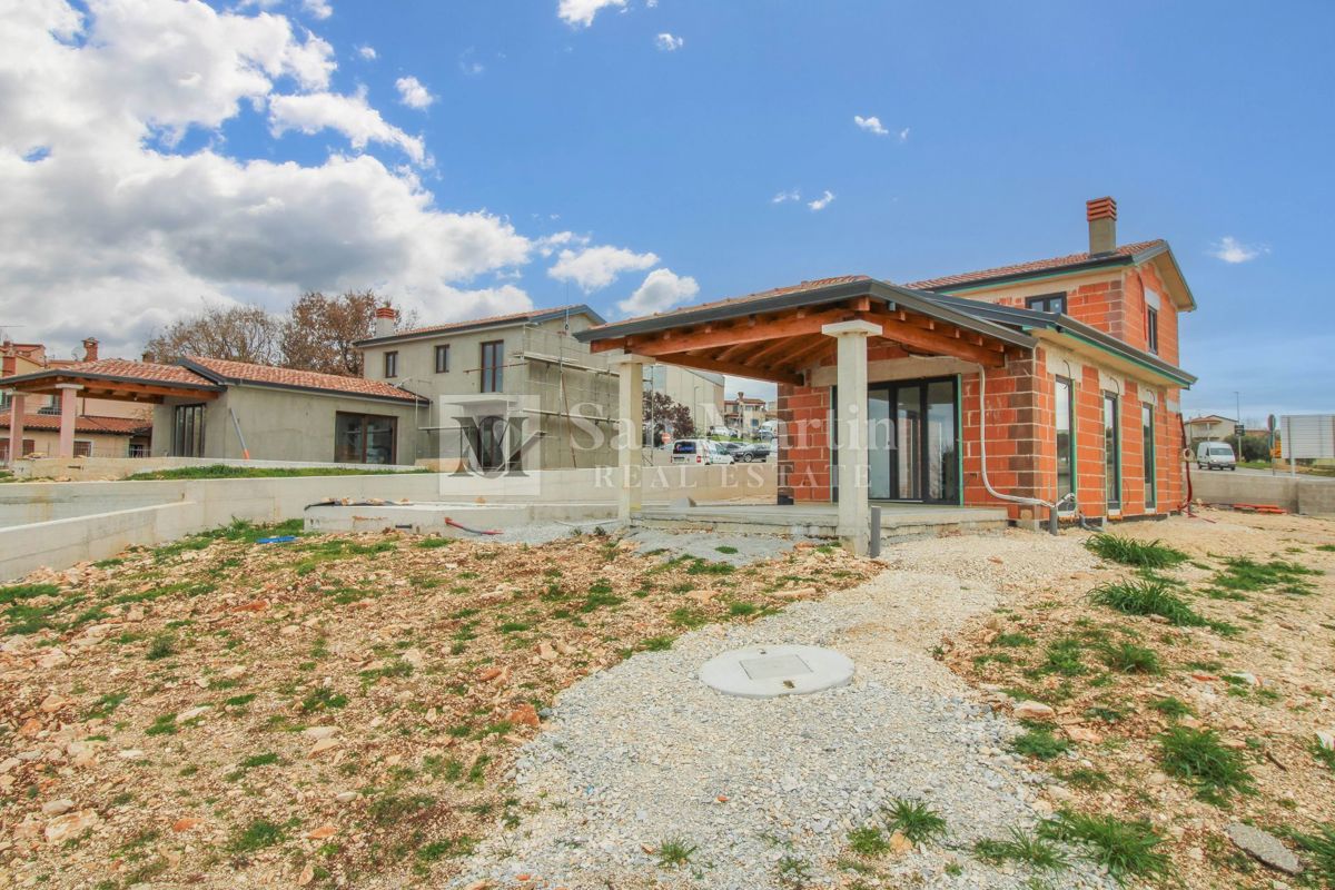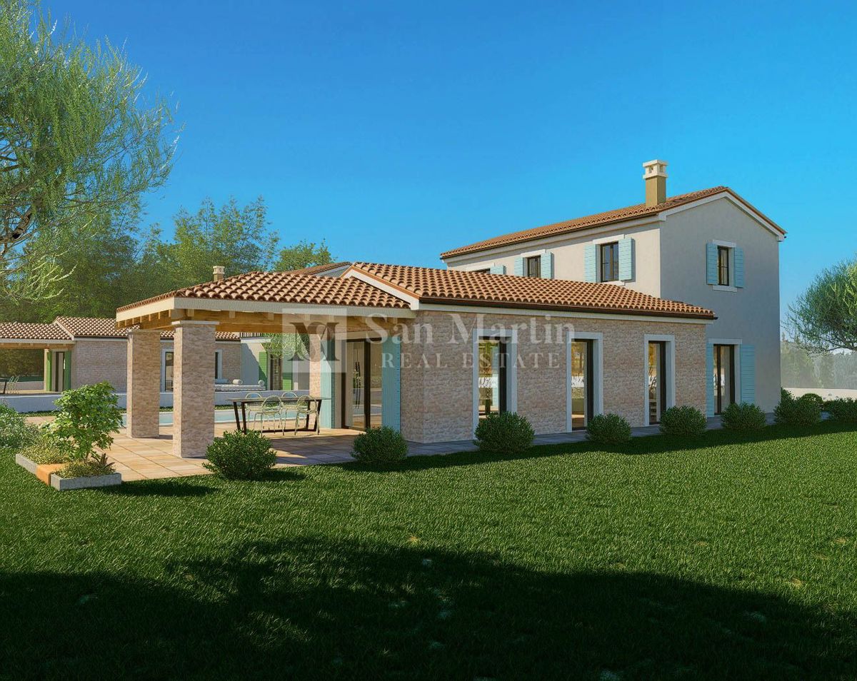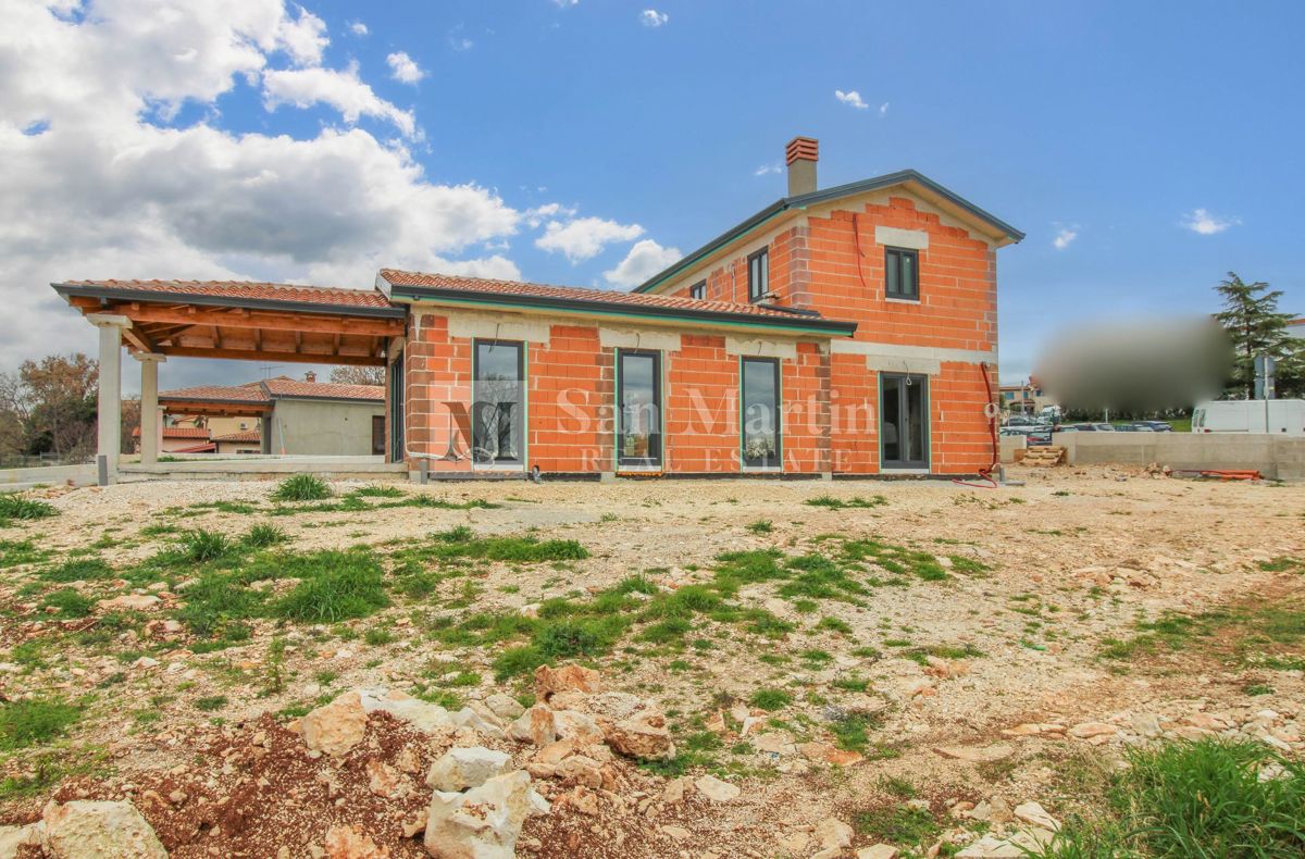 Poreč, okolica - odlična novogradnja sa prekrasnim pogledom. U okolici grada Poreča prodaje se odlična novogradnja sa prostranom okućnicom i prekrasnim pogledom. U blizini nekretnine nalaze se pošta, škola, igralište, šetnice okružene šumovitim krajem a