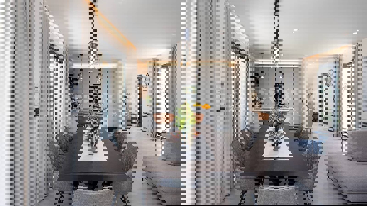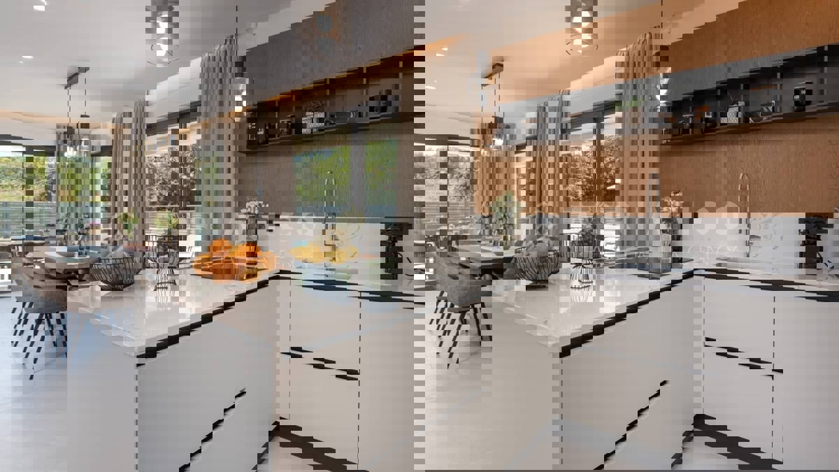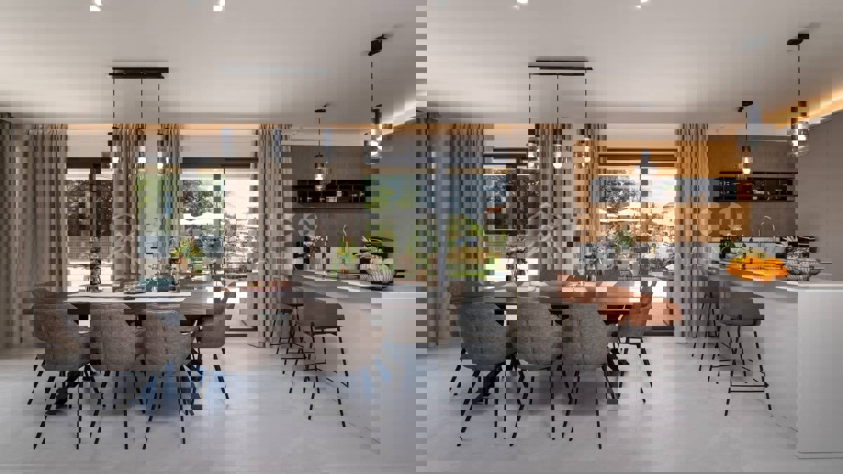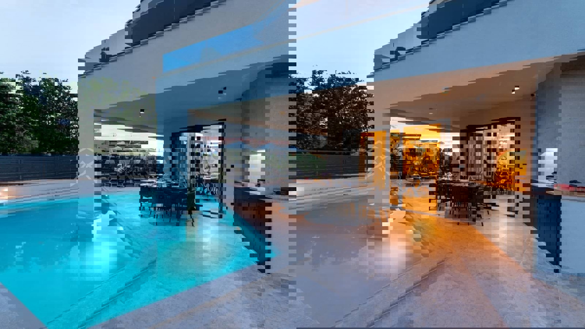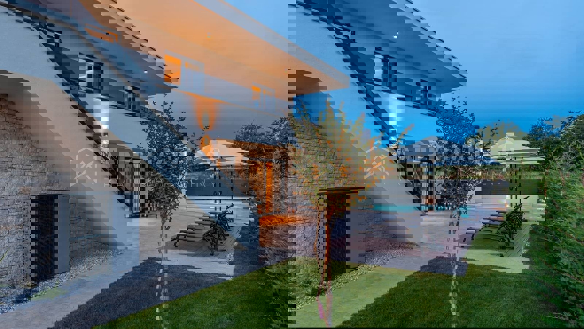Moderna vila s bazenom i panoramskim pogledom na more – 5 km od Poreča Predstavljamo vam elegantnu i moderno uređenu vilu, smještenu u mirnom naselju, samo 5 km od Poreča i prvih plaža. Ova luksuzna kuća površine 220 m² nudi vrhunski komfor i privatnost,