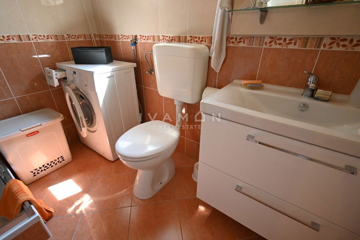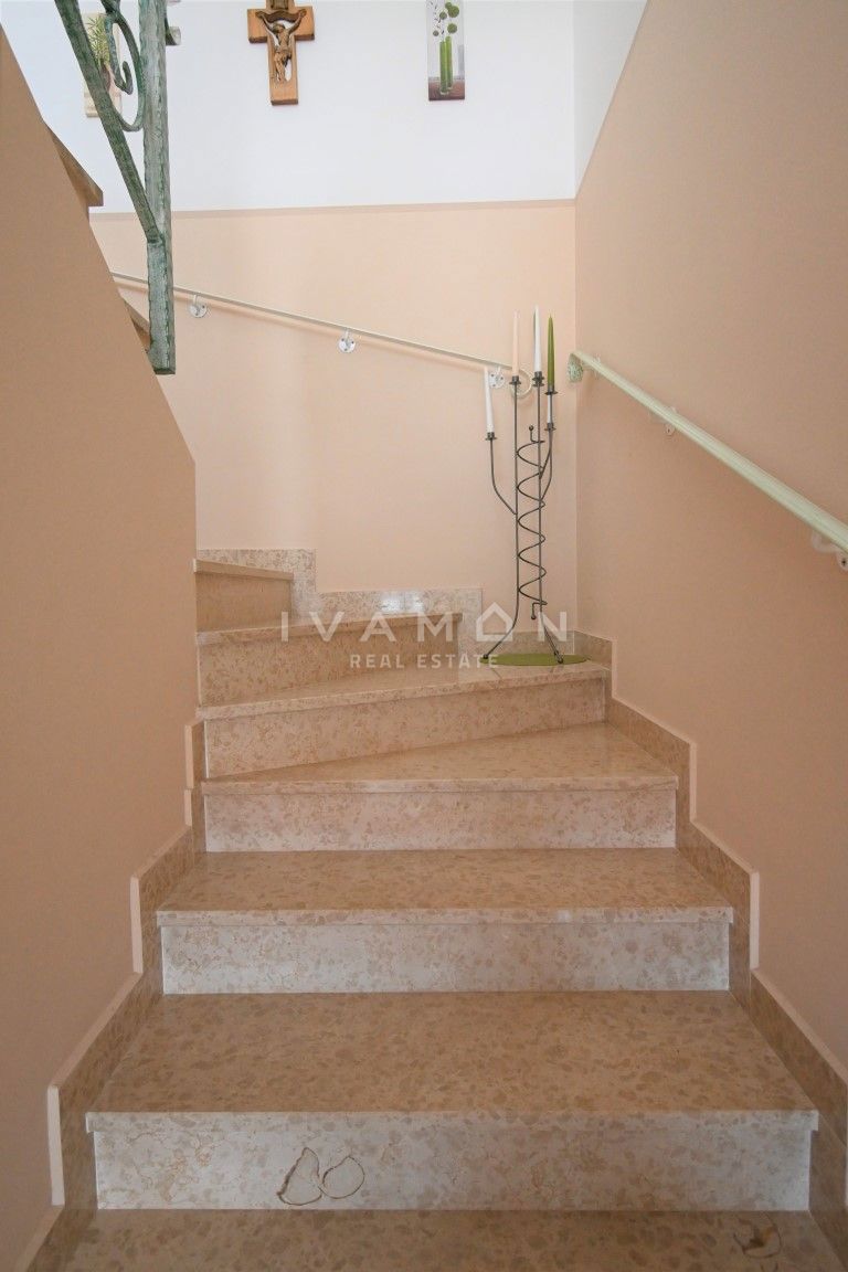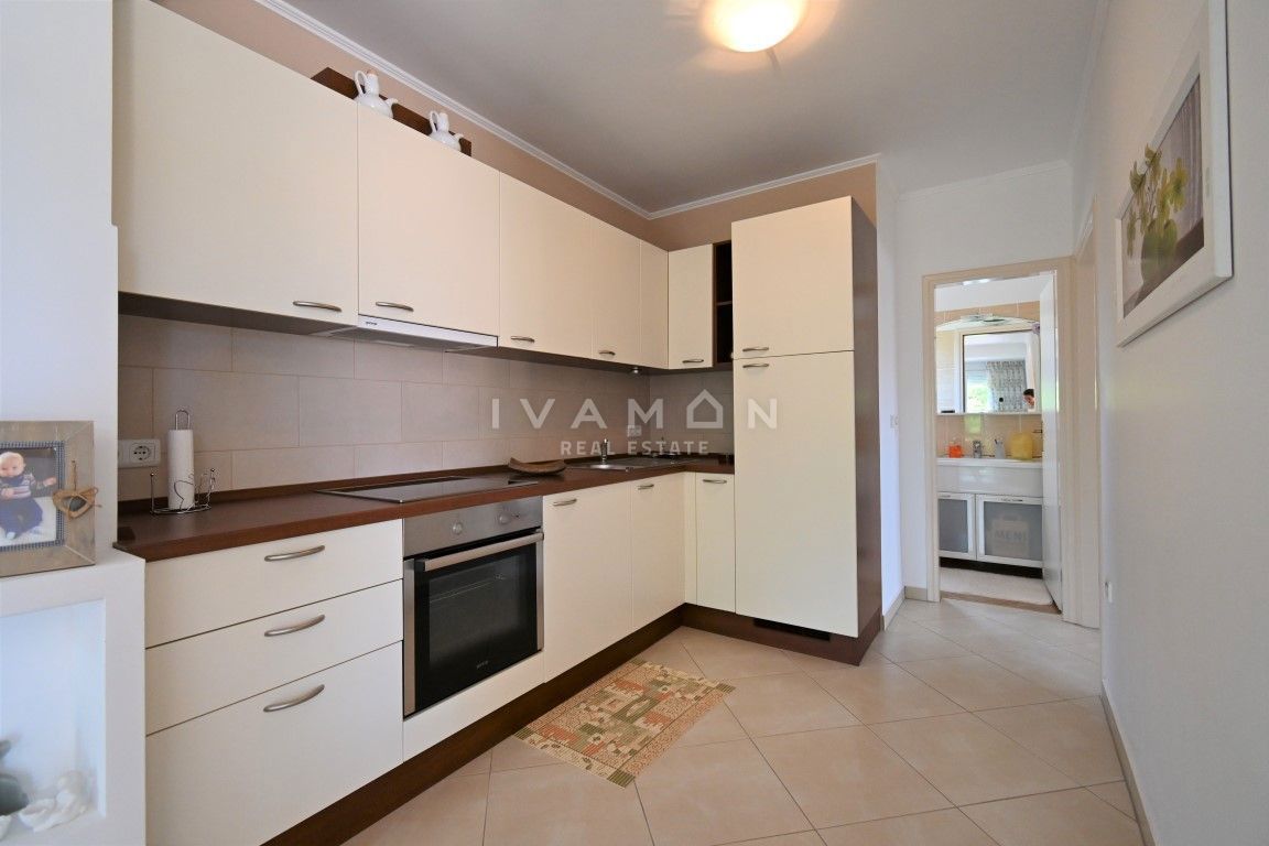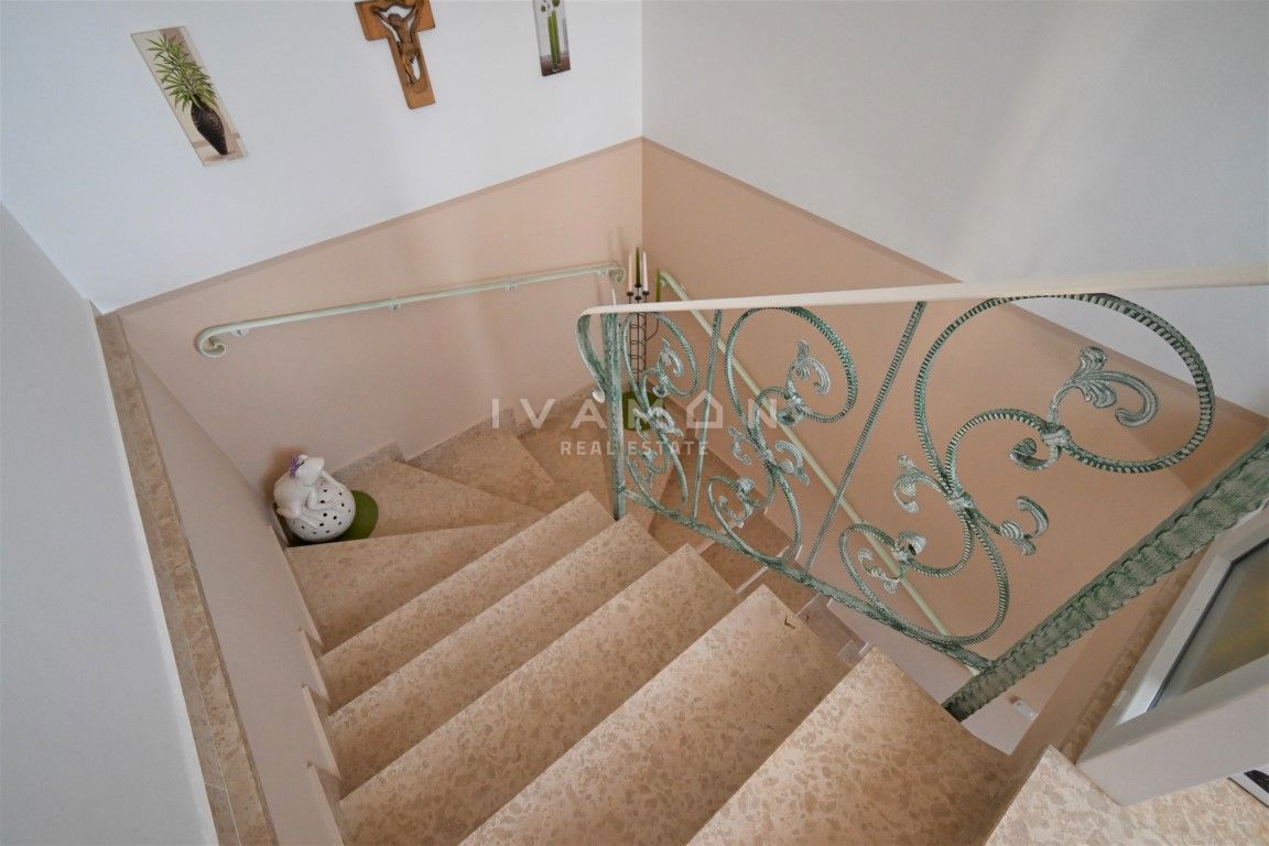U mjestu udaljenom 3 km od centra Poreča i 2 km od plaže prodaje se lijepa i dobro održavana kuća s pogledom na more. Kuća je dvojna, no ima vlastiti ulaz te apsolutnu privatnost od pogleda i susjeda. Ima sveukupno 133 m2 raspoređenih na prizemlje i ka