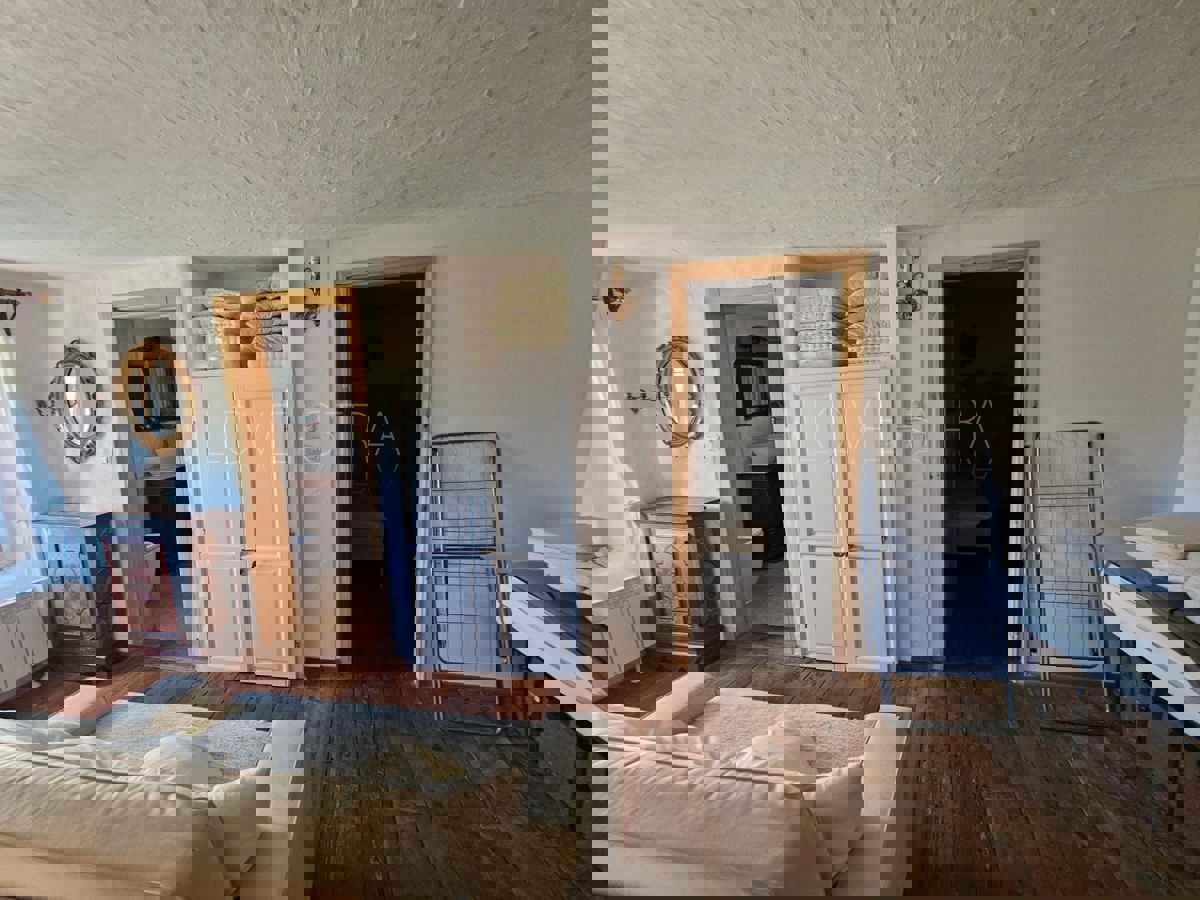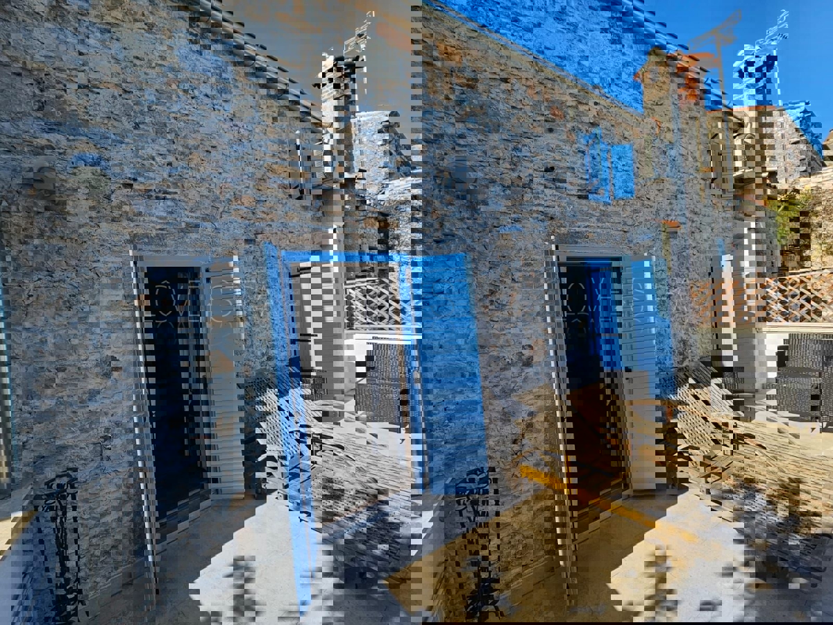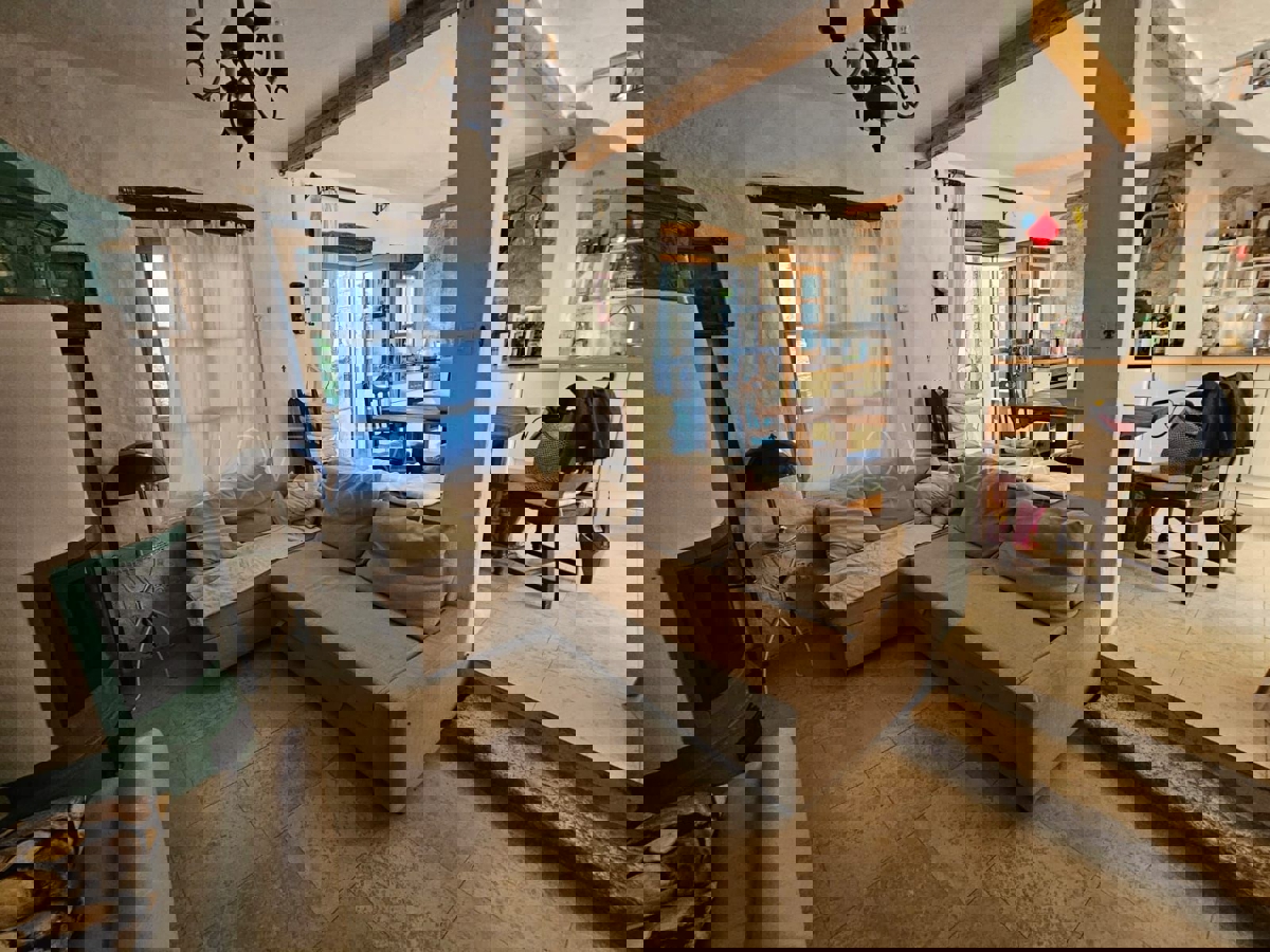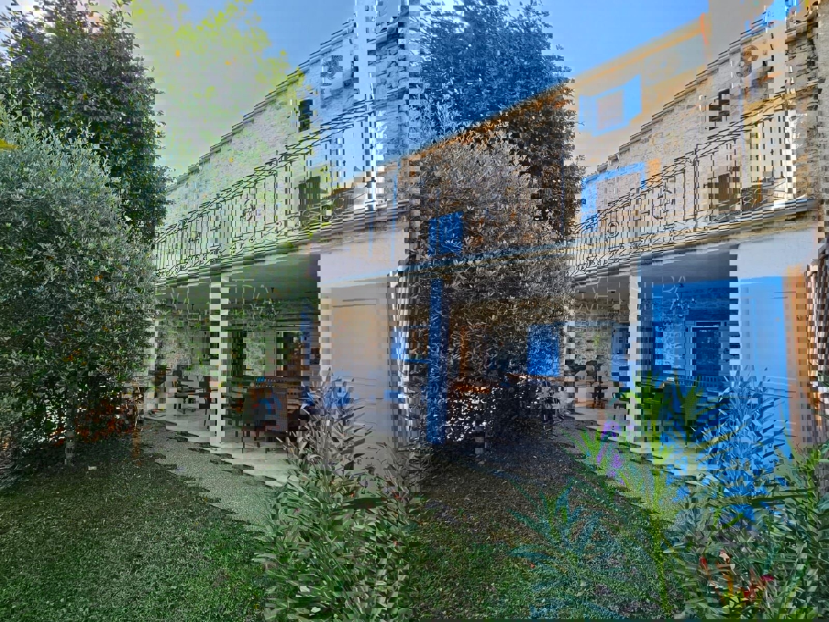 Na samo 3 km od grada i mora smjestila se ova prekrasno uređena kamena kuća u nizu ukupne stambene površine 128 m2.Kuća je raspoređena na tri etaže od kojih se u prizemlju nalazi kuhinja s blagavaonicom, dnevni boravak , kupatilo, spremište i loggia.Na pr