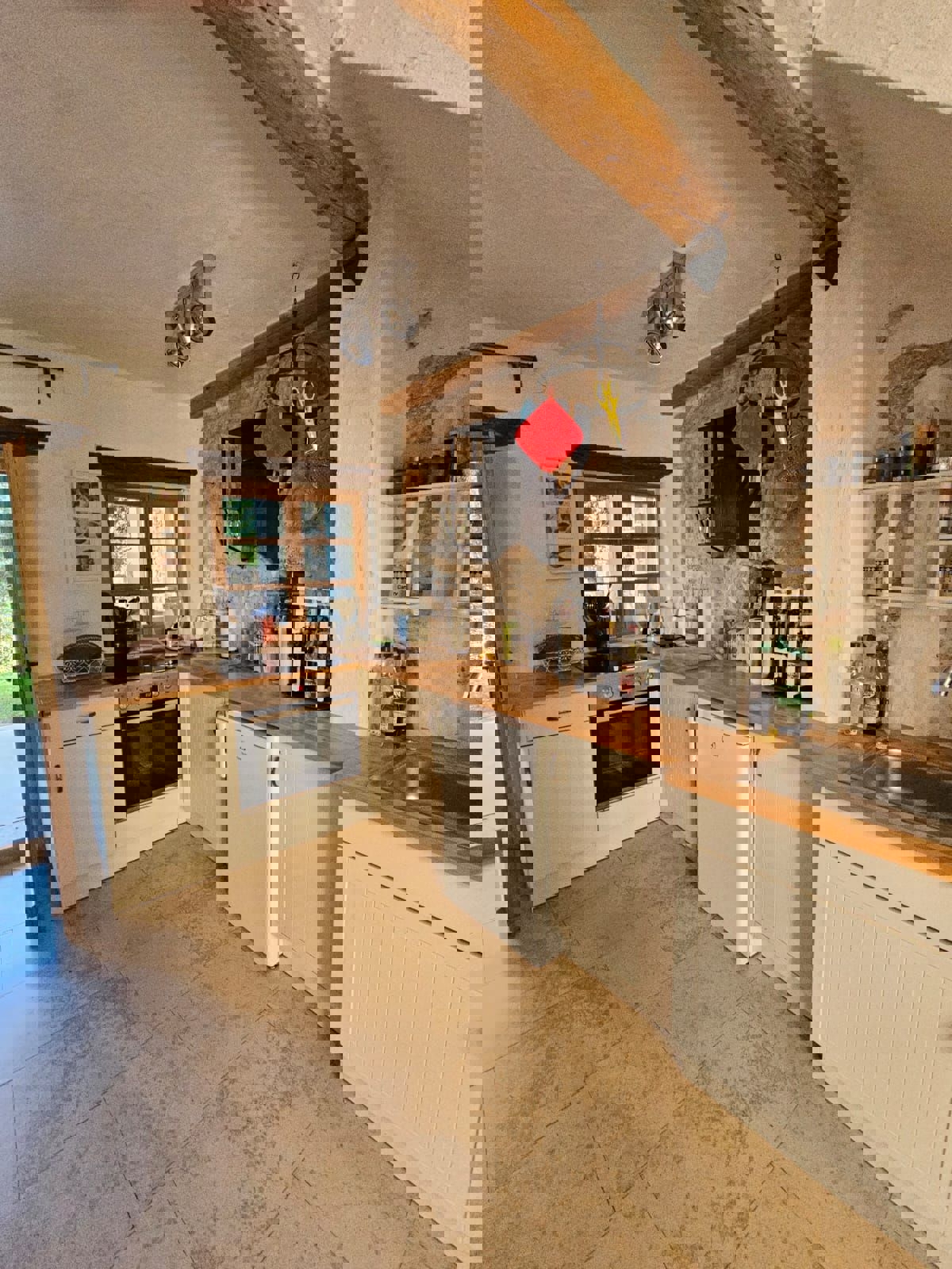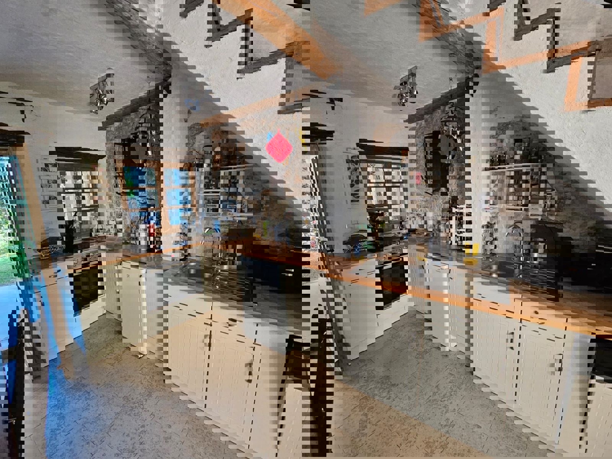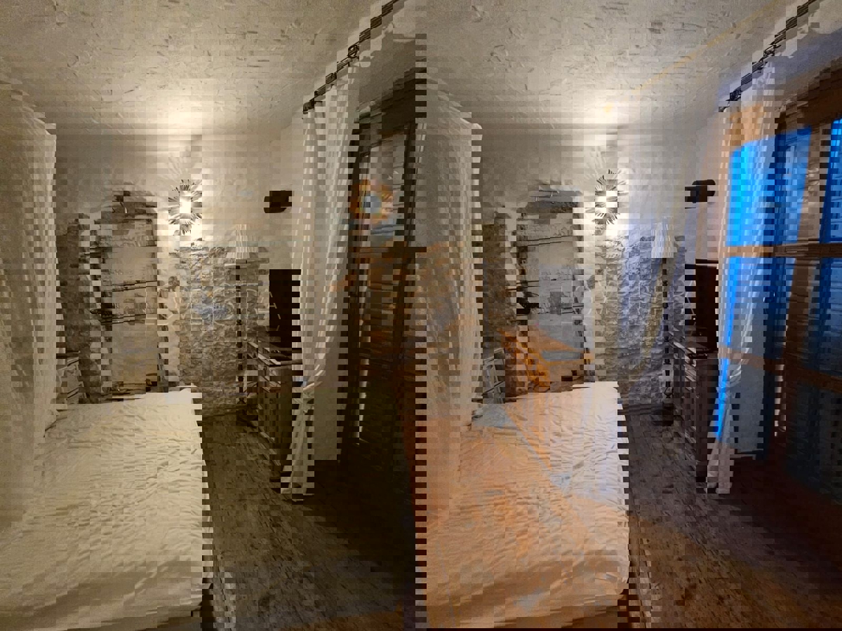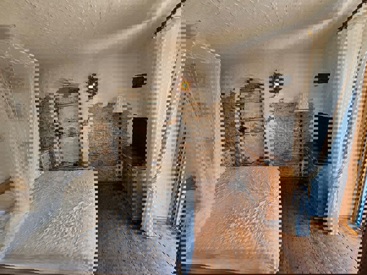 Na samo 3 km od grada i mora smjestila se ova prekrasno uređena kamena kuća u nizu ukupne stambene površine 128 m2.Kuća je raspoređena na tri etaže od kojih se u prizemlju nalazi kuhinja s blagavaonicom, dnevni boravak , kupatilo, spremište i loggia.Na pr
