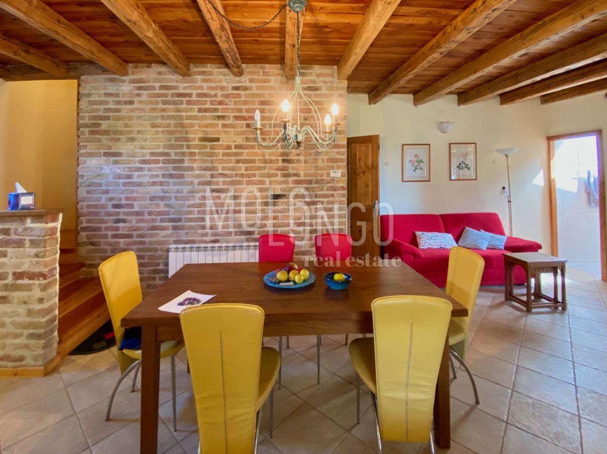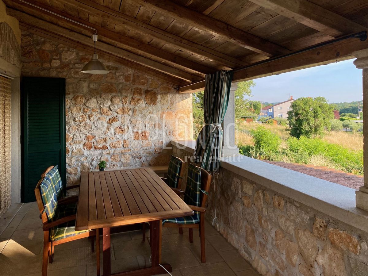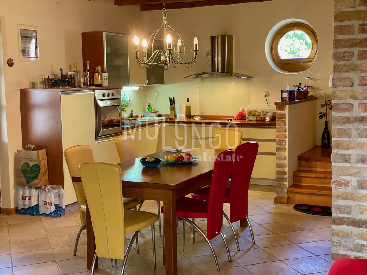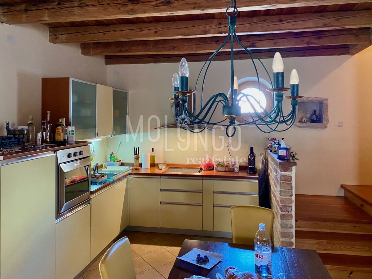 Samo 4 km od mora dobili smo u ponudu šarmantnu dvojnu kamenu kuću. Kuća je obnovljena prije par godina. Kuća se proteže na tri etaže. U prizemlju se nalazi dnevni boravak s kaminom, prostrana kuhinja i blagovaonica, sanitarni čvor, dok se iz dnevnog bor