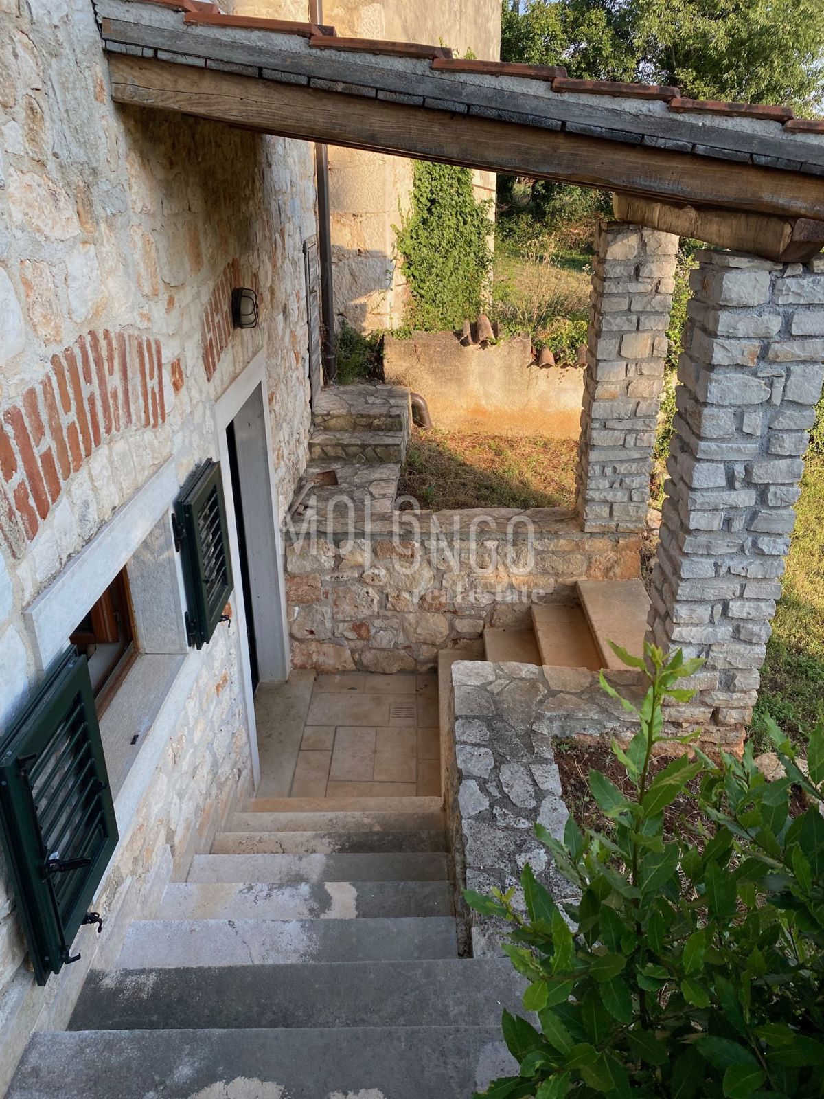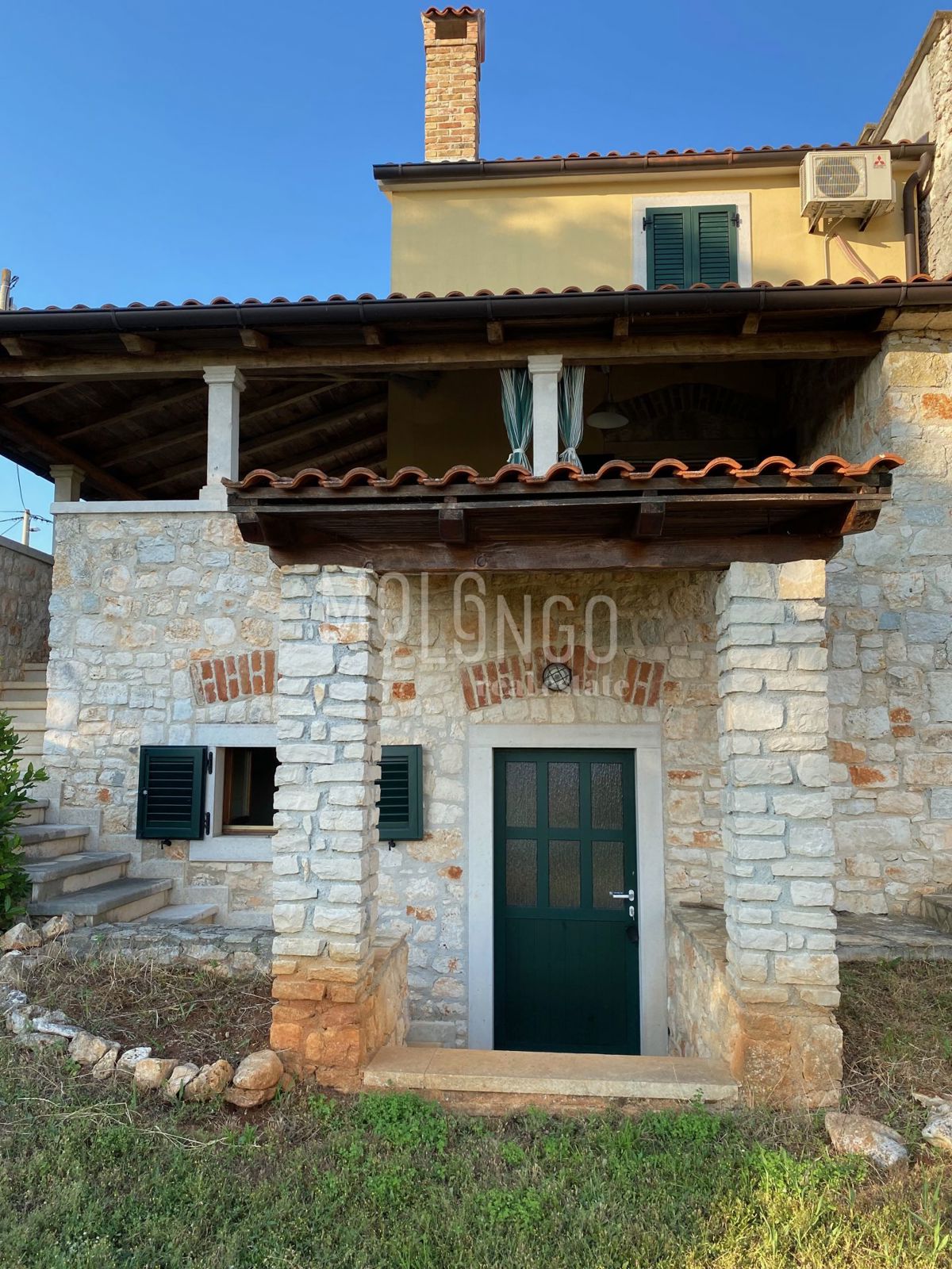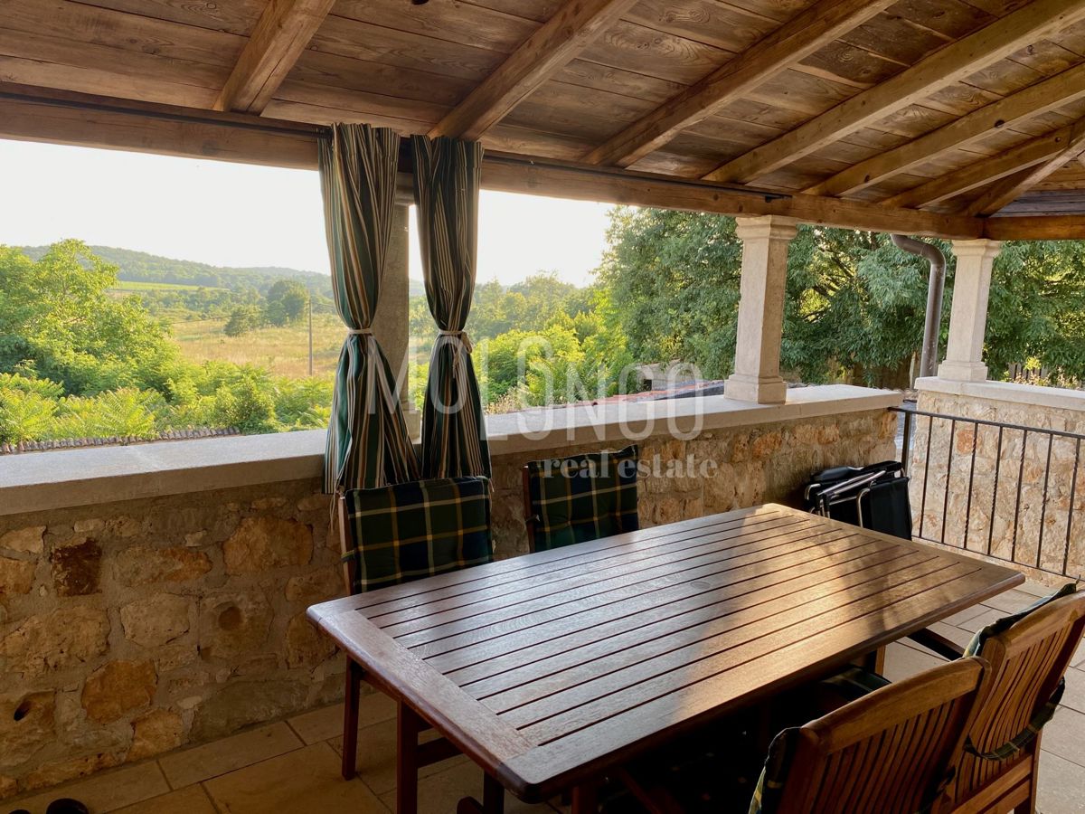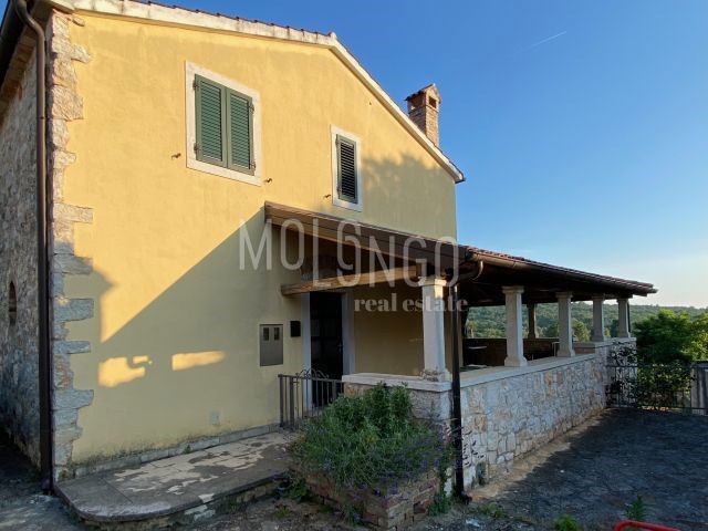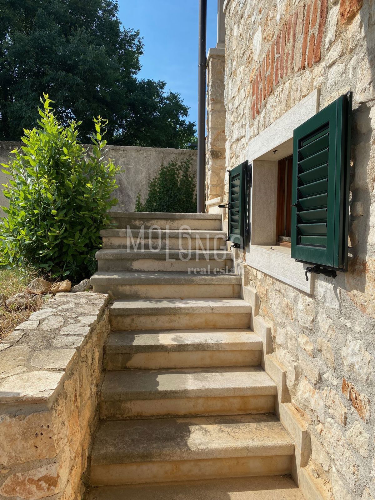 Samo 4 km od mora dobili smo u ponudu šarmantnu dvojnu kamenu kuću. Kuća je obnovljena prije par godina. Kuća se proteže na tri etaže. U prizemlju se nalazi dnevni boravak s kaminom, prostrana kuhinja i blagovaonica, sanitarni čvor, dok se iz dnevnog bor