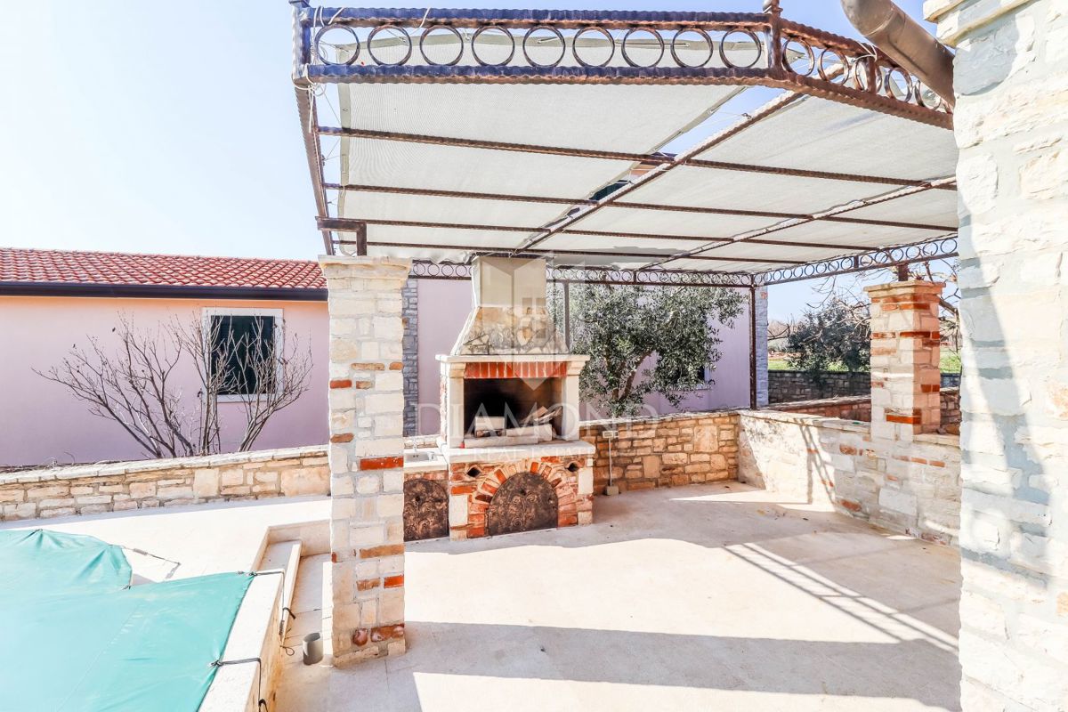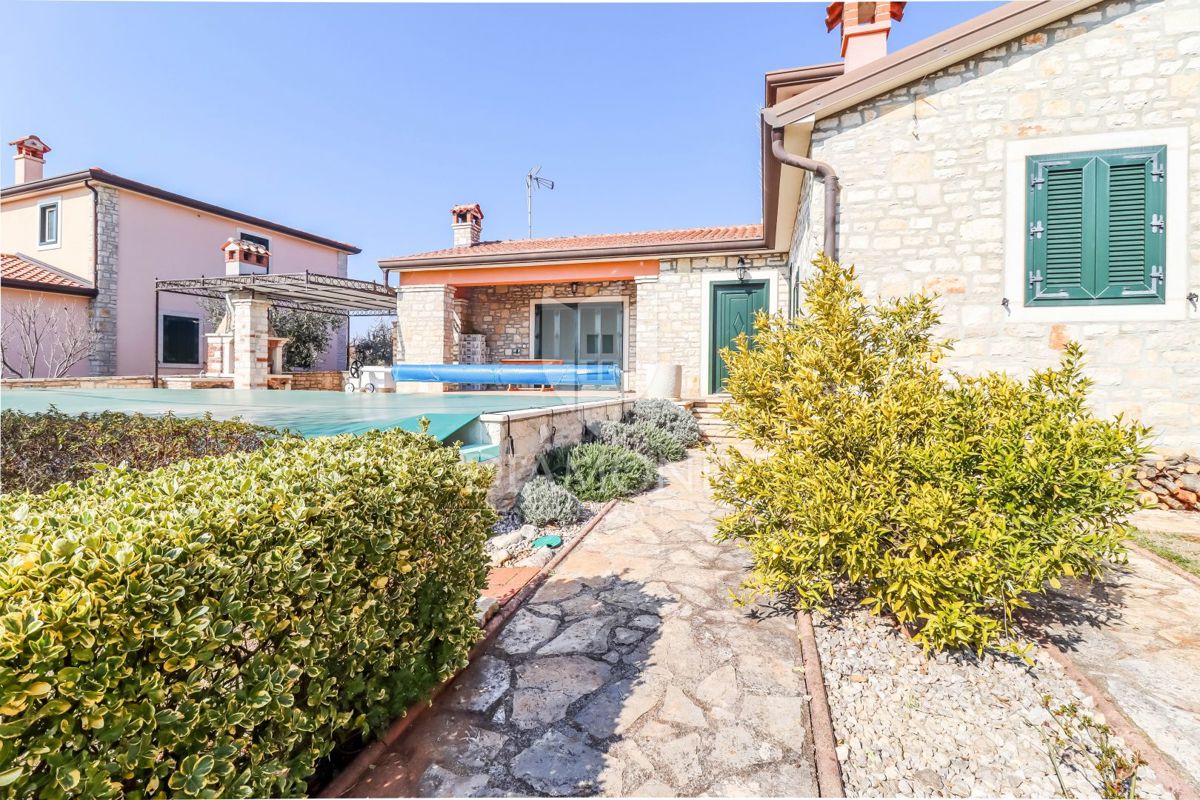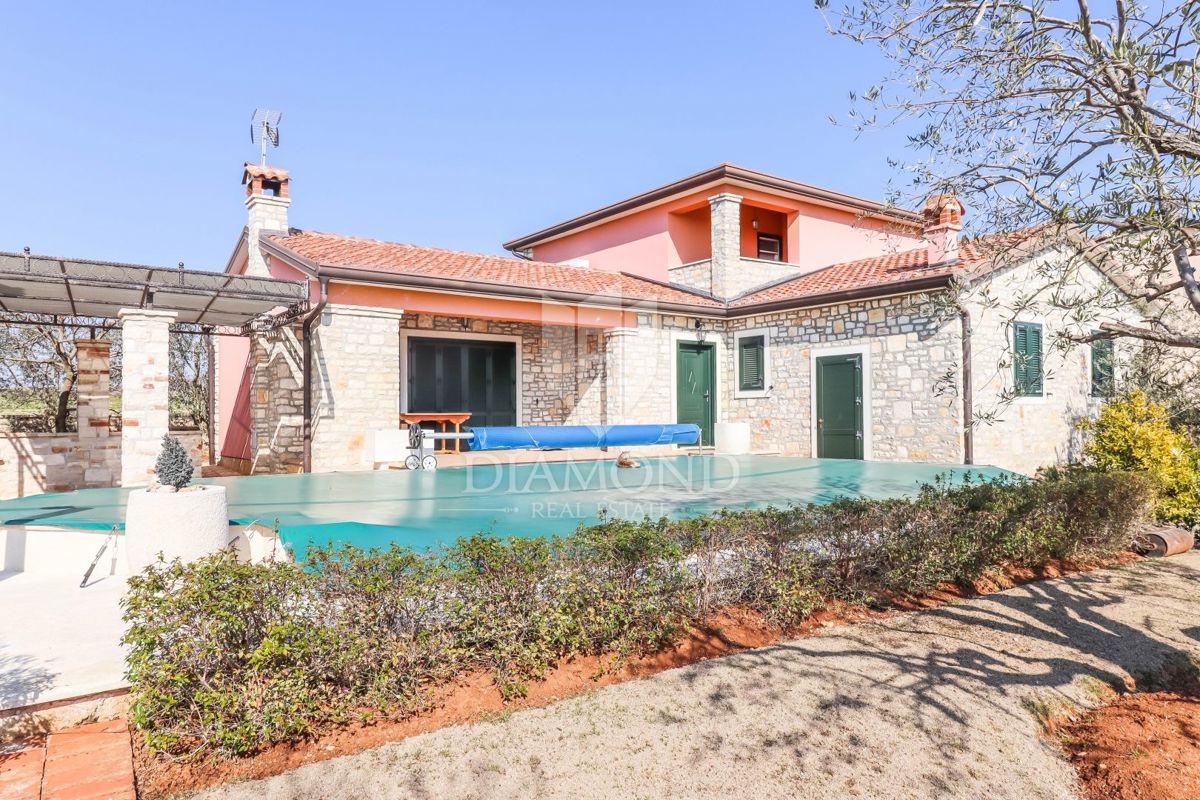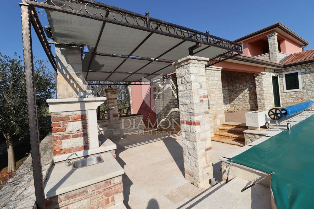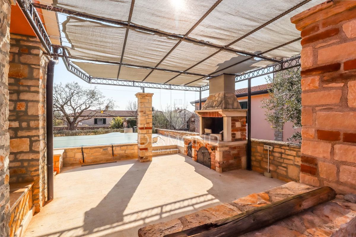Poreč, okolica Prodaje se kamena kuća sa bazenom u mirnom mjestu udaljenom od grada Poreča 8km i 5km od prvih plaža. Kuća se smjestila na zemljištu od 750m2 i njena površina iznosi 175m2. Kuća se prostire kroz dvije etaže. Prizemlje kuće sastoji se od