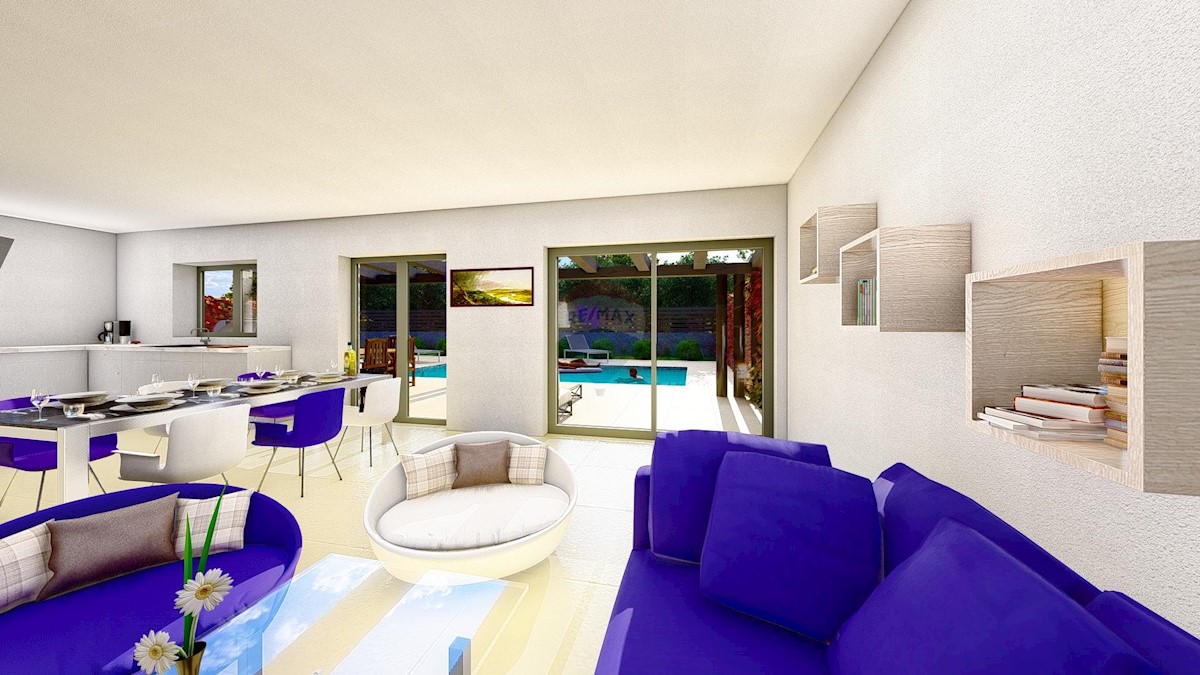 Prodaje se kuća u izgradnji u okolici Poreča, stambene površine 170 m2 i 350 m2 okućnice. Prizemlje se sastoji od ulaznog trijema, hodnika, dva spremišta, ostave, toaleta, kuhinje s blagovaonom, velikog dnevnog boravka s kaminom, izlazom na terasu. Na prv