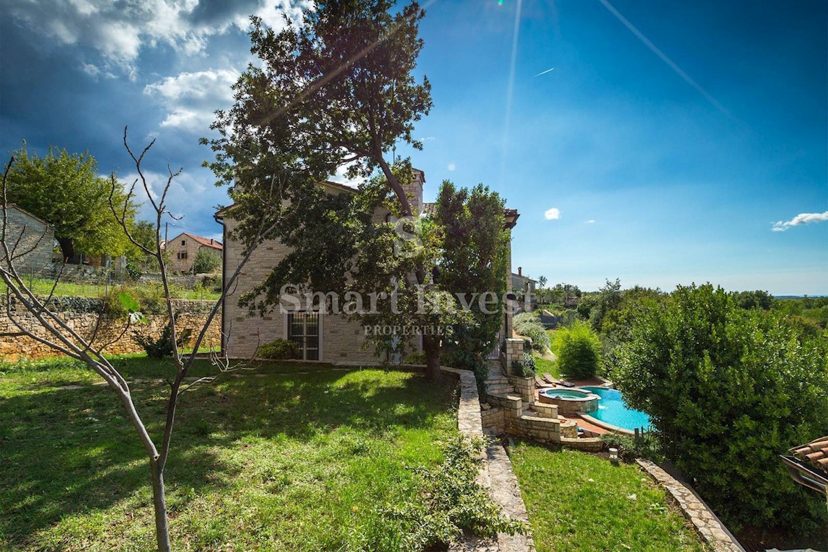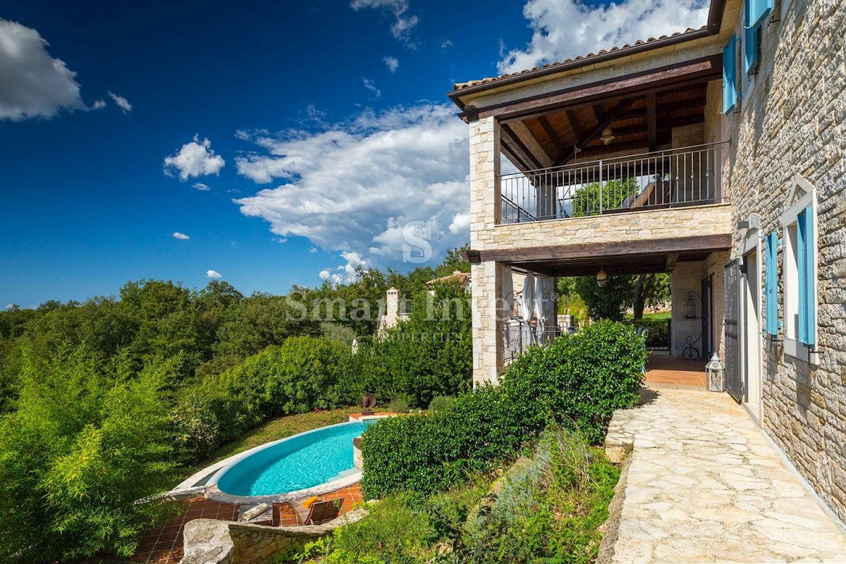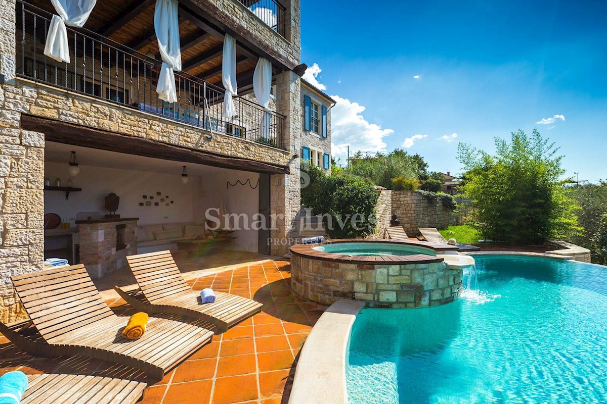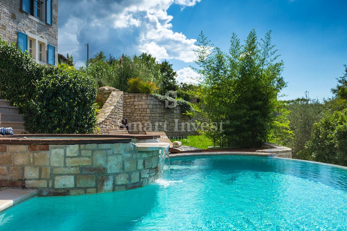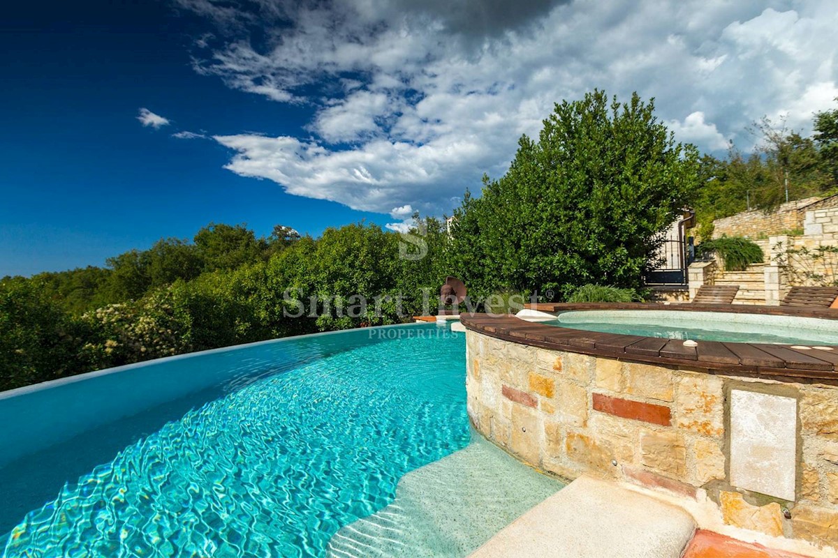 JEDINSTVENA KAMENA VILA S POGLEDOM NA MORE U SRCU ZELENE ISTRE Na prodaju je luksuzno opremljena kamena vila s grijanjim infinity bazenom i očaravajućim pogledom na more i zelenilom na iznimnoj lokaciji u malom Istarskom selu svega 20 minuta vožnje udalj