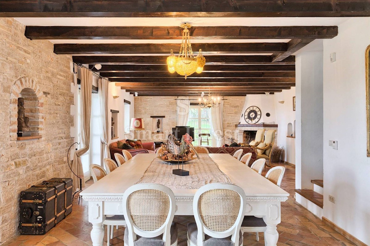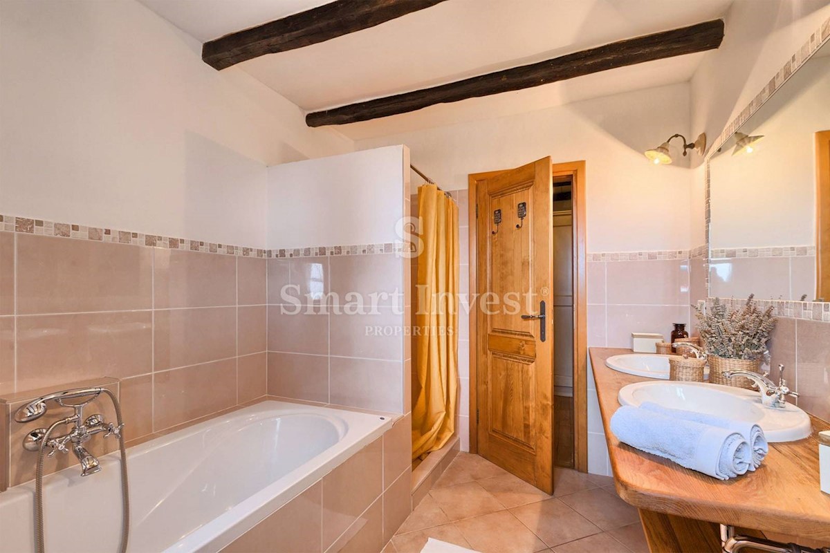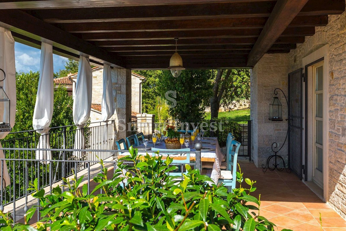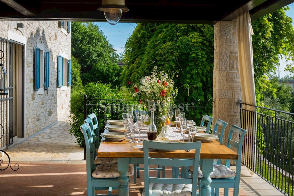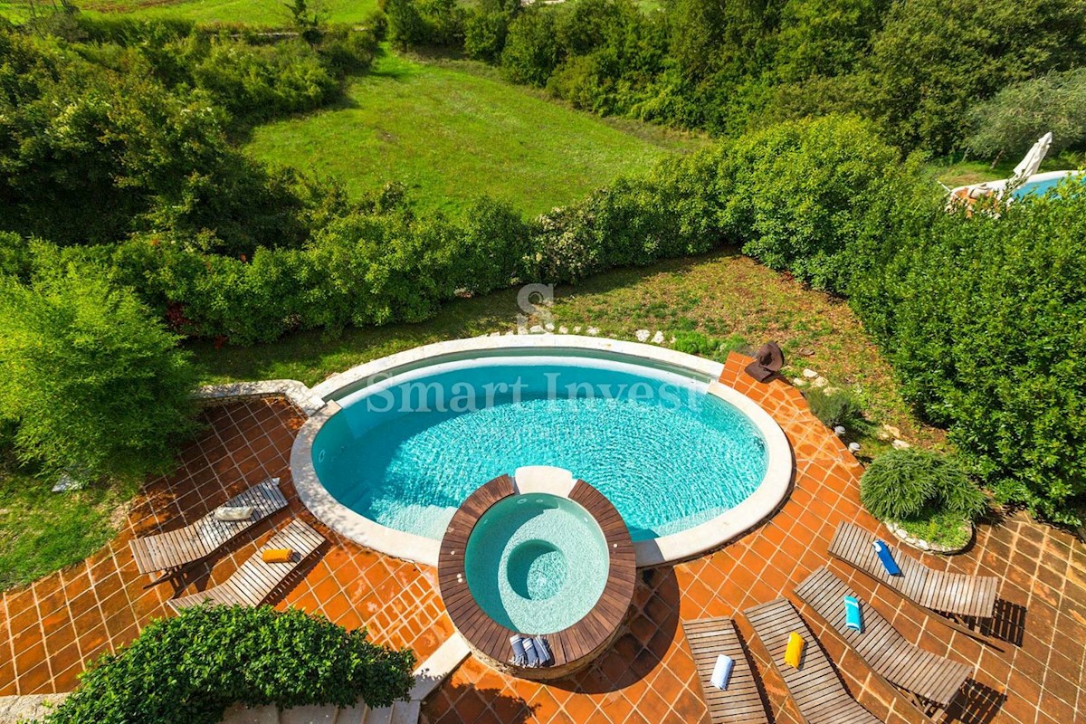 JEDINSTVENA KAMENA VILA S POGLEDOM NA MORE U SRCU ZELENE ISTRE Na prodaju je luksuzno opremljena kamena vila s grijanjim infinity bazenom i očaravajućim pogledom na more i zelenilom na iznimnoj lokaciji u malom Istarskom selu svega 20 minuta vožnje udalj