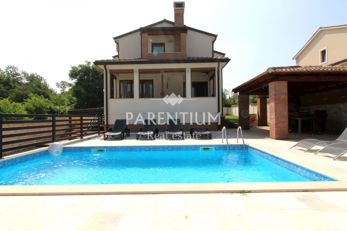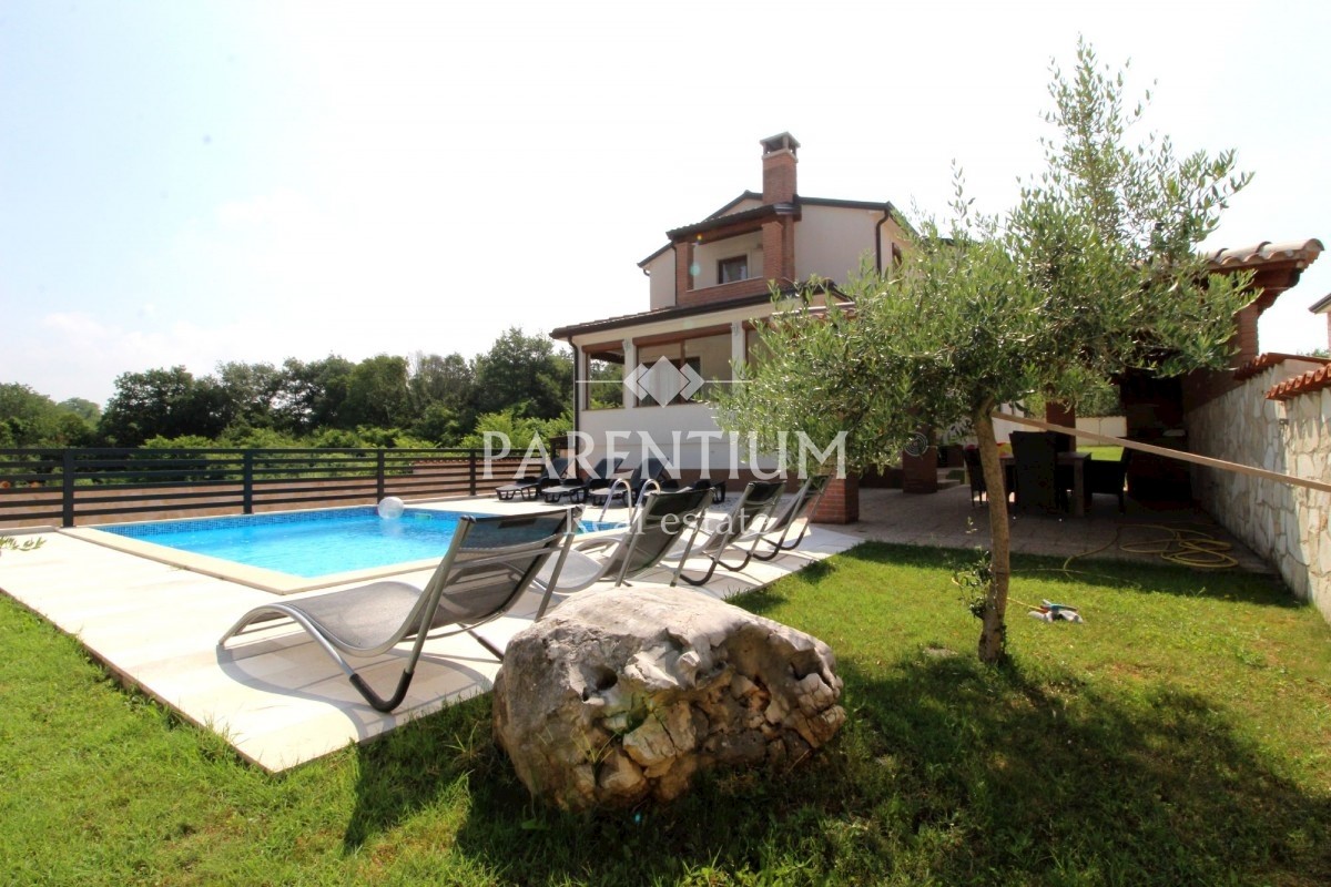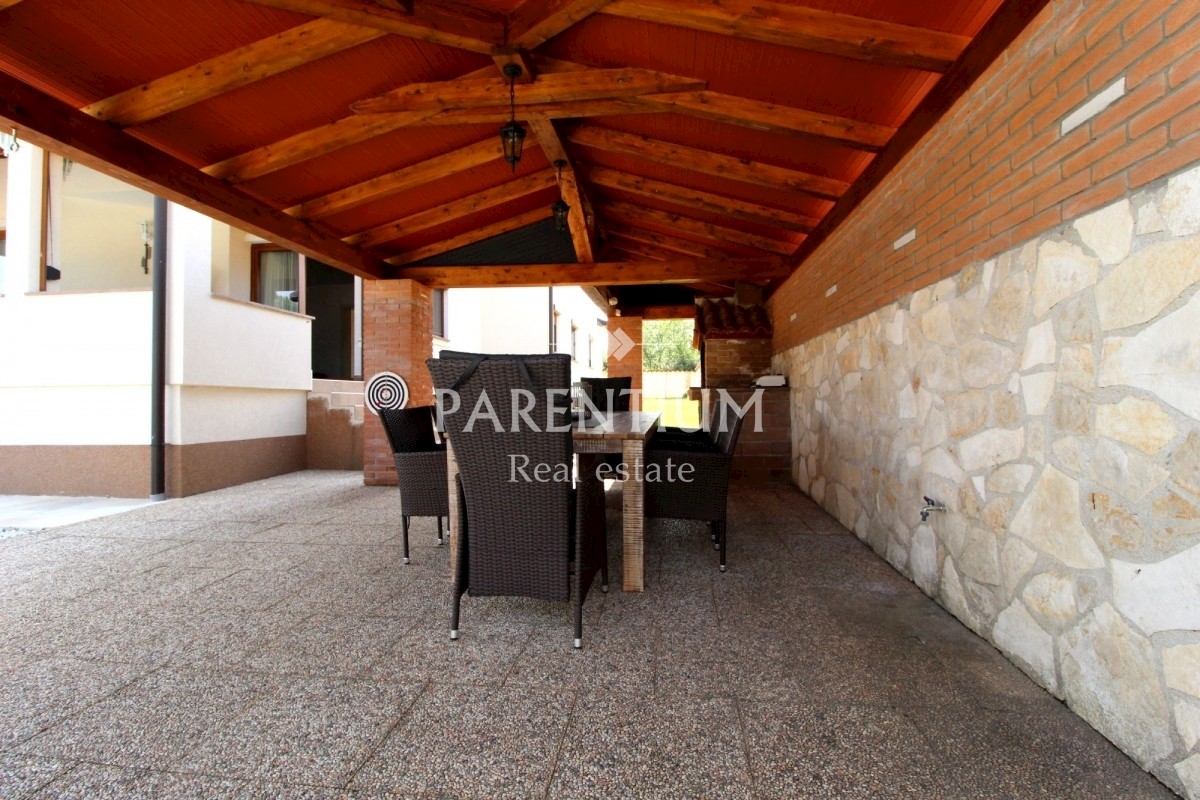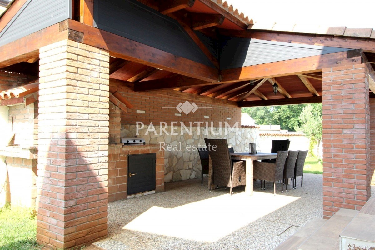 Istra, Poreč, Vežnaveri, Krasna obiteljska kuća sa bazenom na mirnoj lokaciji i uz sam rub šume. Kuća se nalazi na parceli od 655m2, okružena kamenim zidom i ogradom. Lijepo uređena okućnica, bazen veličine 24m2, pored toga vrtni kamin sa nadstrešnicom