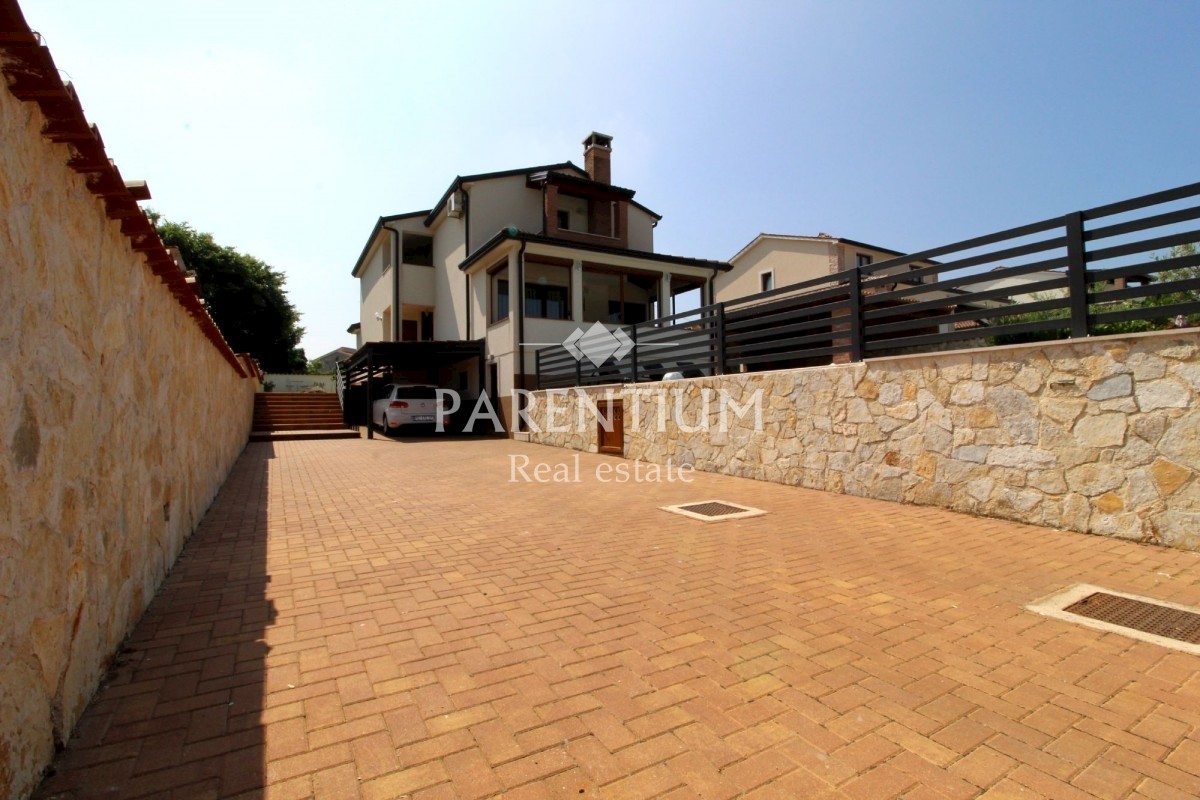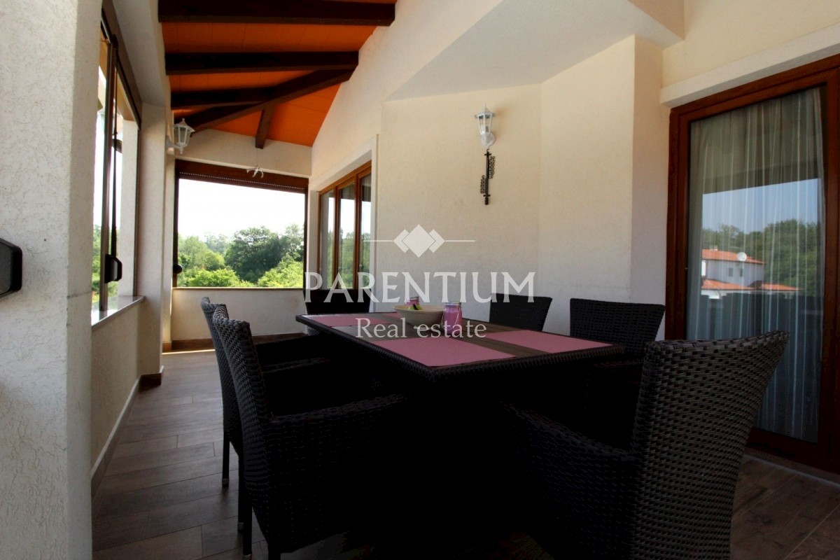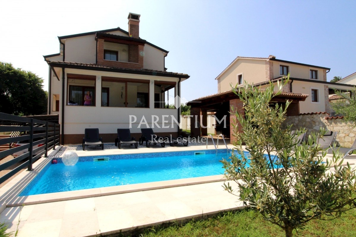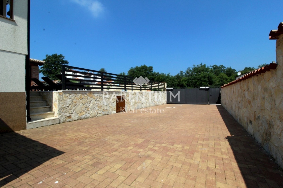 Istra, Poreč, Vežnaveri, Krasna obiteljska kuća sa bazenom na mirnoj lokaciji i uz sam rub šume. Kuća se nalazi na parceli od 655m2, okružena kamenim zidom i ogradom. Lijepo uređena okućnica, bazen veličine 24m2, pored toga vrtni kamin sa nadstrešnicom