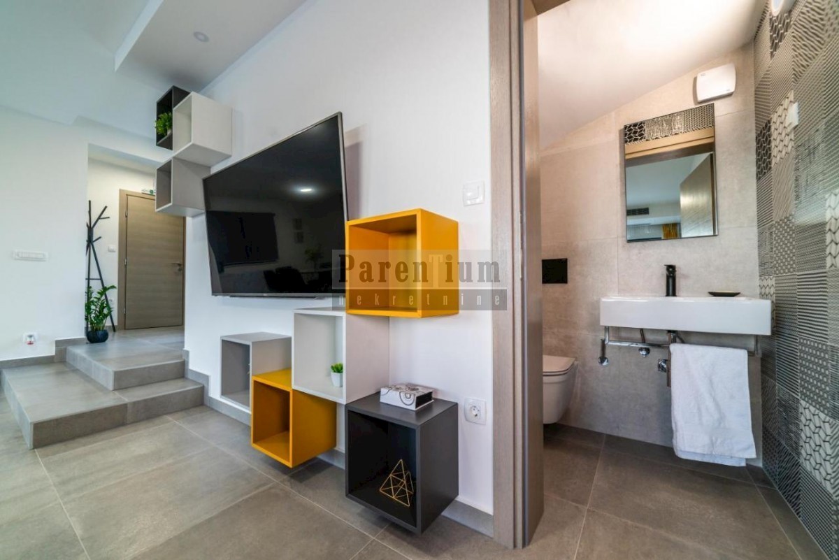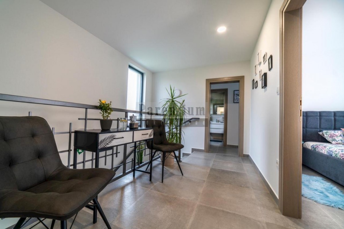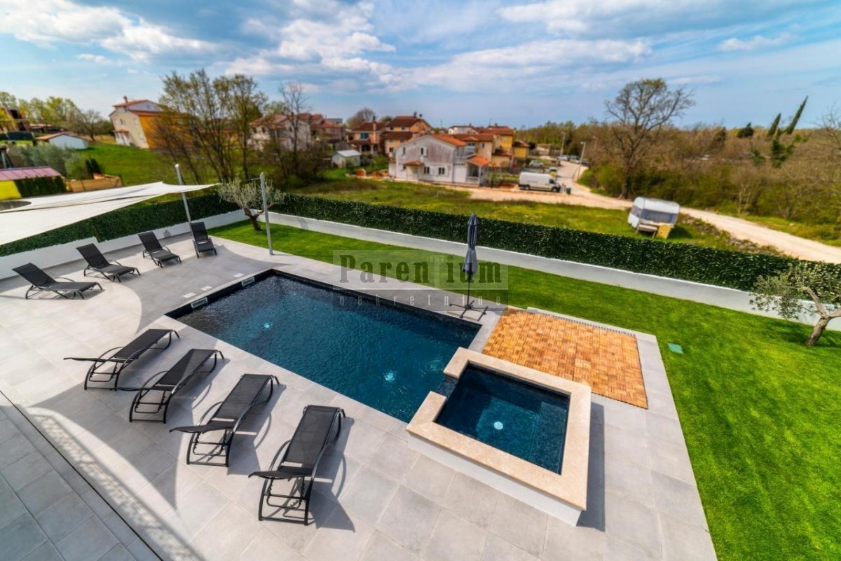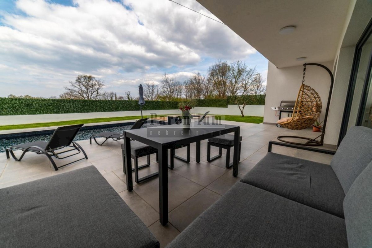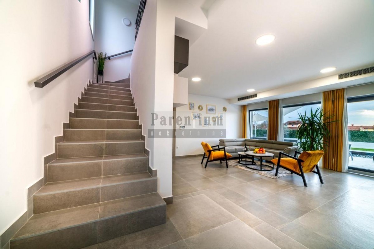 Istra, Poreč okolica, U prodaji je ova prekrasna moderna vila koja se nalazi u blizini grada Poreča. Ova novoizgrađena vila sa svojih 204 m2 korisne površine ( netto 168m2) smjestila se na zemljištu površine 592 m2. U prizemlju se nalazi prostrani op