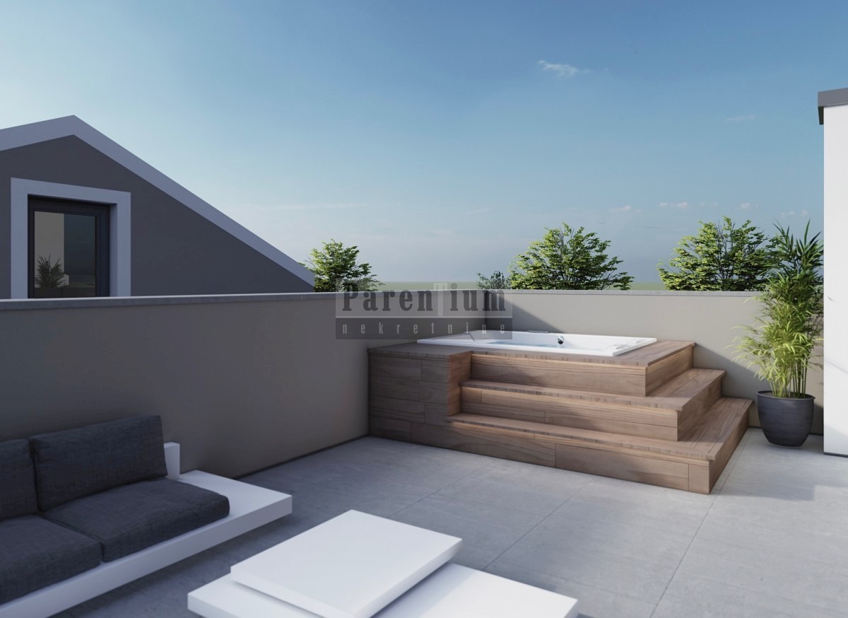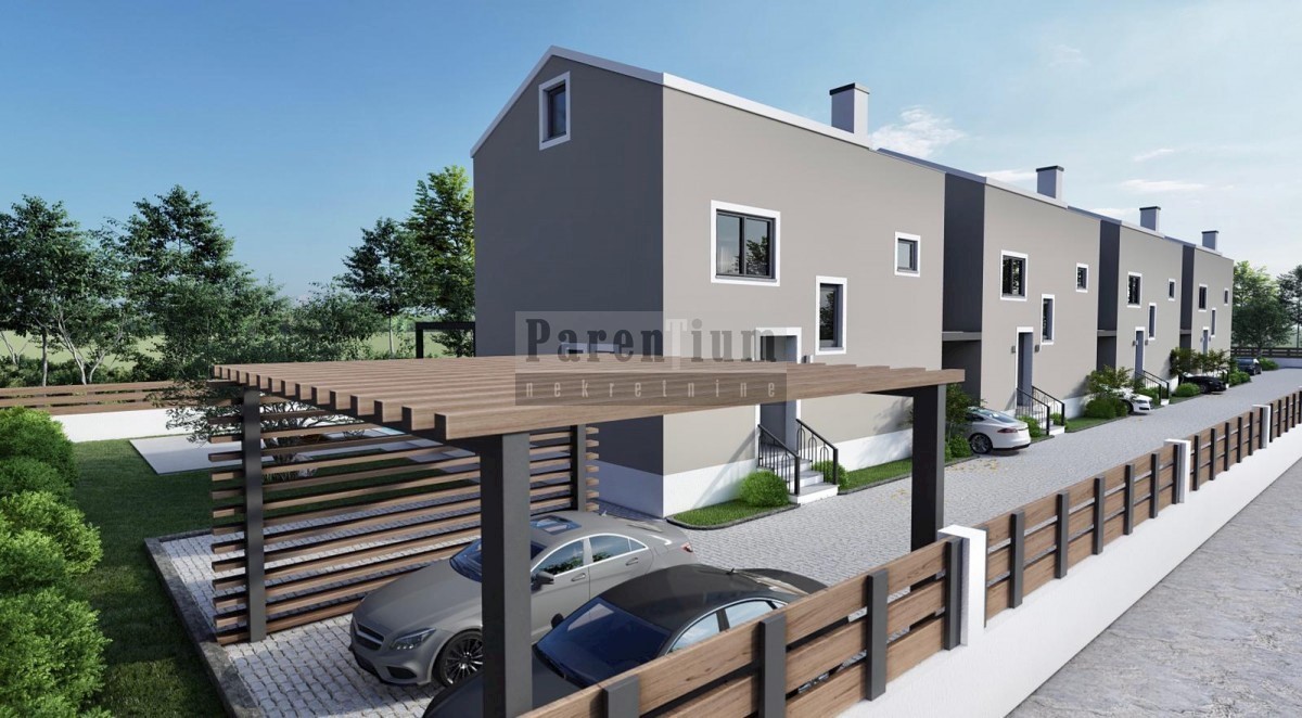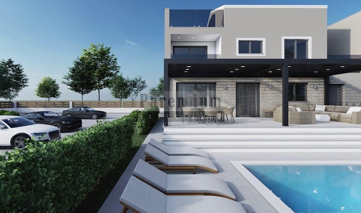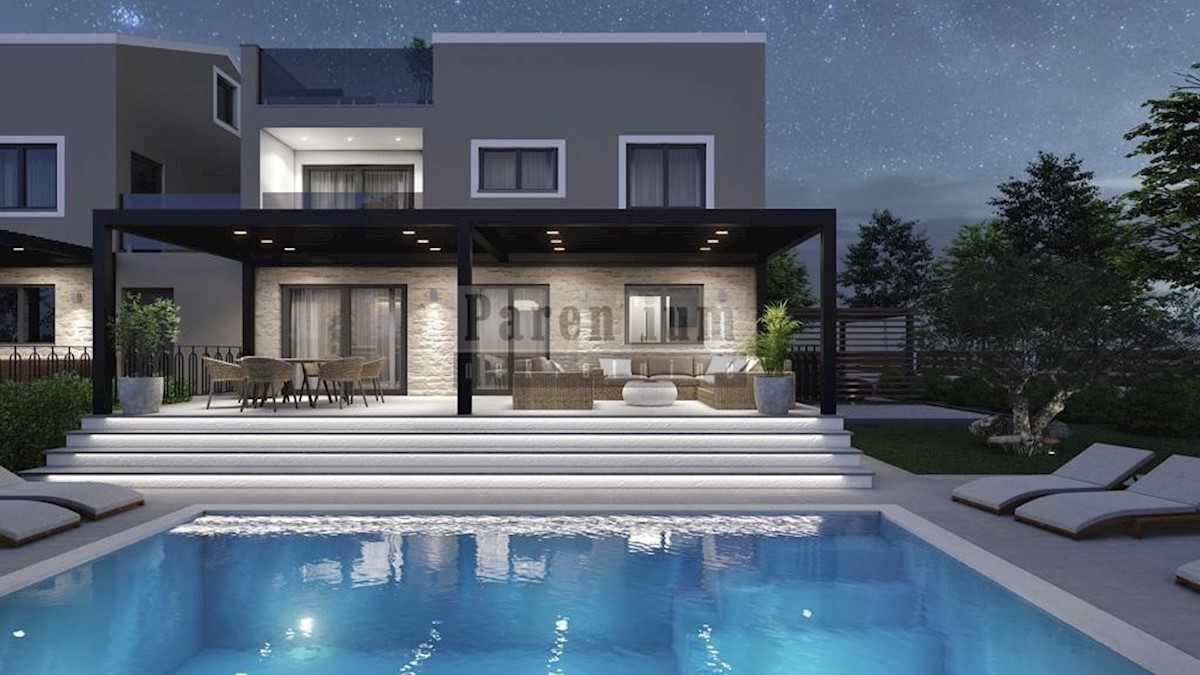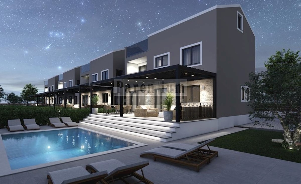 Poreč, okolica, prodaje se kuća u izgradnji u okolici Poreča, površine 170 m2 sa 500 m2 okućnice. U prizemlju se nalazi ulazni hodnik, dva spremišta, ostava, toaleta, kuhinja s blagovaonom, veliki dnevni boravak s kaminom i izlazom na terasu i na bazen s