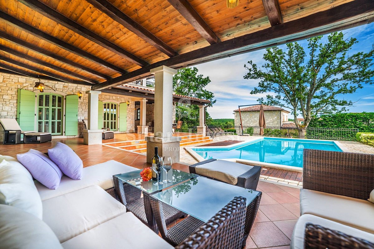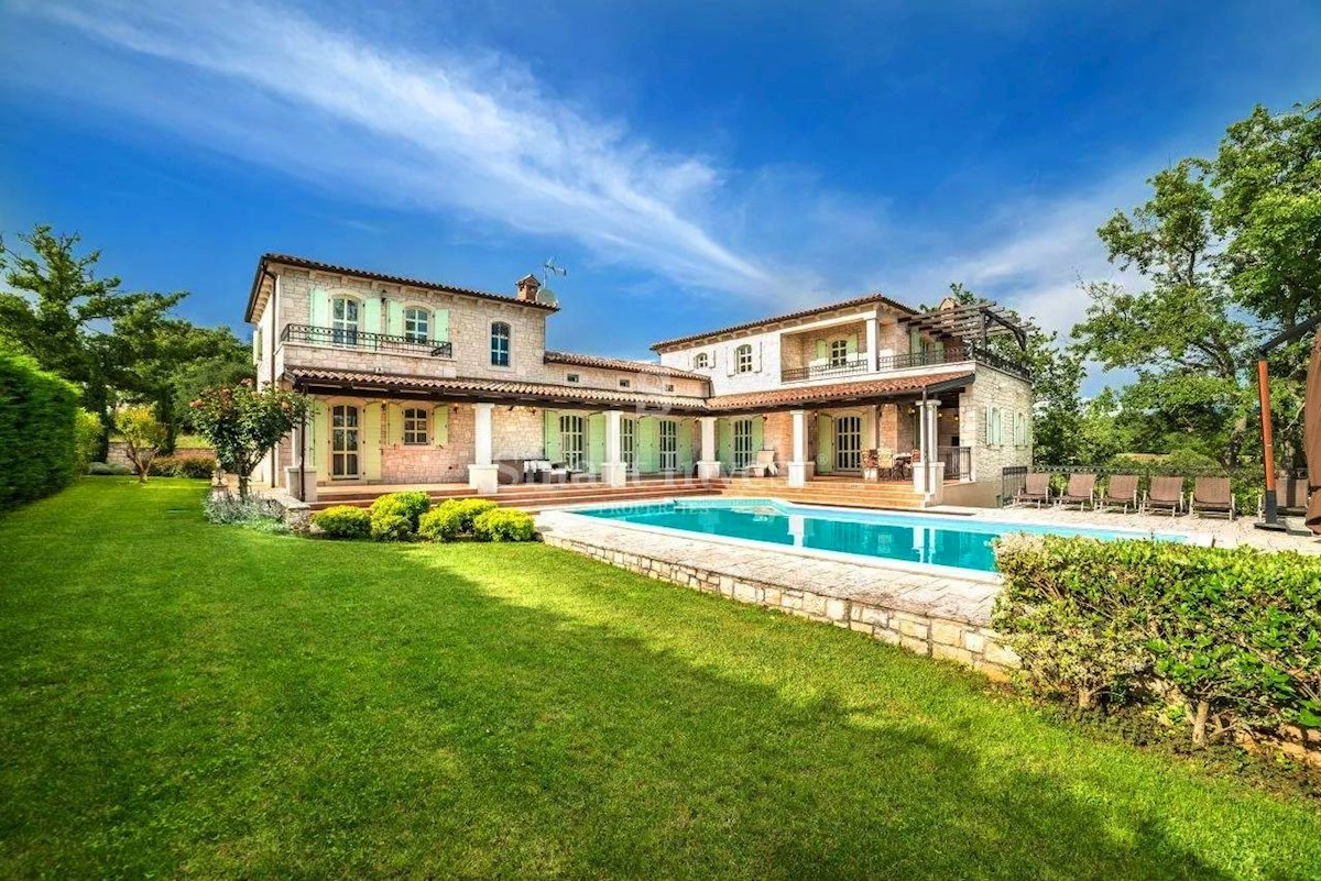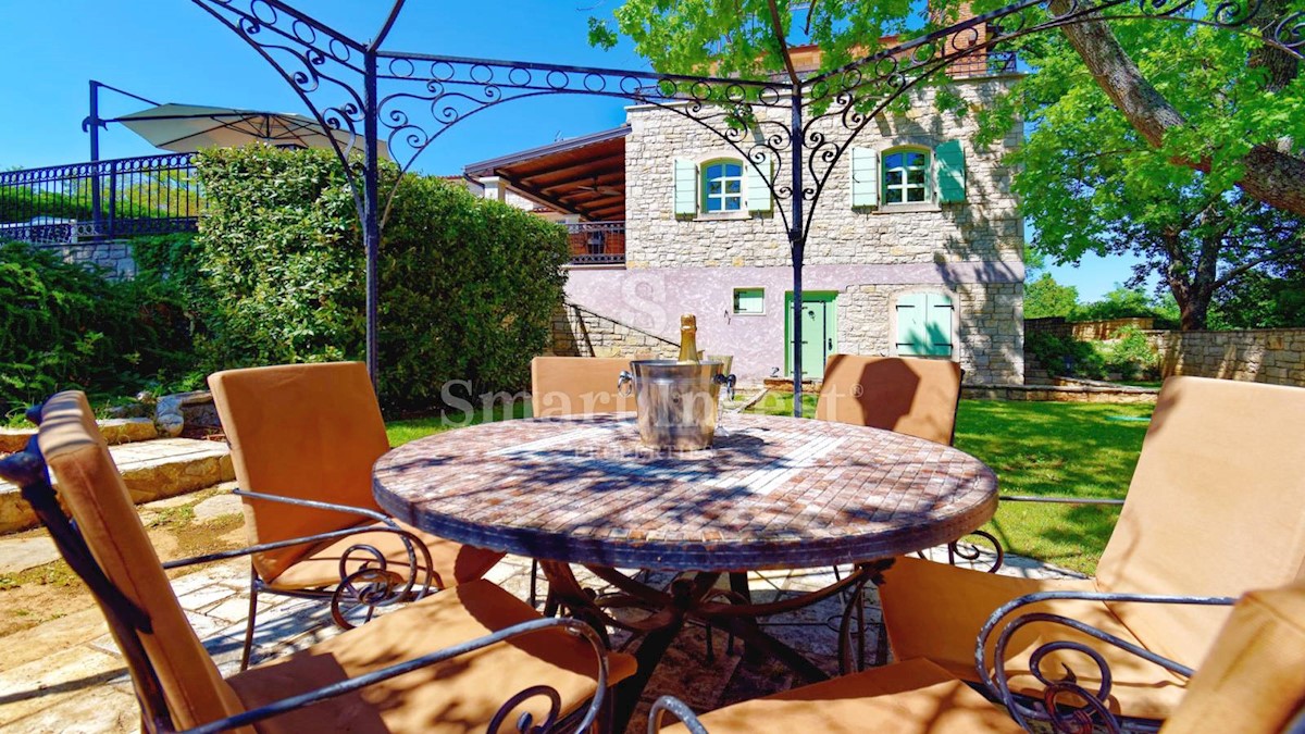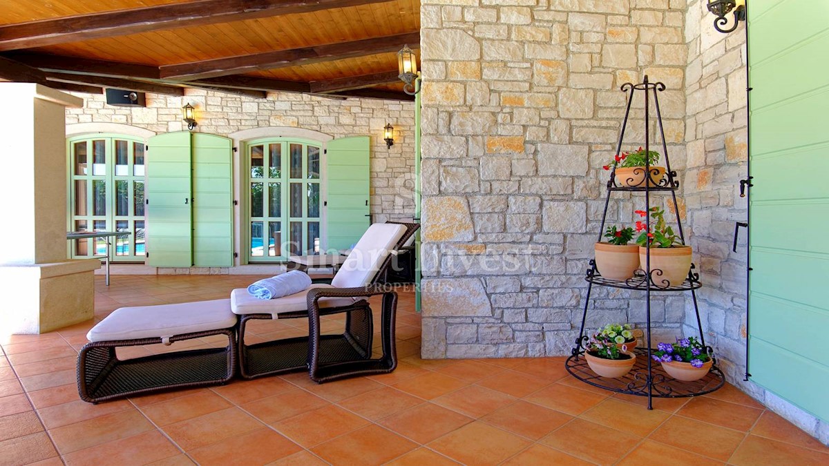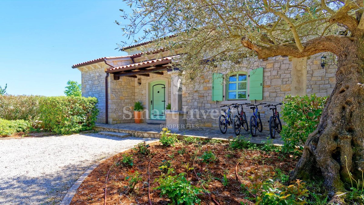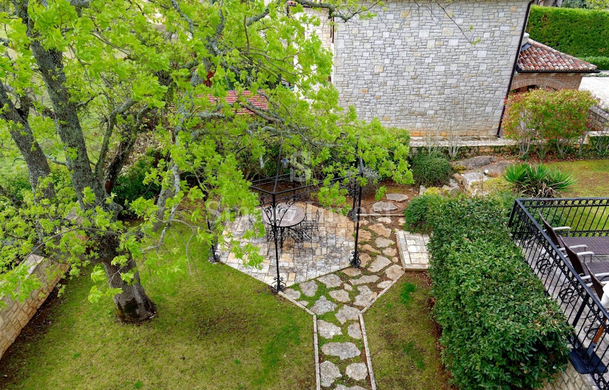 POREČ okolica, raskošna, luksuzno opremljena rustikalna kamena vila sa grijanim bazenom, konobom, saunom i velikom prekrasno uređenom okućnicom, na mirnoj lokaciji okruženoj trostoljetnim maslinama i hrastovima, u pitoresknom mjestašcu 15 minuta udaljenom