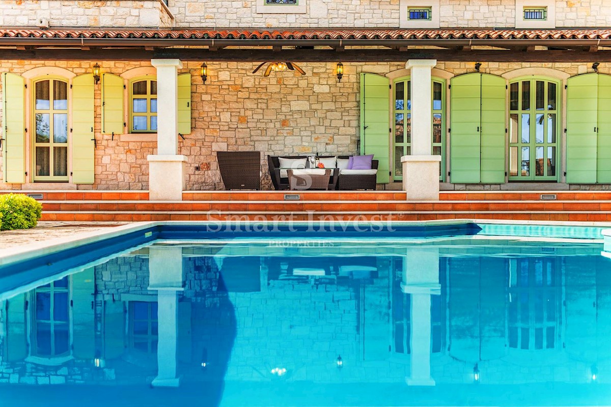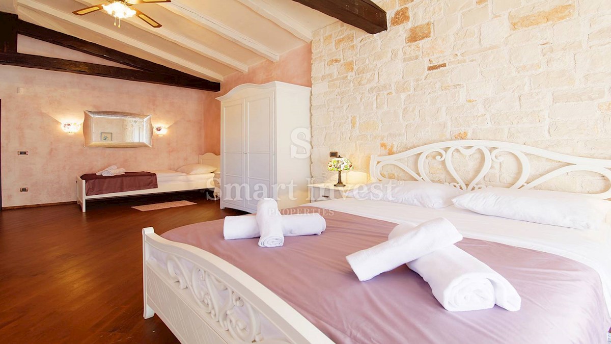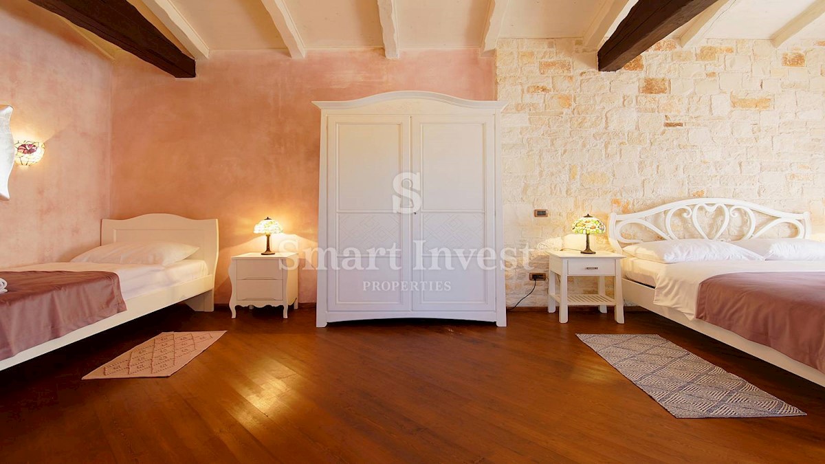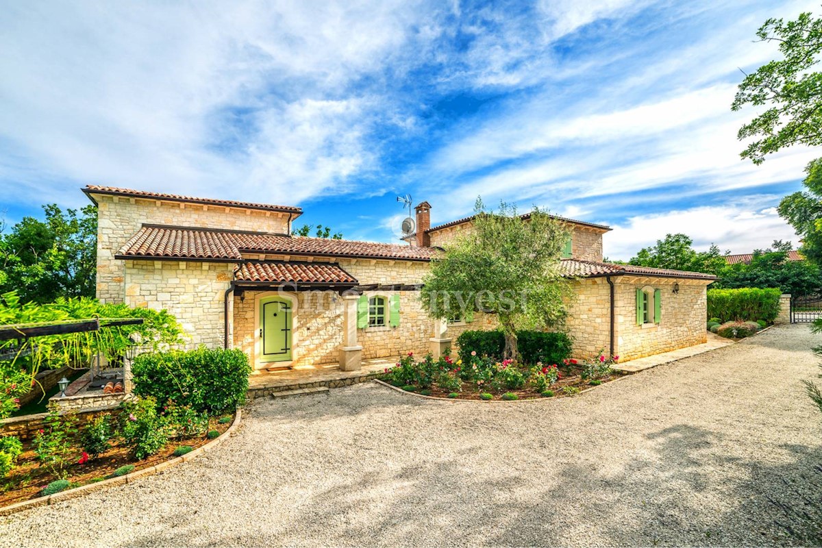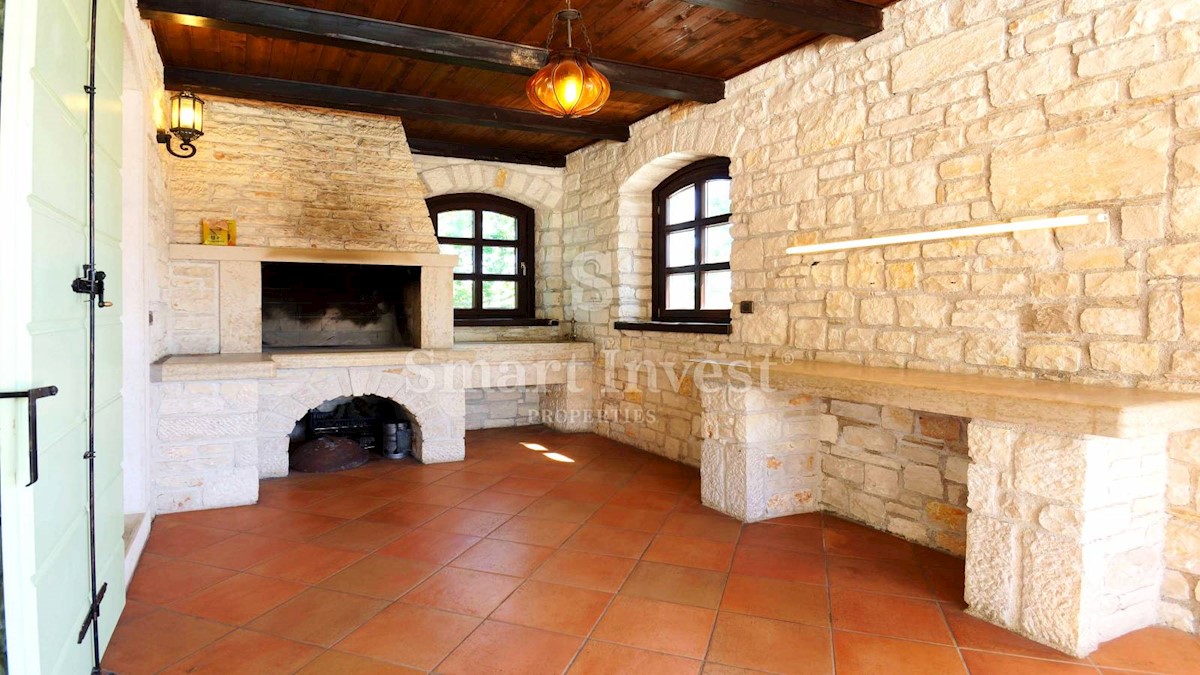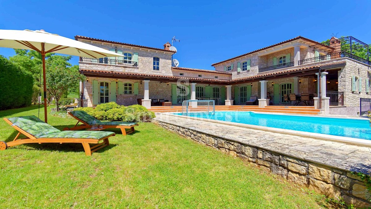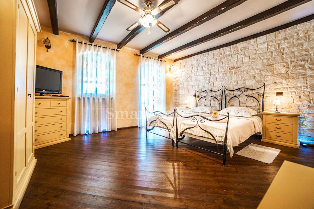 POREČ okolica, raskošna, luksuzno opremljena rustikalna kamena vila sa grijanim bazenom, konobom, saunom i velikom prekrasno uređenom okućnicom, na mirnoj lokaciji okruženoj trostoljetnim maslinama i hrastovima, u pitoresknom mjestašcu 15 minuta udaljenom