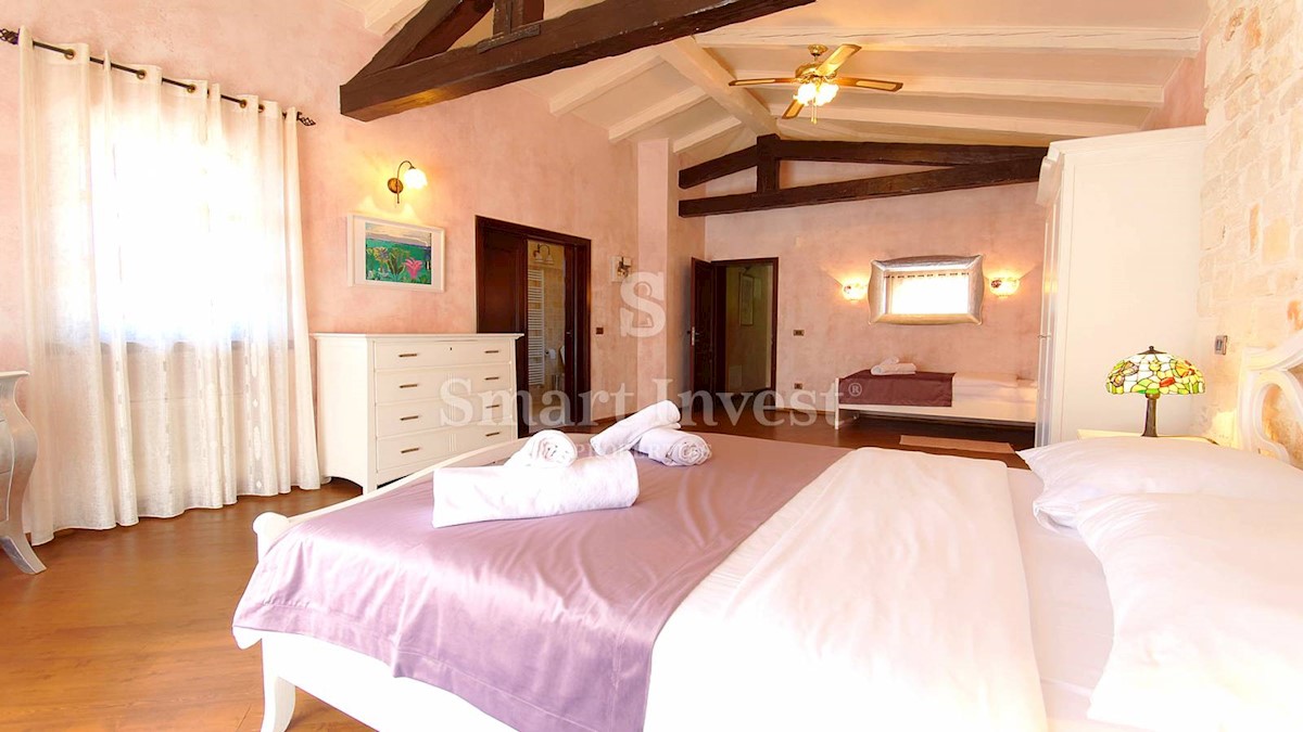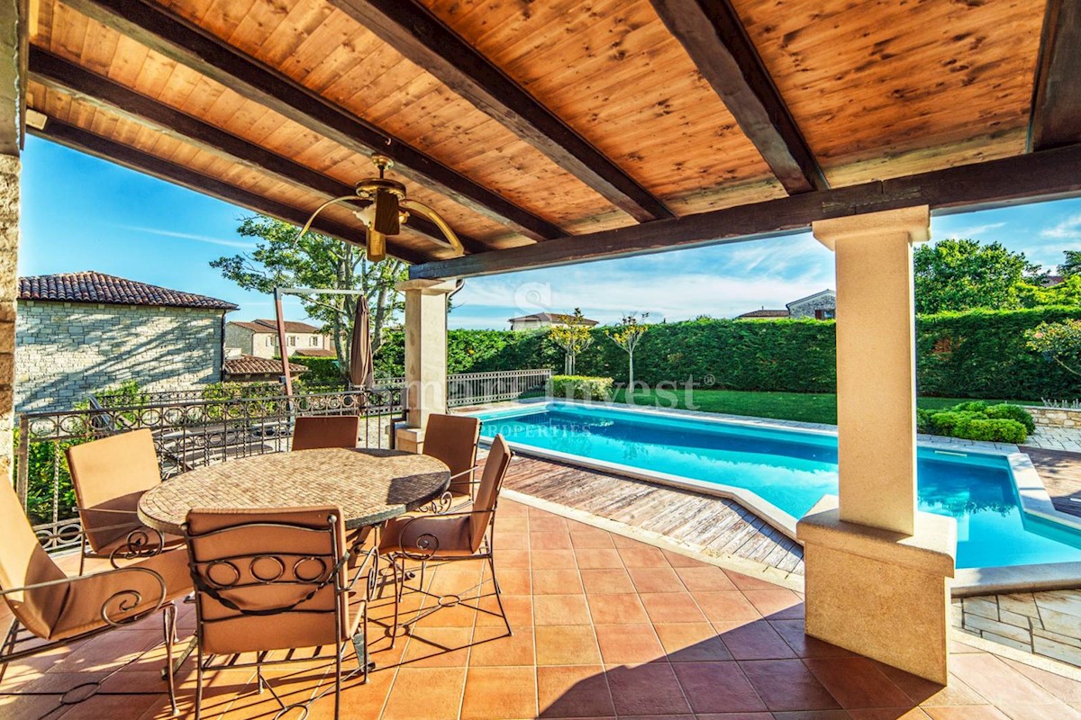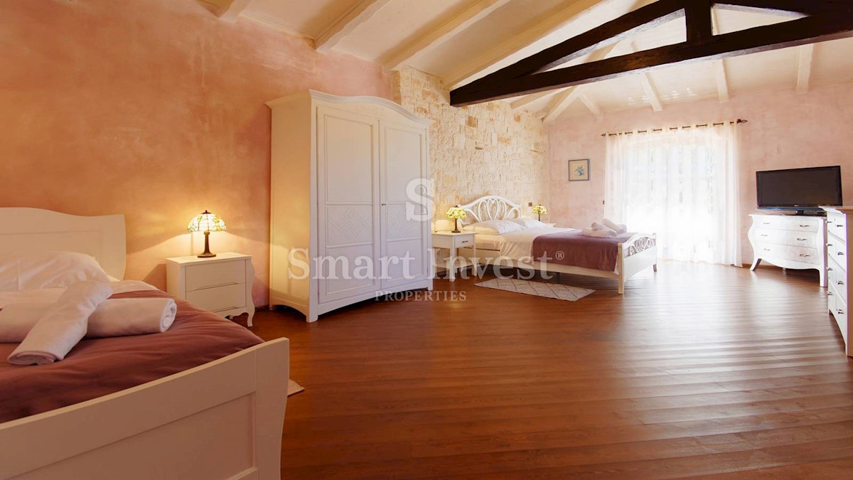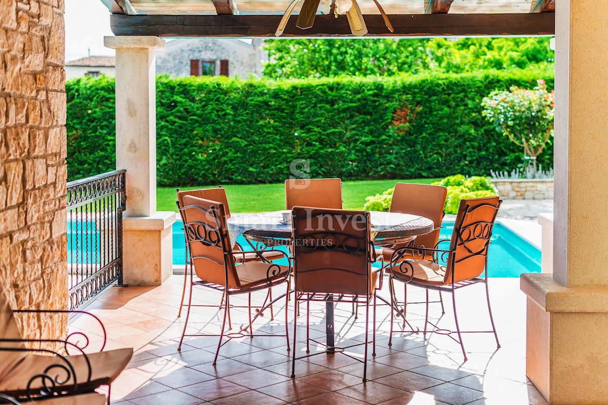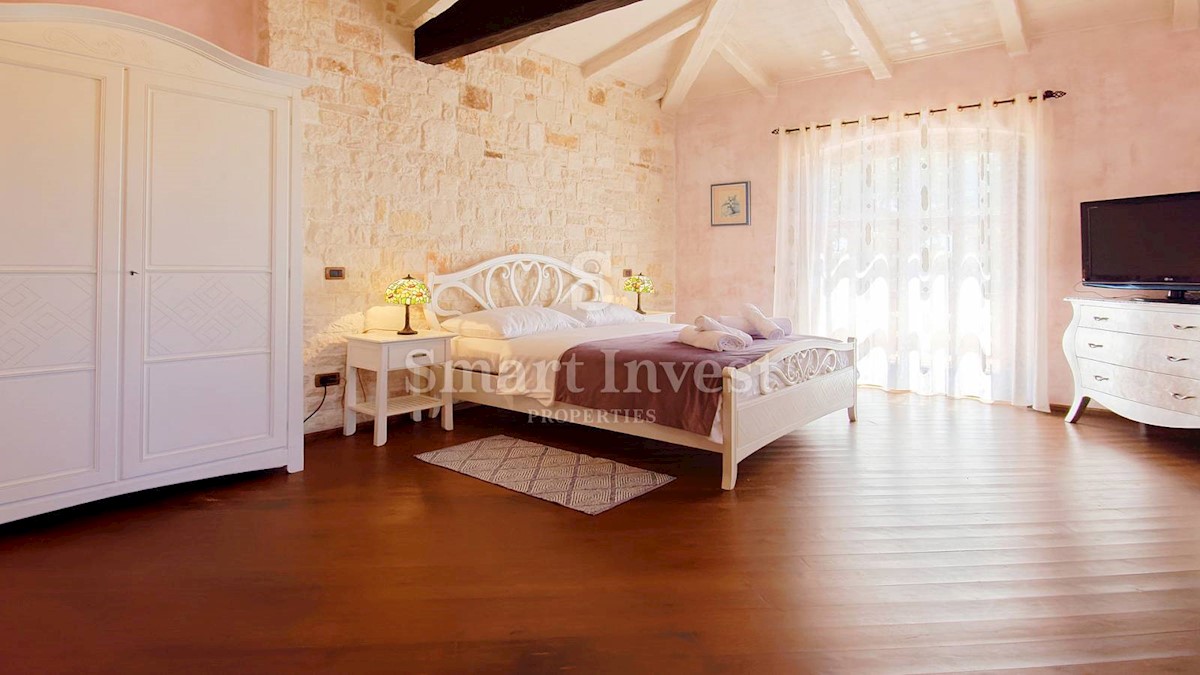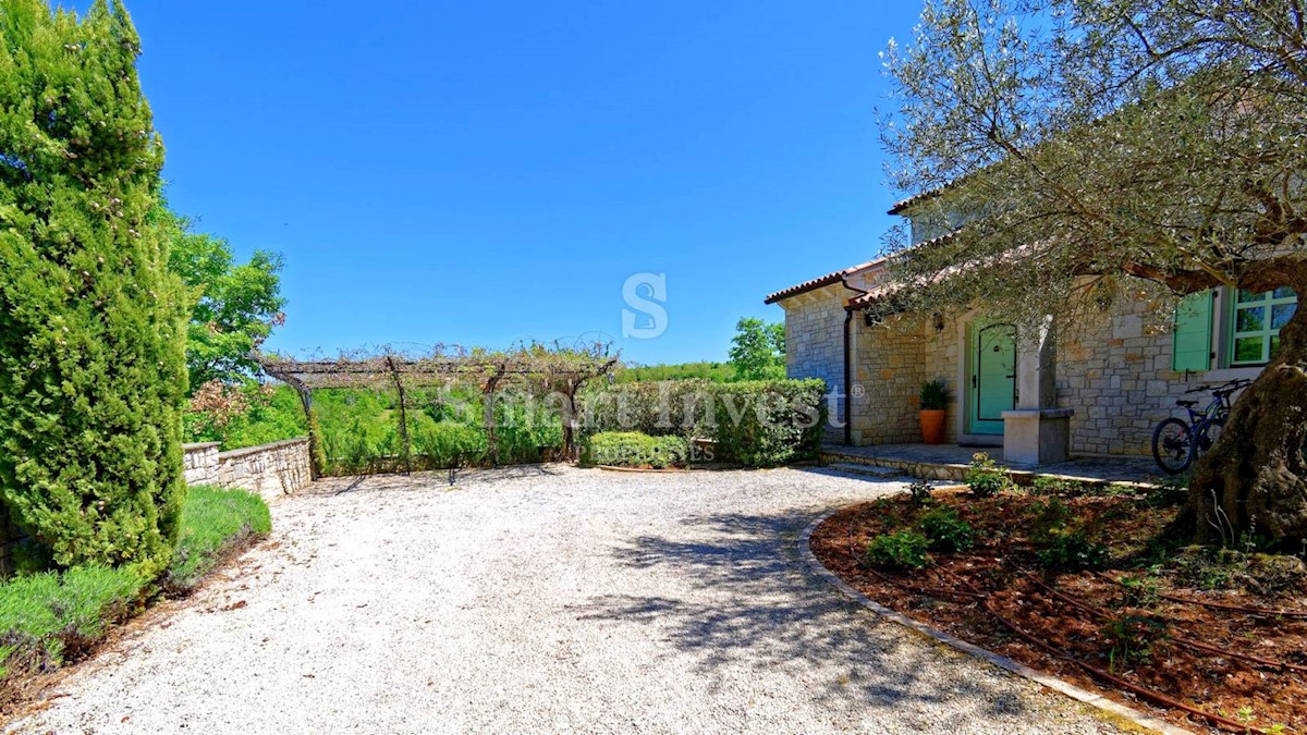 POREČ okolica, raskošna, luksuzno opremljena rustikalna kamena vila sa grijanim bazenom, konobom, saunom i velikom prekrasno uređenom okućnicom, na mirnoj lokaciji okruženoj trostoljetnim maslinama i hrastovima, u pitoresknom mjestašcu 15 minuta udaljenom