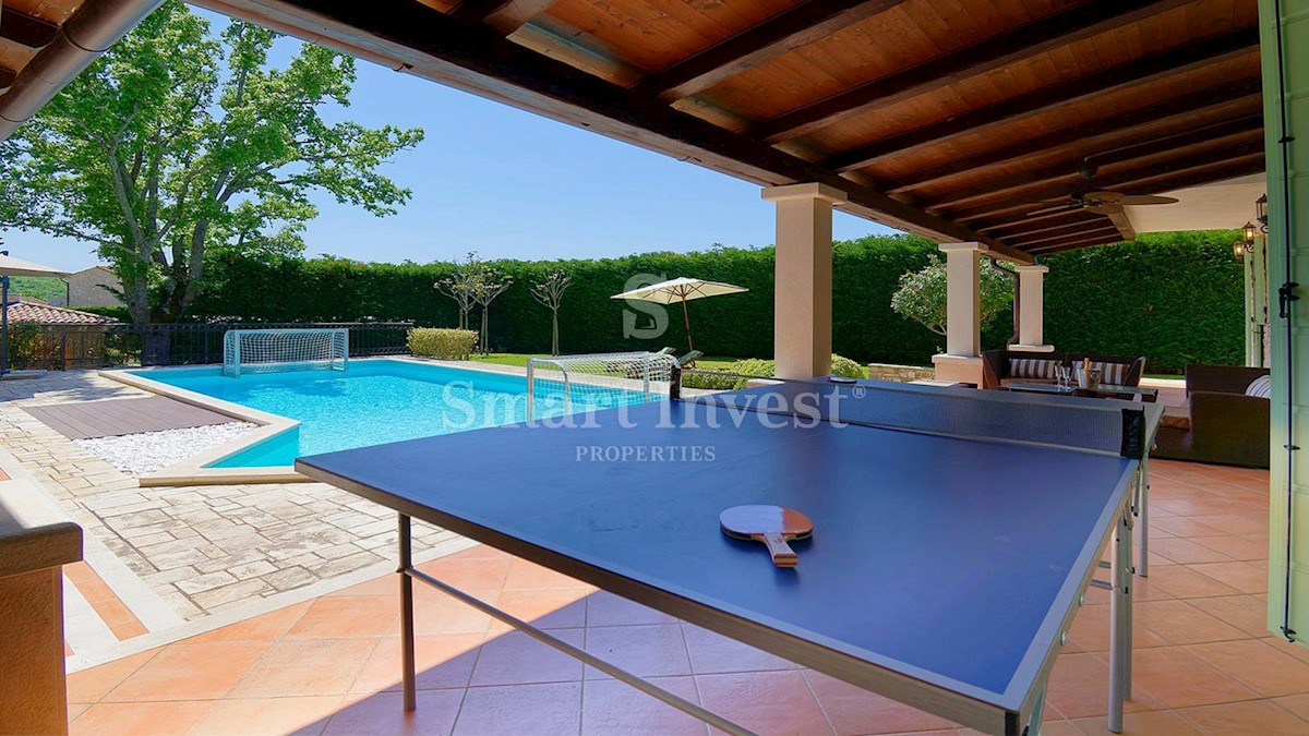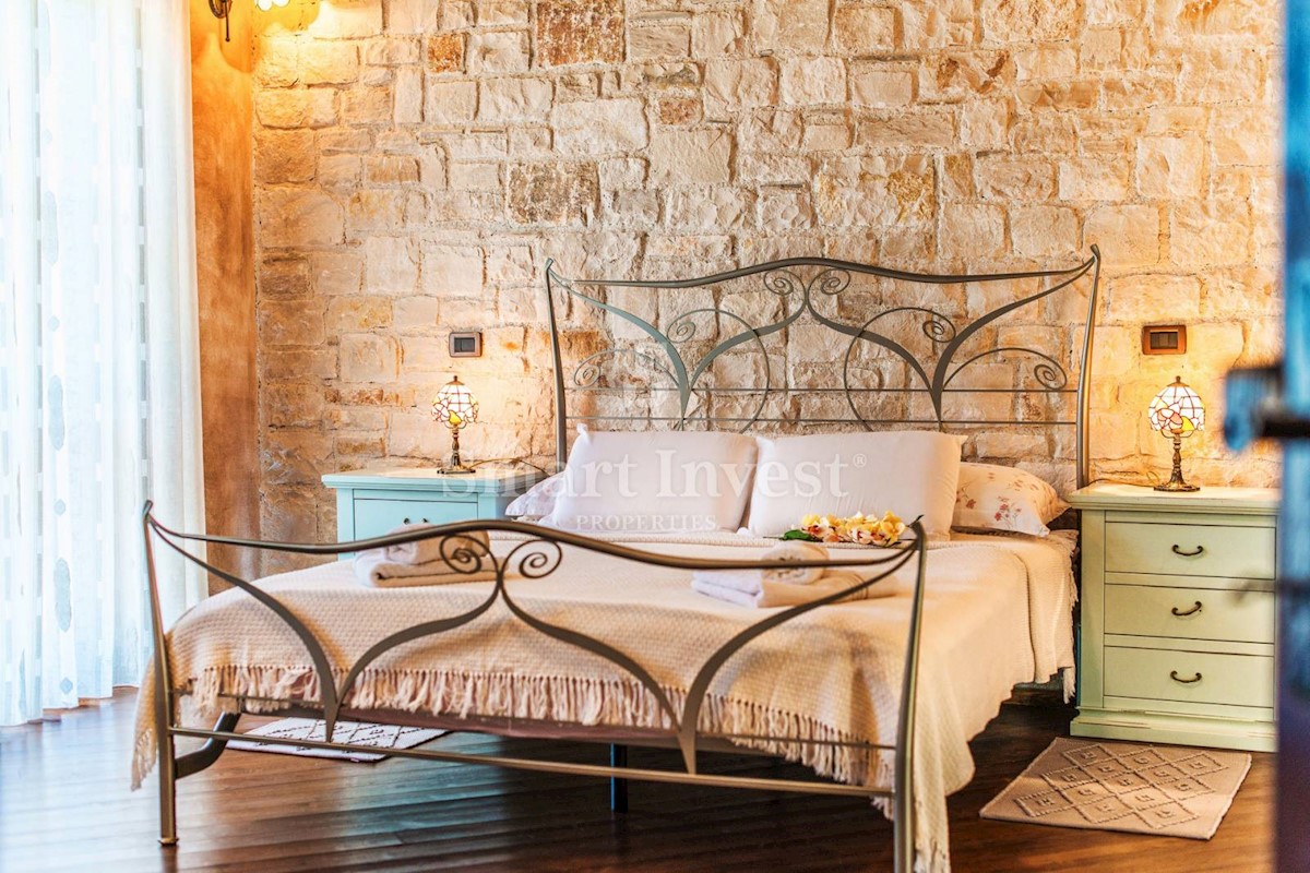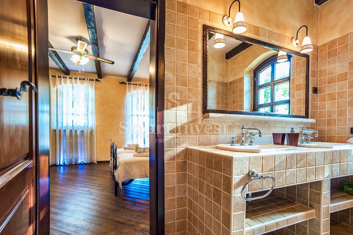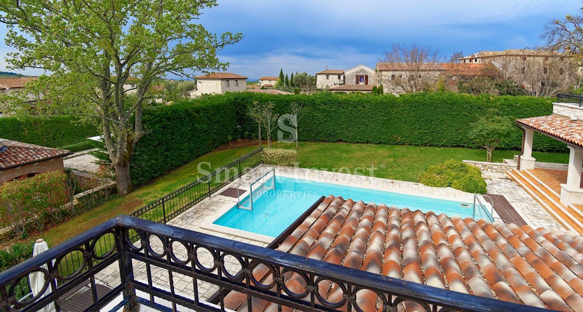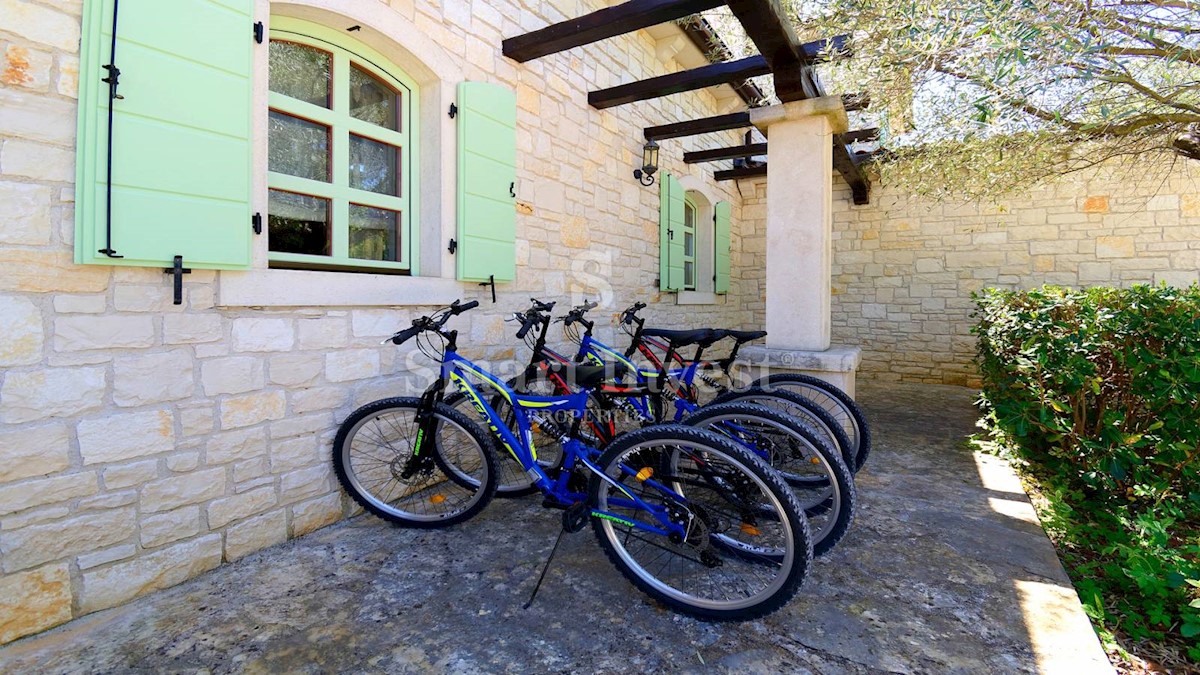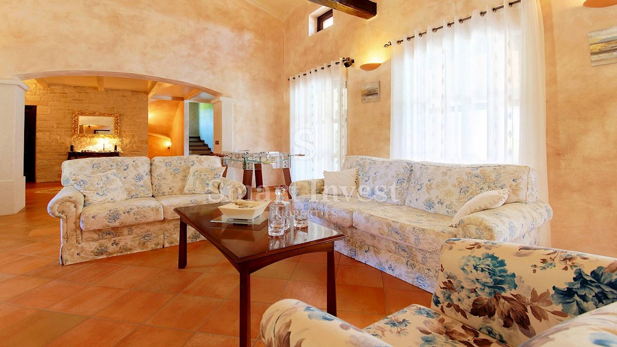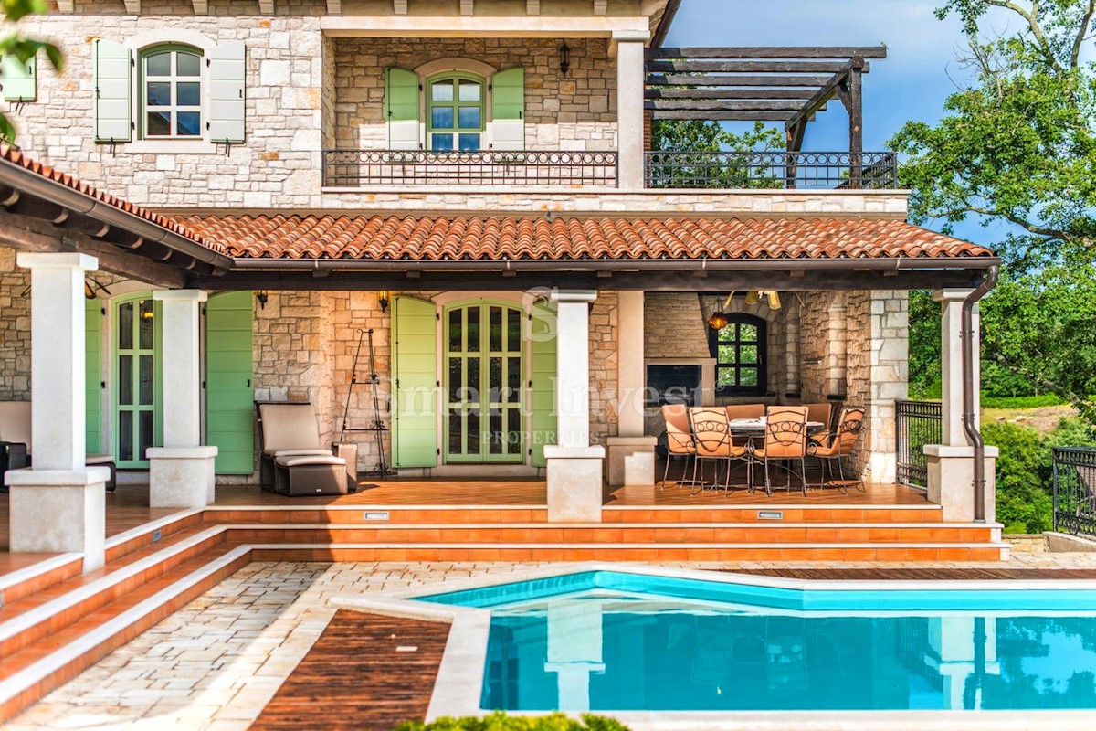POREČ okolica, raskošna, luksuzno opremljena rustikalna kamena vila sa grijanim bazenom, konobom, saunom i velikom prekrasno uređenom okućnicom, na mirnoj lokaciji okruženoj trostoljetnim maslinama i hrastovima, u pitoresknom mjestašcu 15 minuta udaljenom