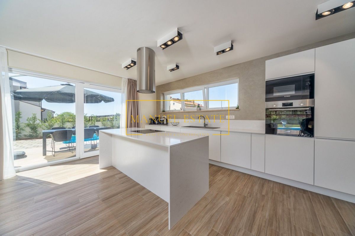 Moderna vila s pogledom na more, na mirnoj lokaciji, ukupne stambene površine od 261,28 m2 sa pomno uređenom okućnicom od 800 m2. Kuća se nalazi u malom istarskom selu nadomak grada Poreča. Prostire se na tri etaže, prizemlje, kat i visoko potkrovlje sa n