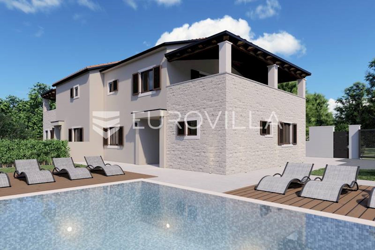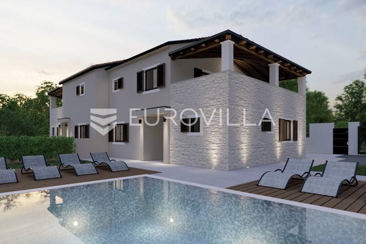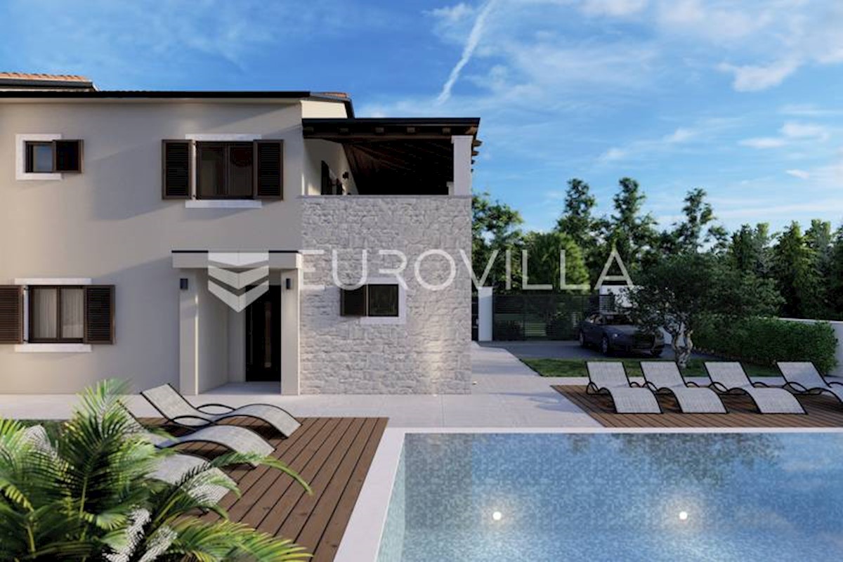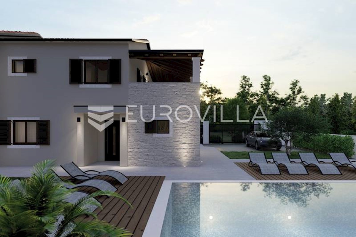 U rubnom djelu naselja nedaleko grada Poreča smještena je ova prekrasna moderna dvojna kamena kuća od 170 m2, osmišljena da pruža mir i privatnost a isto da zadovolji sve uvjete modernog života. S obzirom na to da je kuća smještena na rubnom djelu građevi