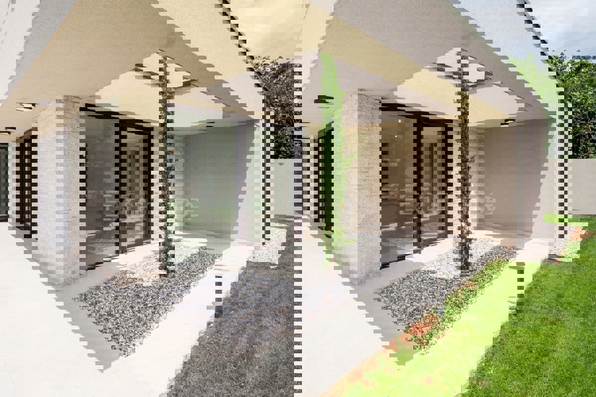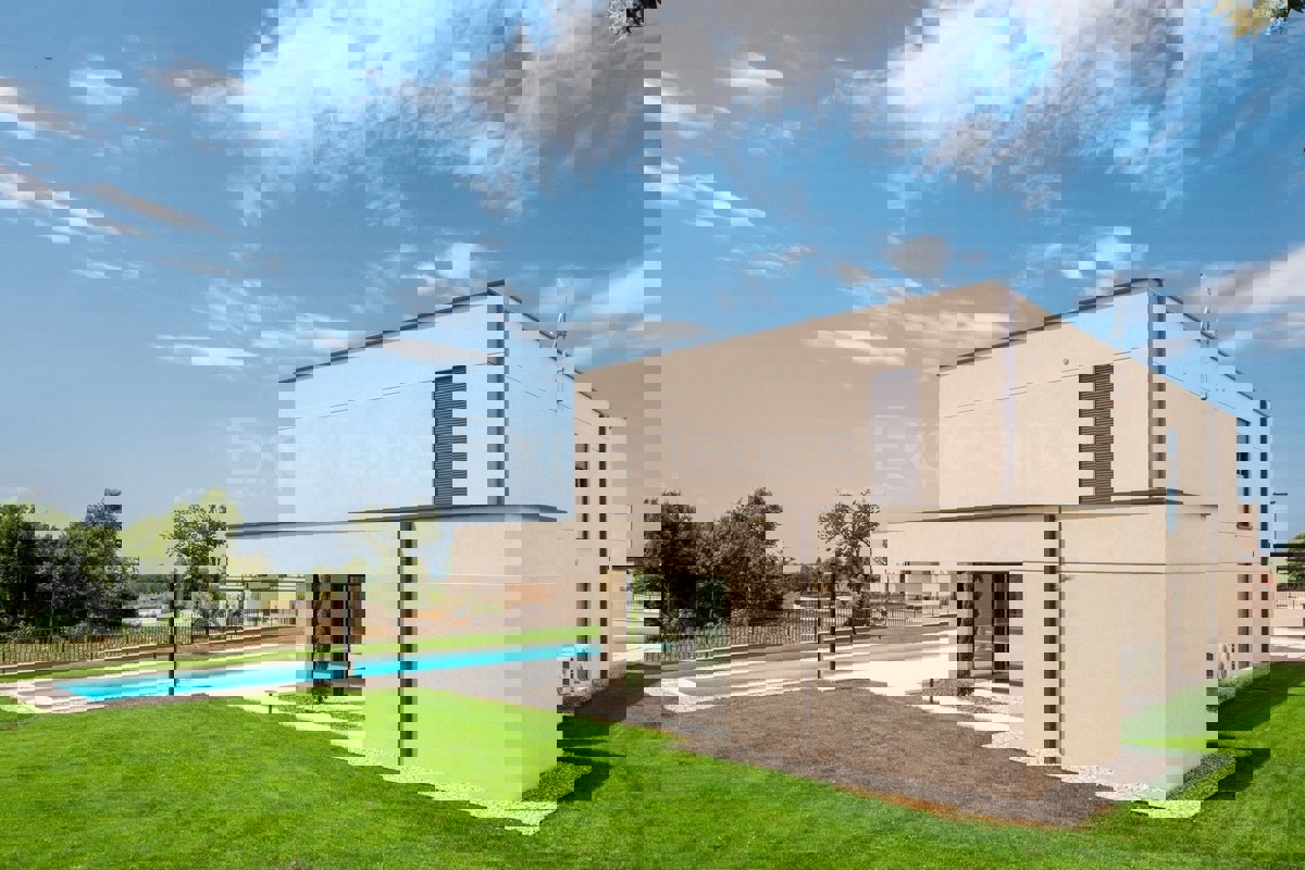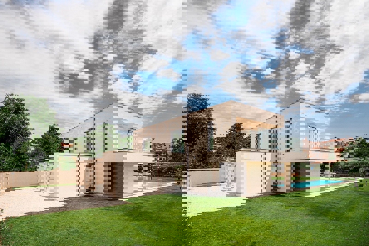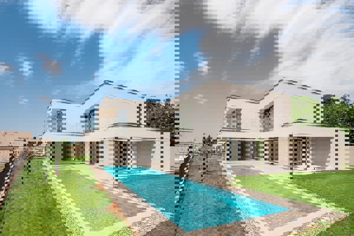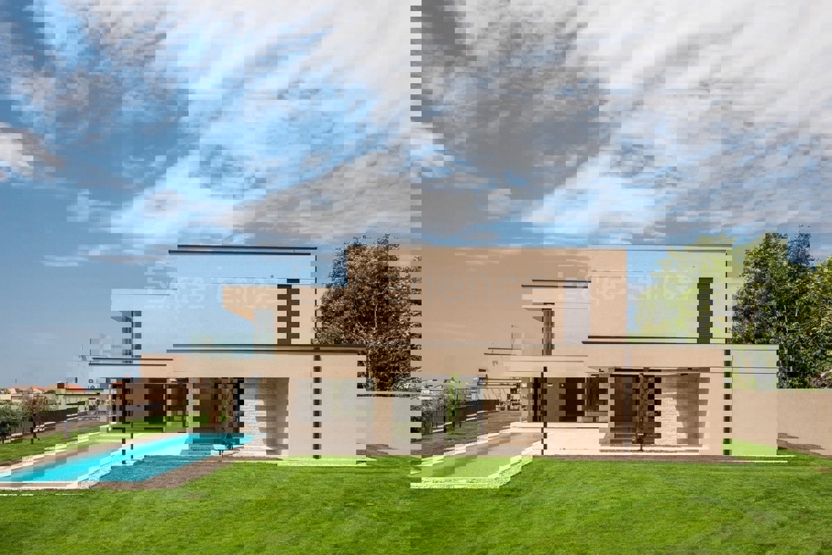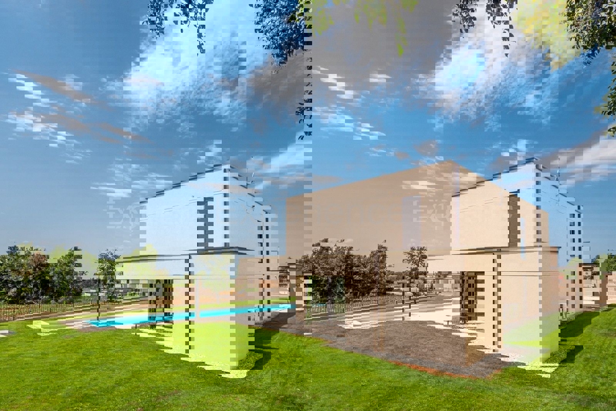 U okolici Poreča, na rubu naselja, u sklopu 14 luksuznih vila na prodaji je vila atraktivnog modernog dizajna. Eksterijer vile kojeg krasi fasada obložena dijelom u kamenu, izbor blagih tonova, atraktivan, a istovremeno minimalistički dizajn odlično se sj