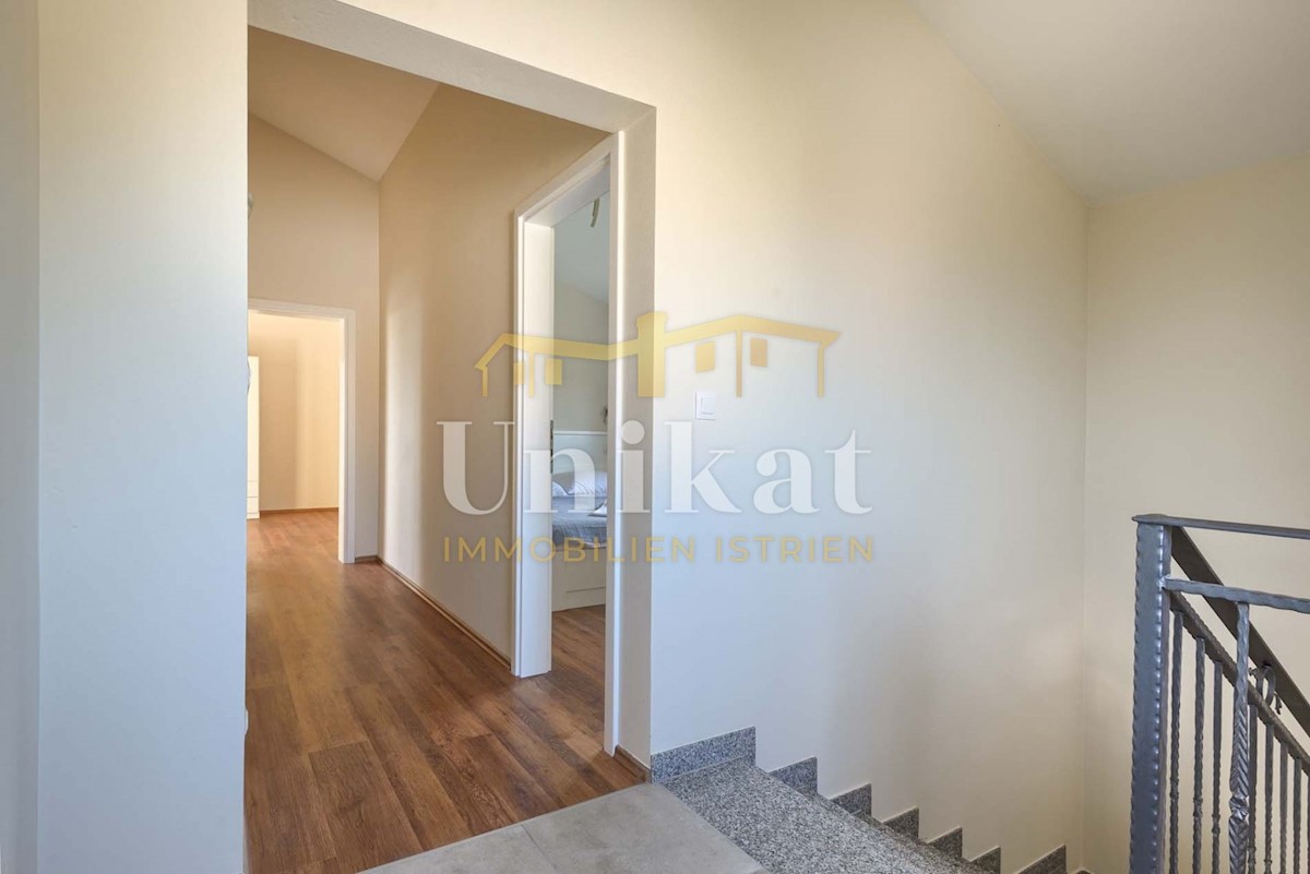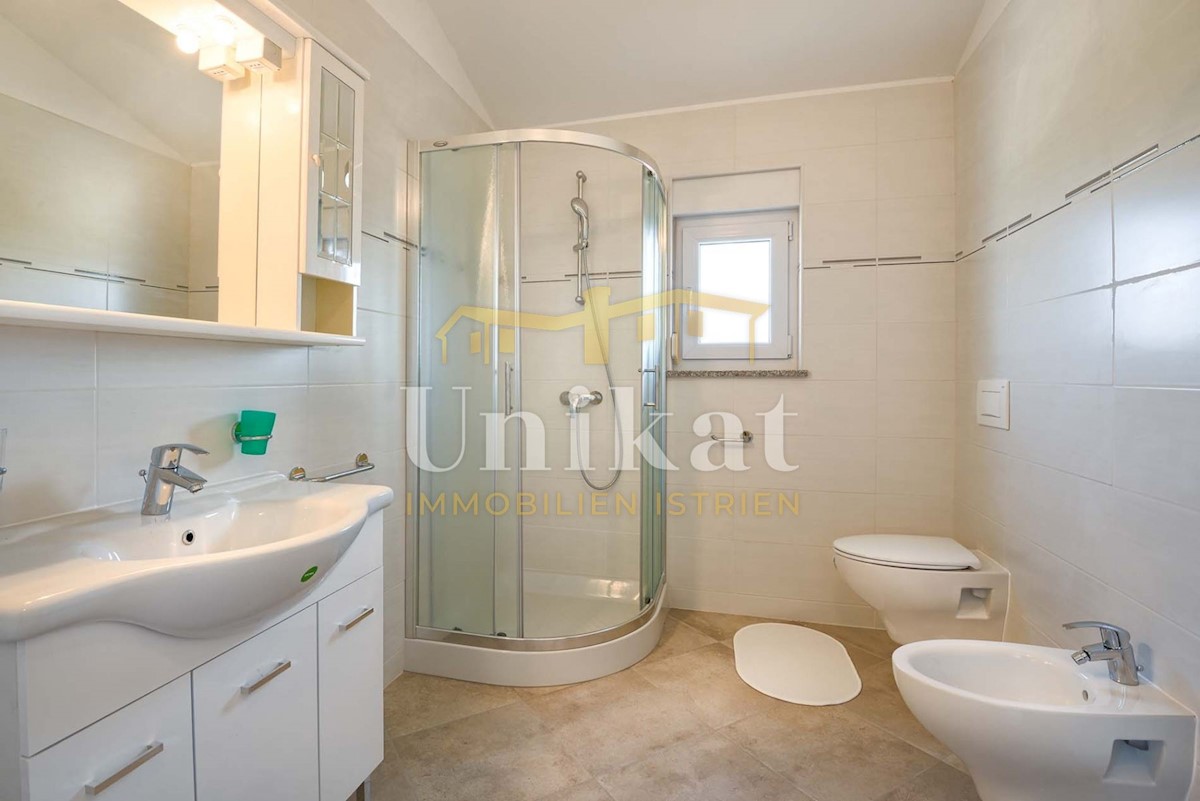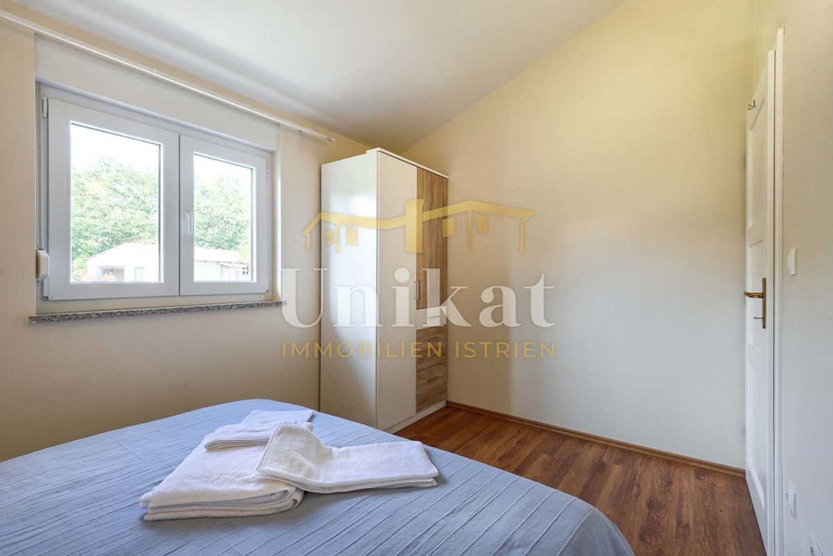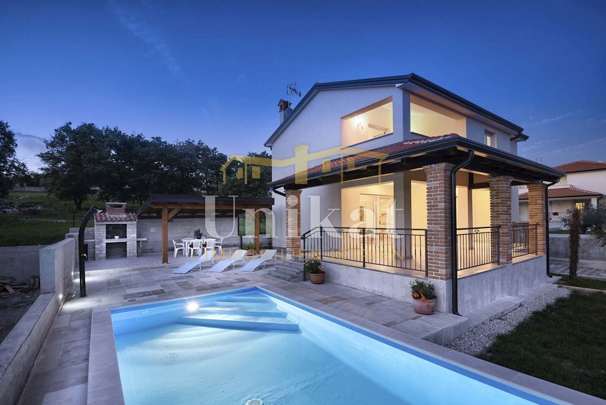 Prekrasna kuća s bazenom u okolici Poreča, okružena zelenilom i ostalim lijepim kućama. Ova dvokatnica na prizemlju sastoji se od dnevnog boravka, kuhinje i blagovaone te kupaonice, dok se na katu nalaze tri spavaće sobe, kupaonica i terasa. Na okućnici s