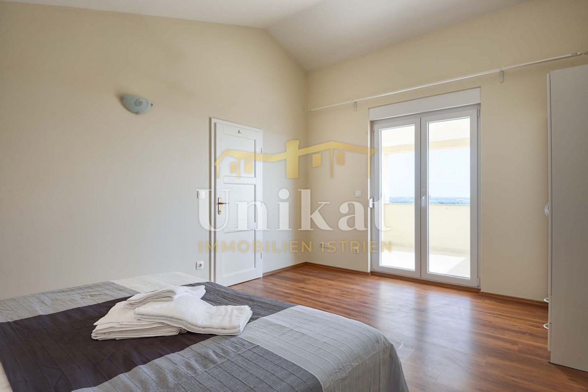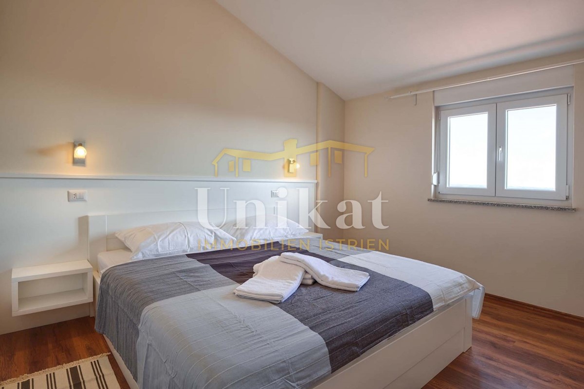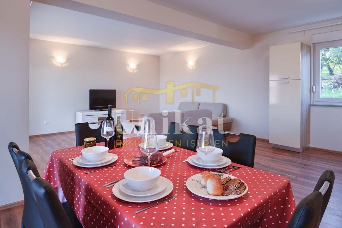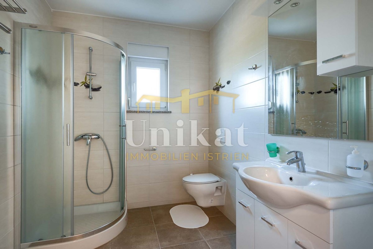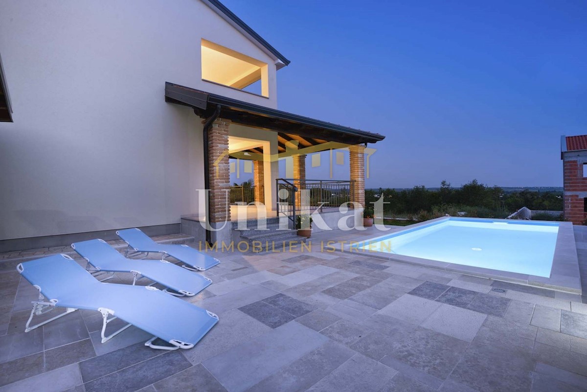 Prekrasna kuća s bazenom u okolici Poreča, okružena zelenilom i ostalim lijepim kućama. Ova dvokatnica na prizemlju sastoji se od dnevnog boravka, kuhinje i blagovaone te kupaonice, dok se na katu nalaze tri spavaće sobe, kupaonica i terasa. Na okućnici s