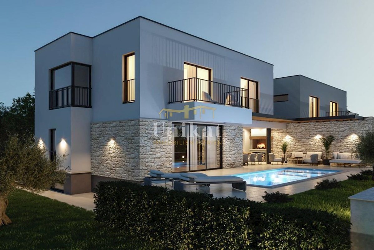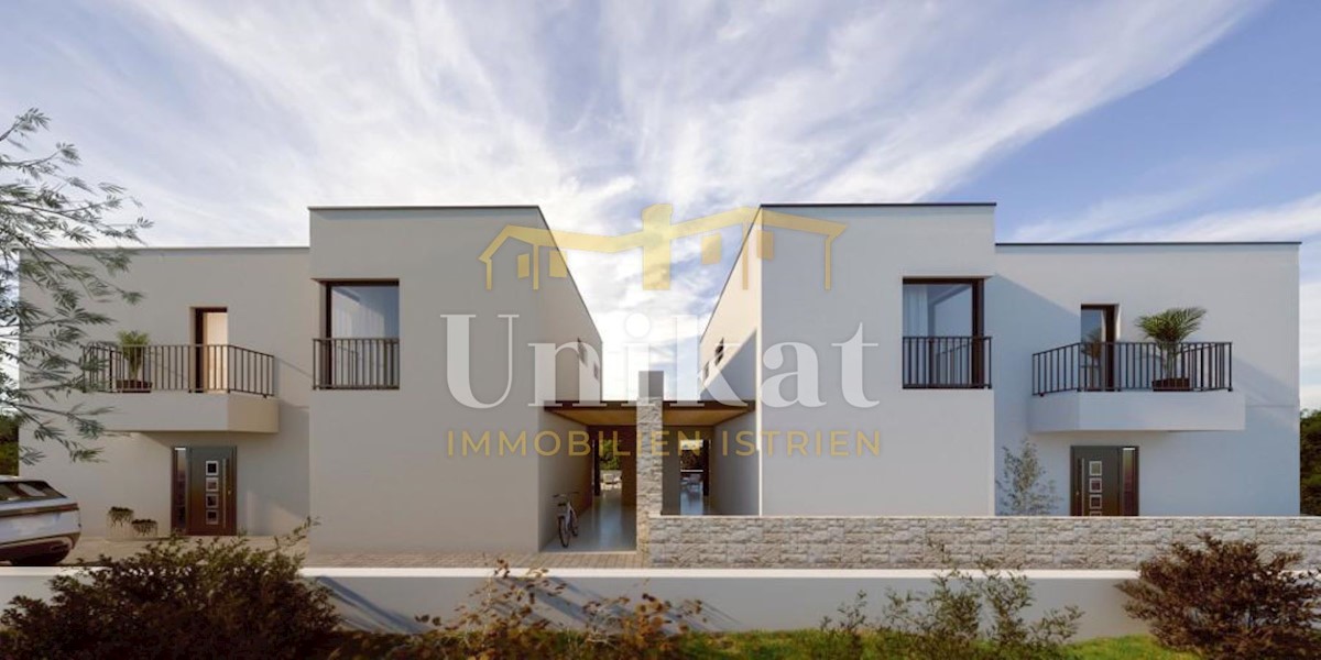Kuća dvojnica u mirnom dijelu Poreča, udaljenom samo 2.5 km od mora i plaža. Sastoji se od tri etaže: u podrumu se nalazi sauna, dio za teretanu, prostor za odmor i spremište. U prizemlju se nalazi ulazni prostor, dnevni boravak, kuhinja, blagovaonica, ve