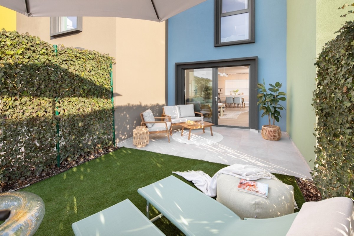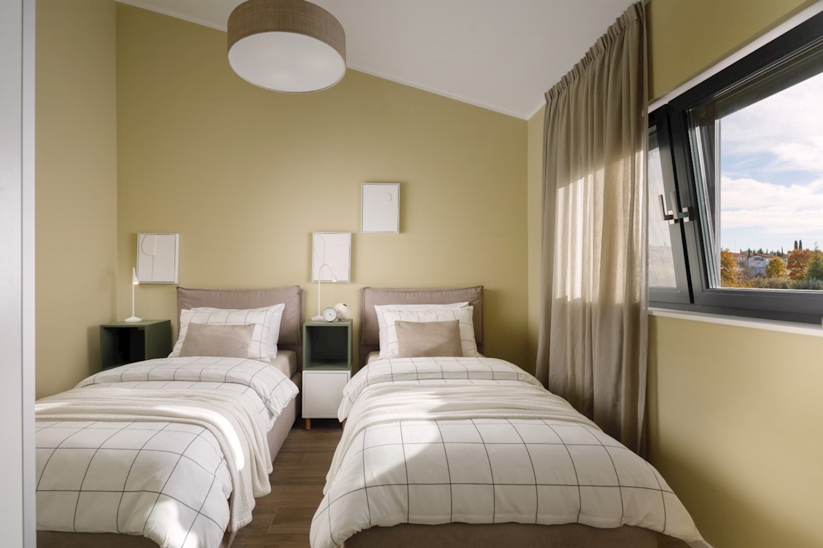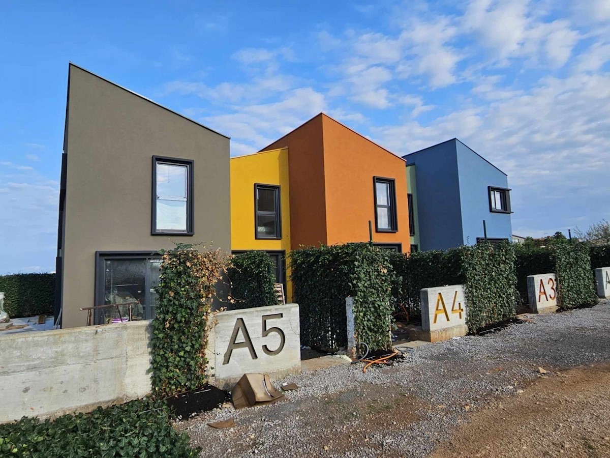 Poreču- na jako lijepoj i atraktivnoj lokaciji- kuća u nizu modernog dizajna, površine 76,27 m² na dvije etaže- U prizemlju open space dnevni boravak sa kuhinjom sa blagovaonicom, spremište i wc za goste- kat: dvije spavaće sobe i kupaonica- pr