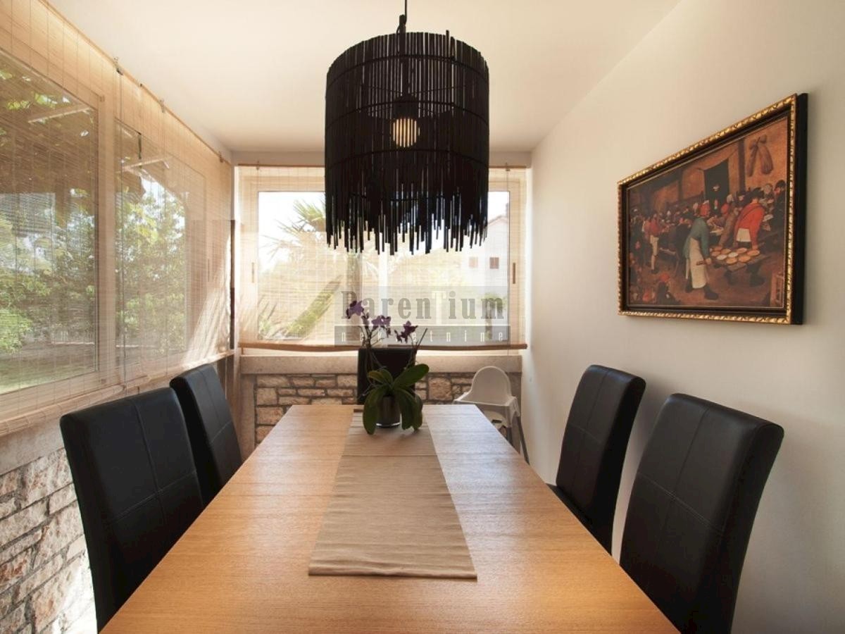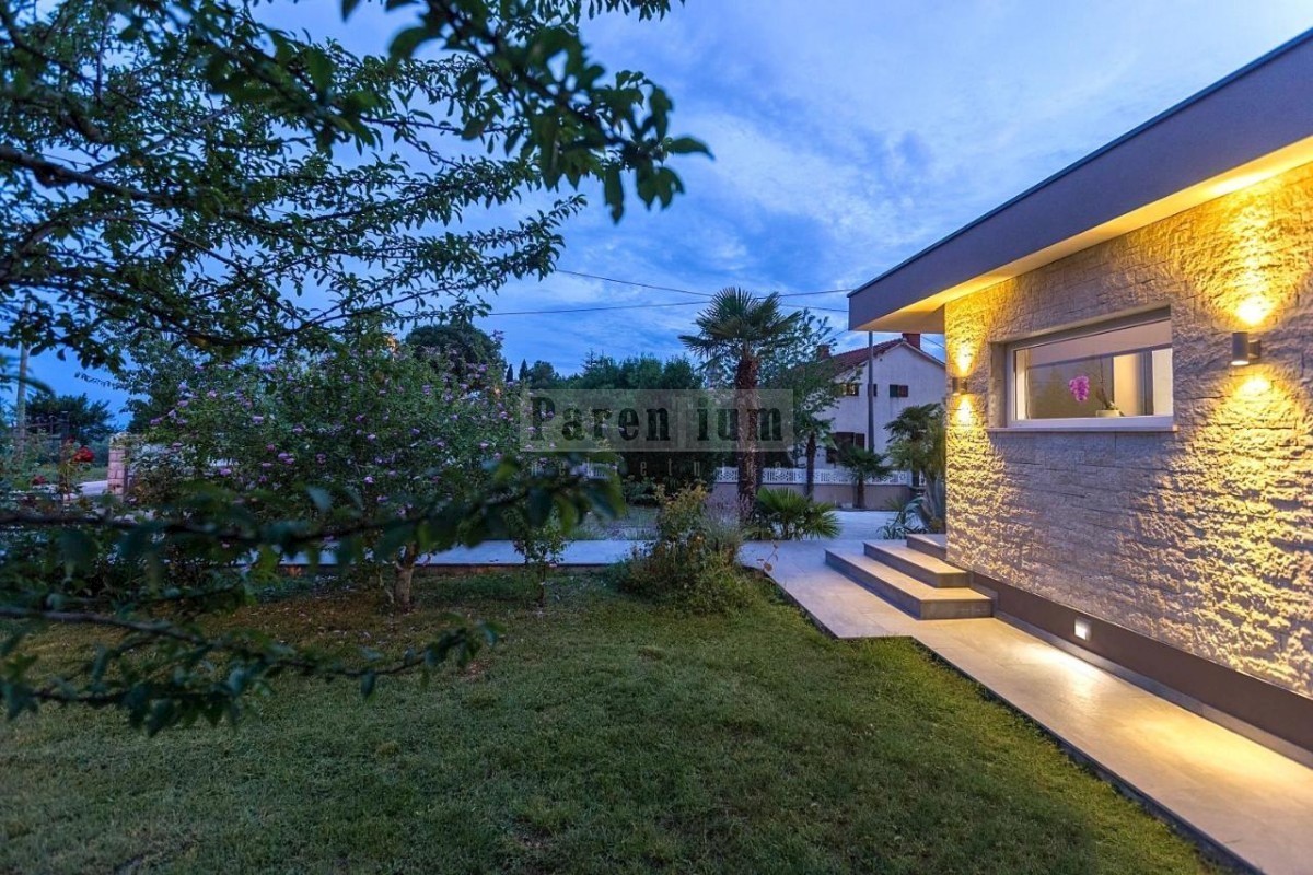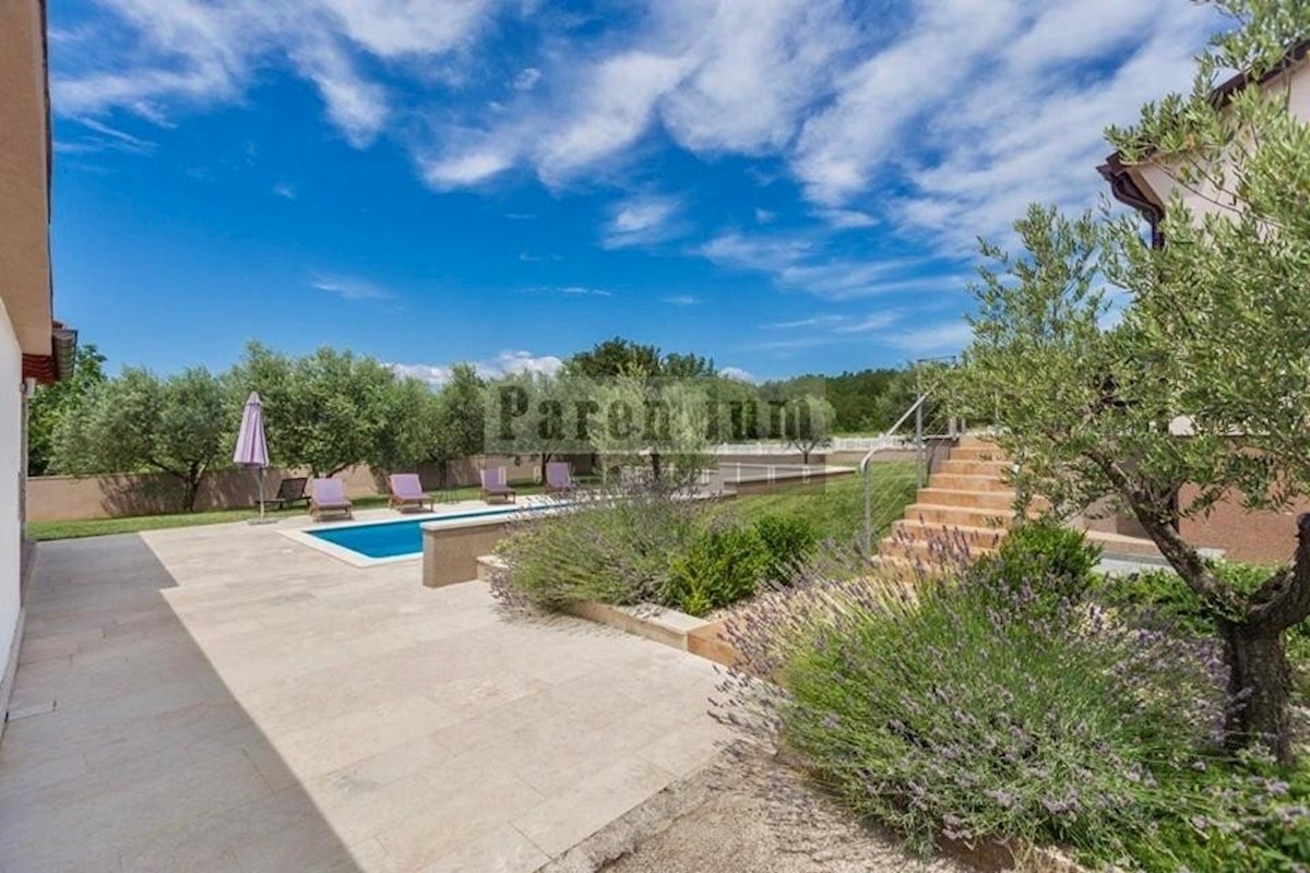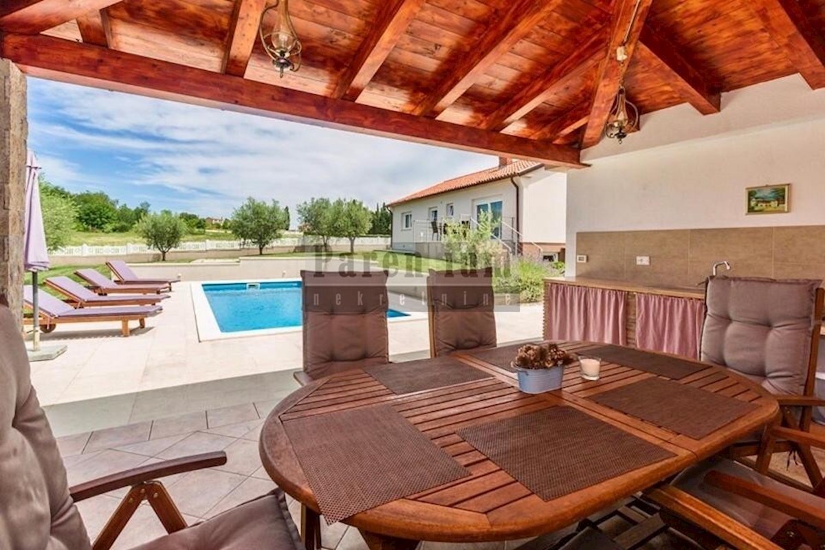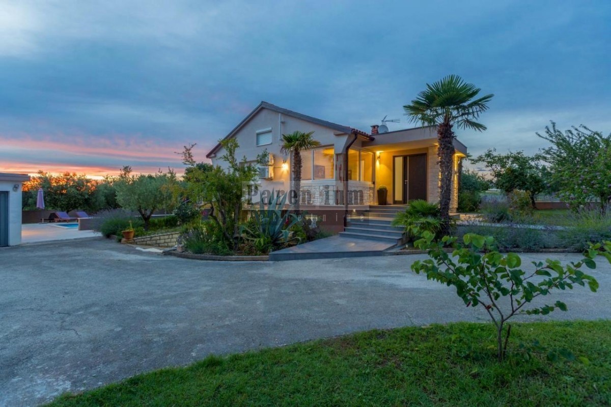 Poreč, okolica, na prodaji je predivna prizemnica sa bazenom površine 150m2. Sastoji se od kuhinje, blagovaone, dnevnog boravka, tri spavaće sobe, dva kupatila. Kuća ima i podrum gdje se nalazi play room. Okućnica kuće održavana je sa puno mediteranskog b
