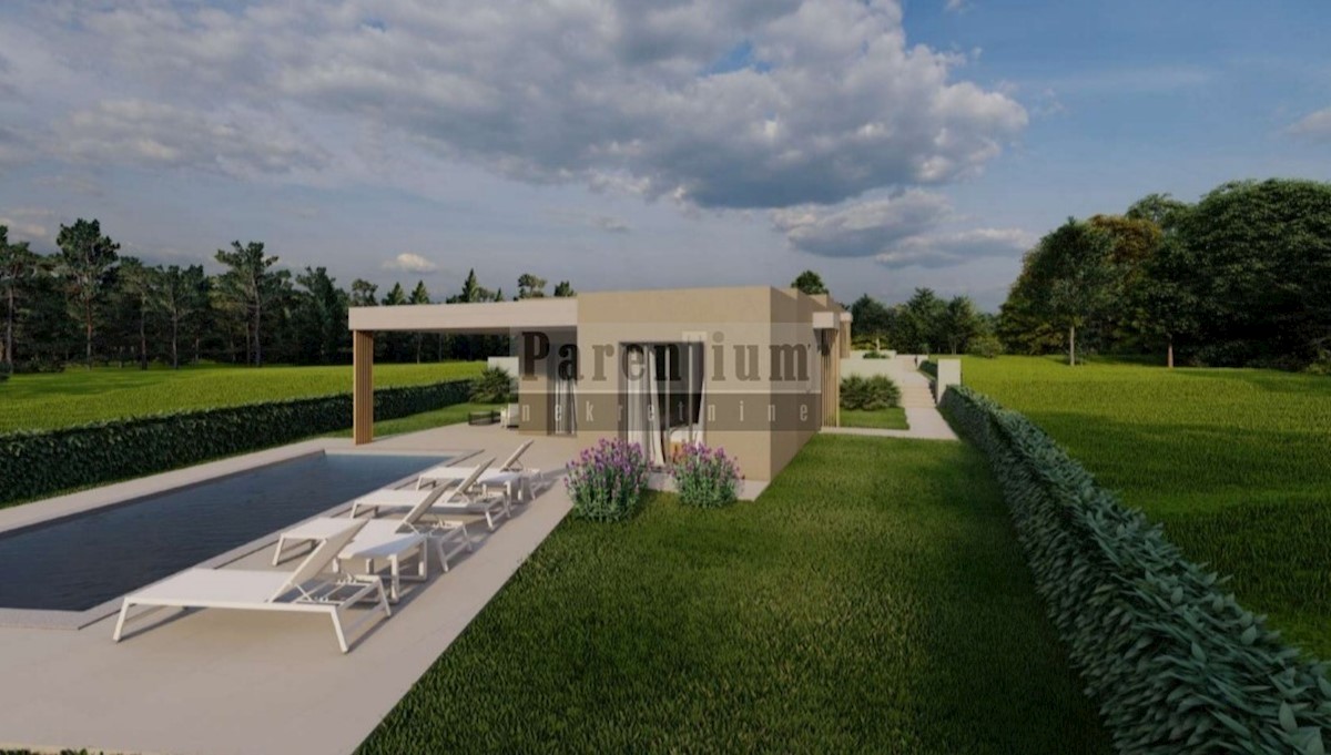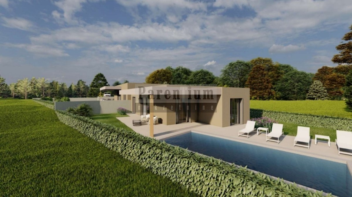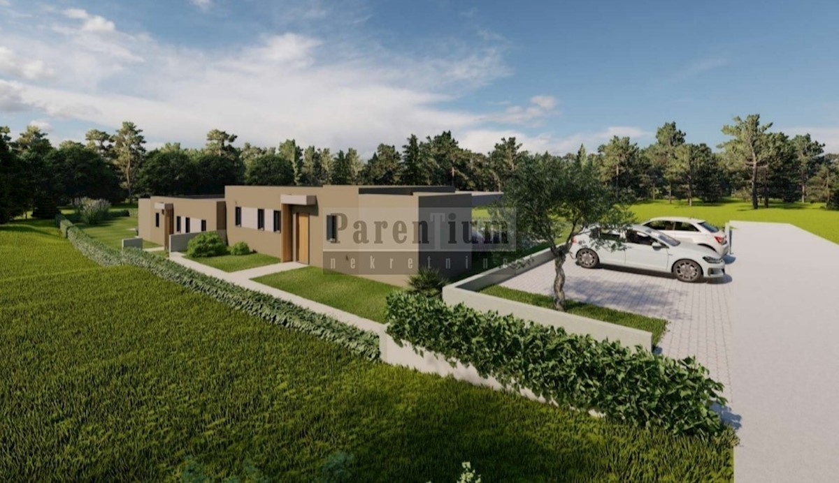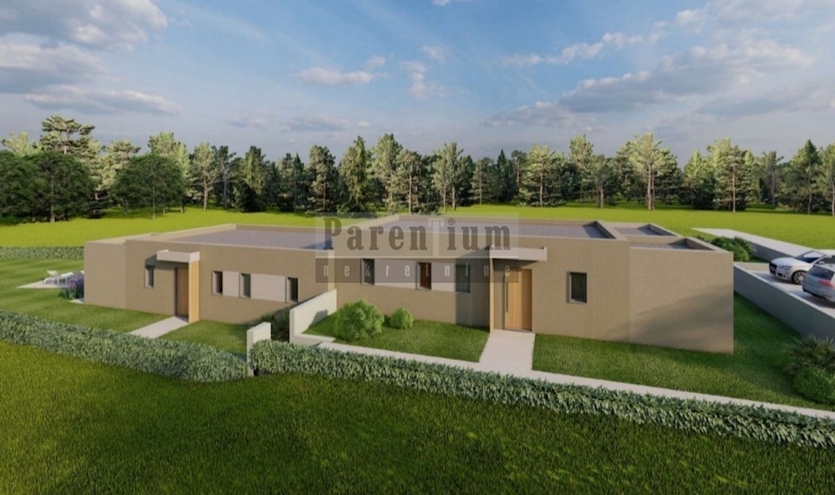 Poreč, okolica, 20km udaljeno od mora i centra Poreča prodaje se dio dvojne kuće u izgradnji. Prizemnica je površine 85m2 na okućnici od 550m2. Sastoji se od ulaznog hodnika, dnevnog boravka, kuhinje, blagovaone, wca, dvije spavaće sobe, kupatila. Kuća im