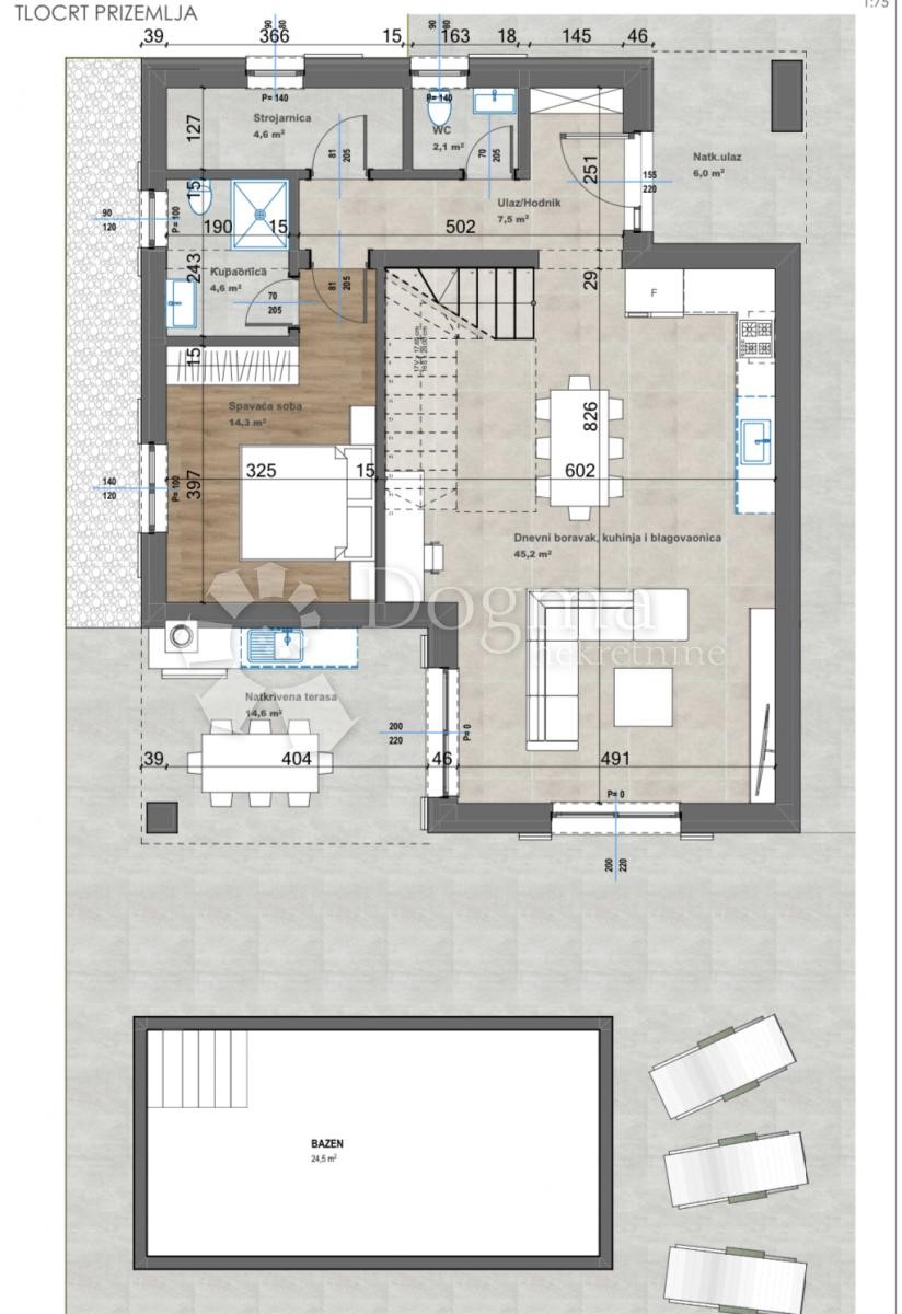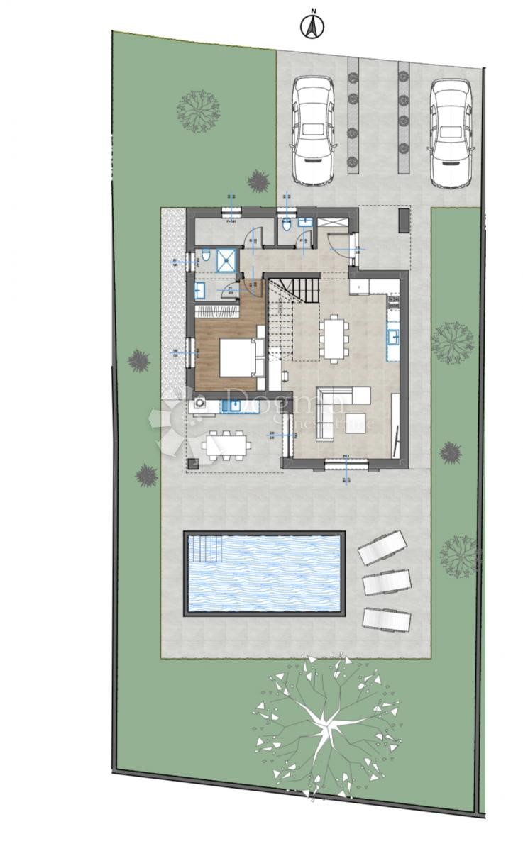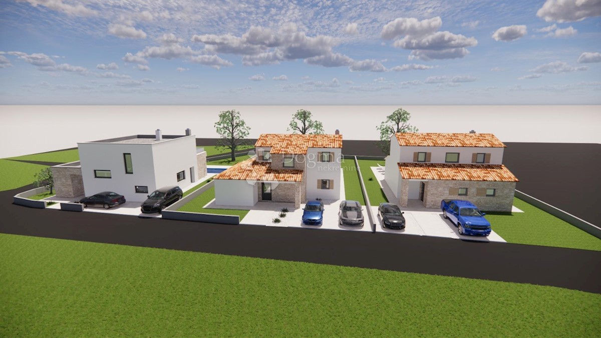 Prodaje se vila sa bazenom u izgradnji, mirno okruženje, okolica Poreča. Prizemlje se sastoji od ulaznog hodnika, prostranog dnevnog boravka sa kuhinjom i blagovaonicom, spavaće sobe sa kupaonicom, wc-a, tehničke prostorije te stepeništa koje vodi na prv