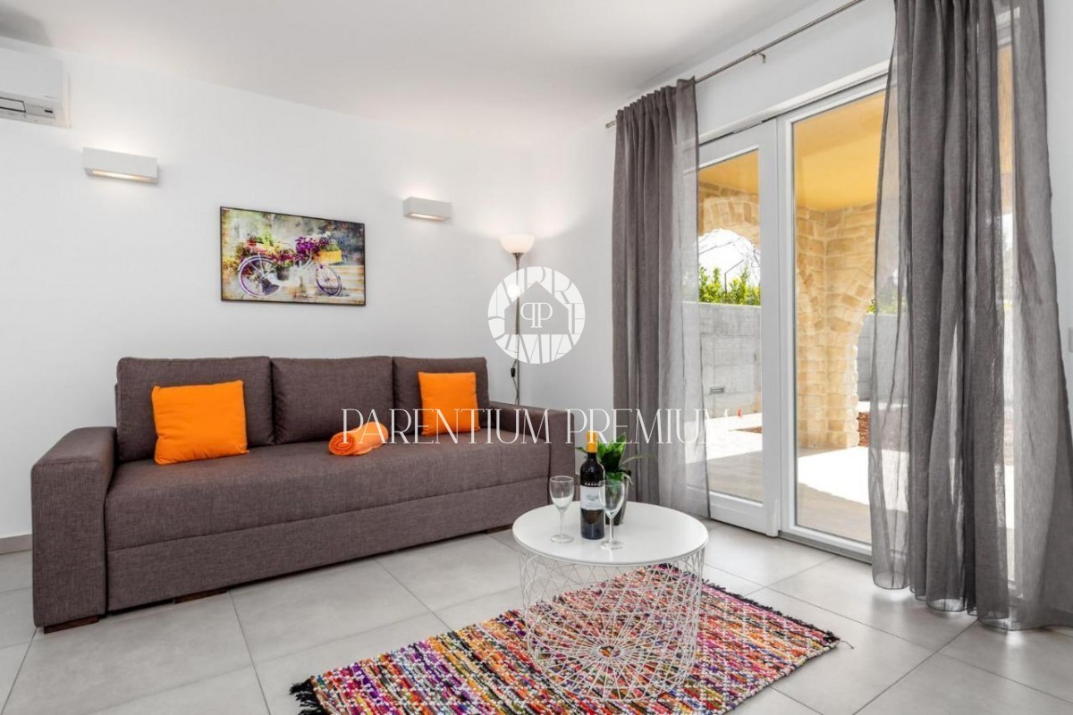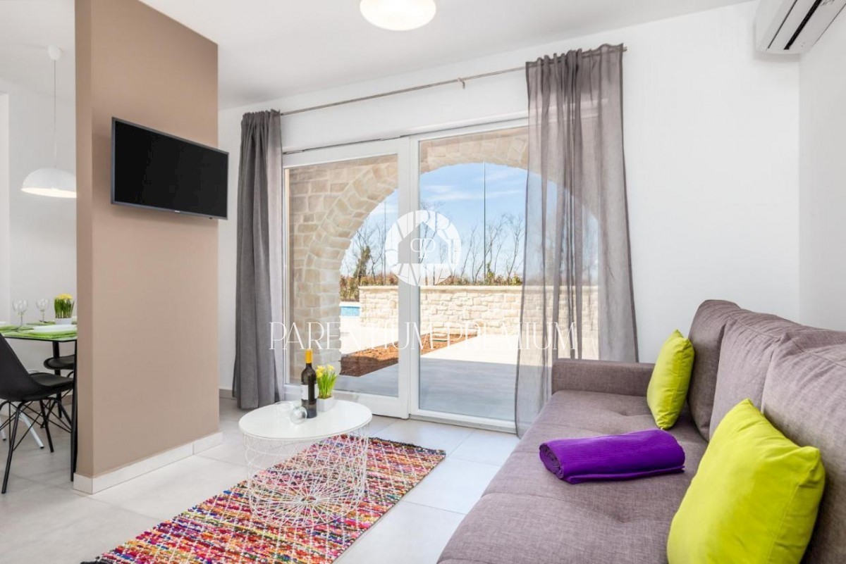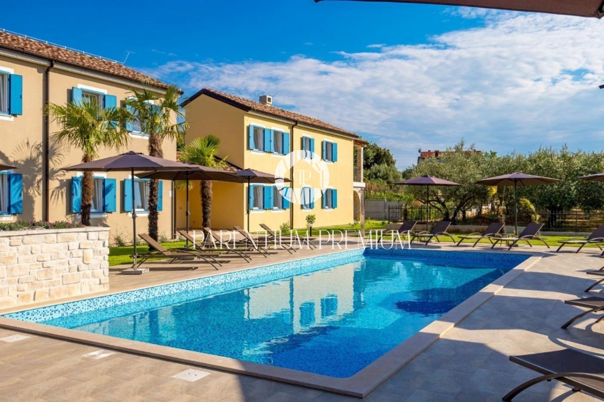 Istra, Poreč Na prodaju turistički kompleks od jedne kuće i šest odvojenih apartmana, a čine ga: Kuća površine 151 m2 koja se sastoji od prostranog dnevnog boravka, kuhinje s blagavaonicom, kupatila te dvije spavaće sobe. Dva apartmana površine 61m2 sv