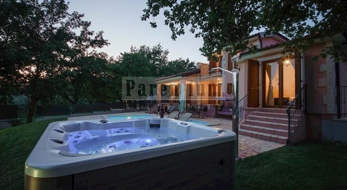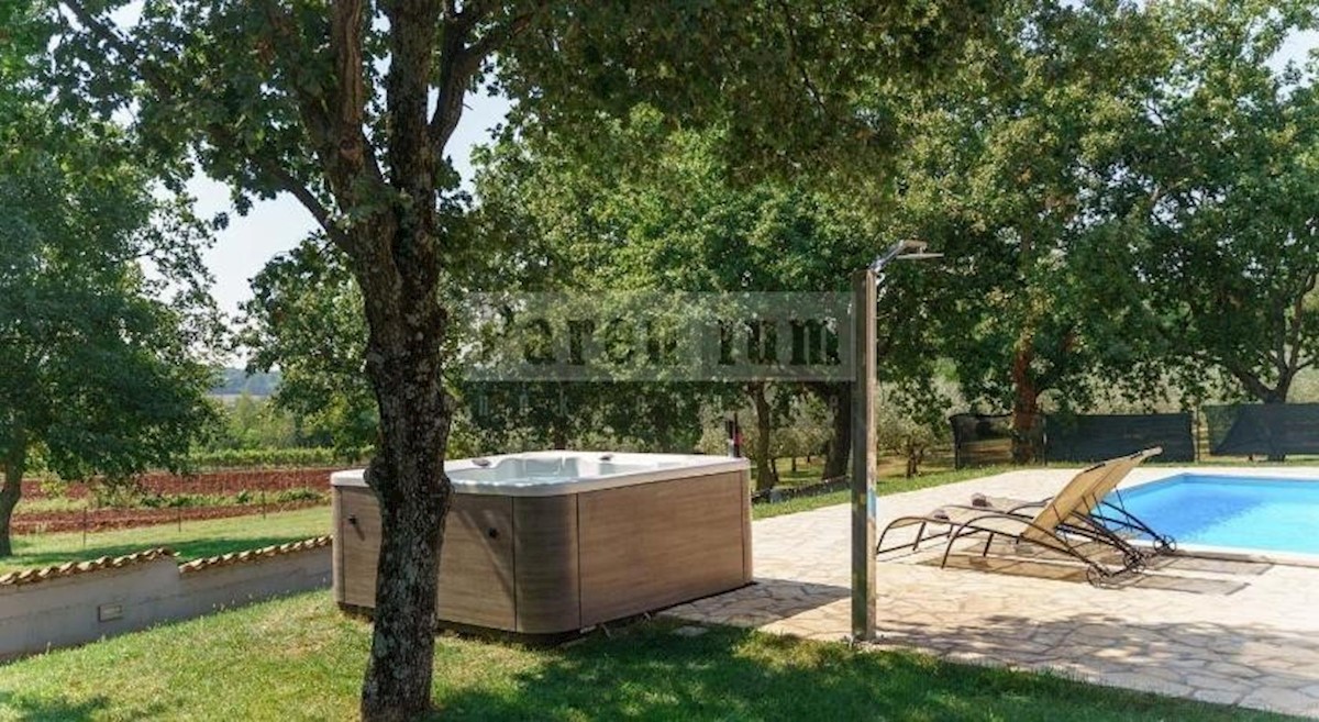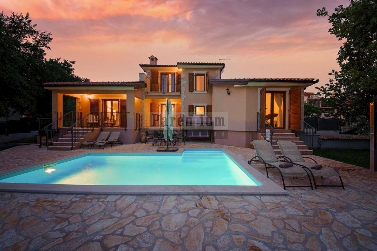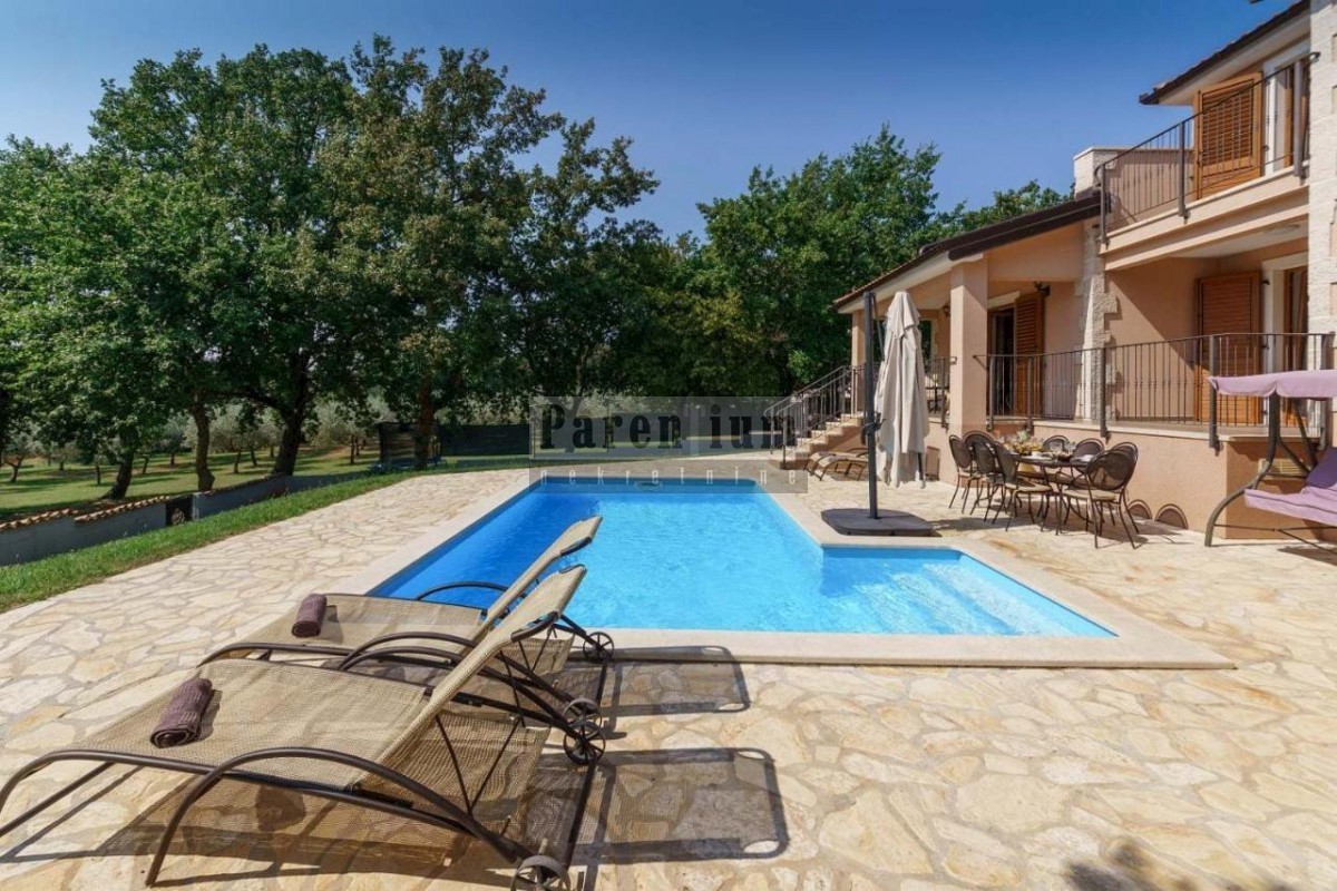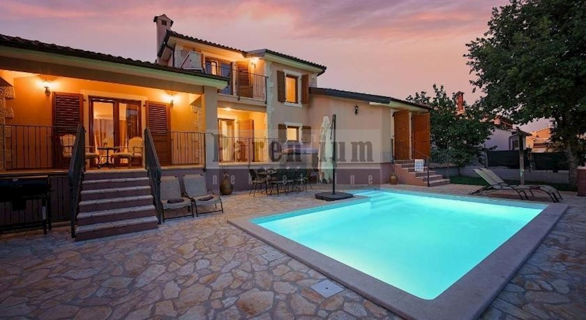 ISTRA - BLIZINA POREČA, Prodaje se elegantna rustikalna vila s bazenom u mirnom selu samo 5 minuta vožnje od mora i 10 minuta vožnje od centra Poreča. Izgrađena 2016. godine, ova prekrasna vila smještena je na vrlo mirnoj poziciji okružena hrastovom šum