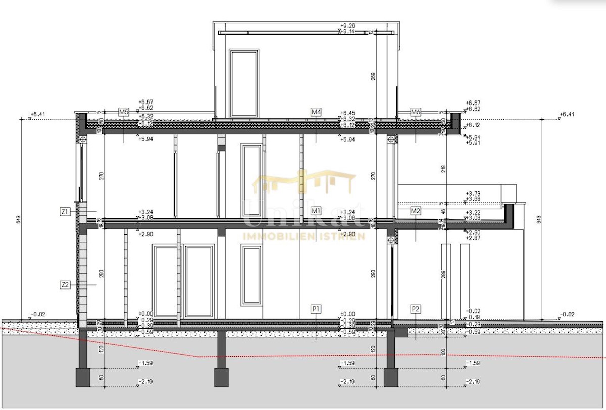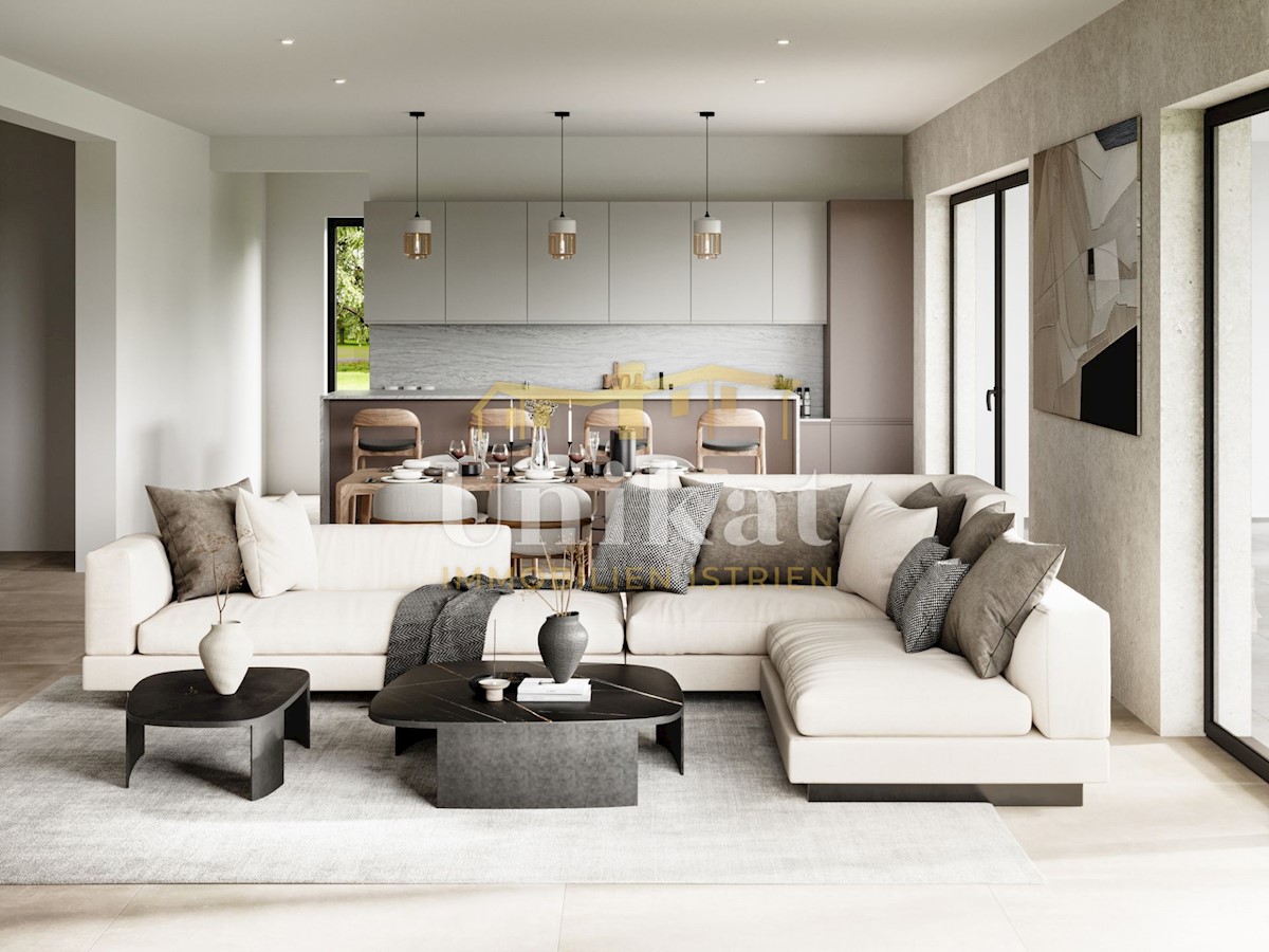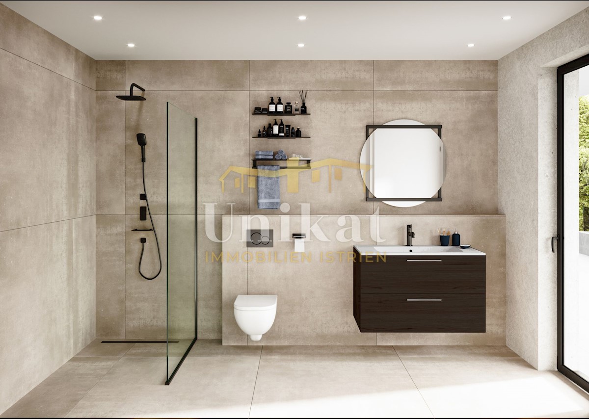 Luksuzna vila u izgradnji, smještena na parceli od 770 m2 i udaljena 3 km od mora i plaže. U prizemlju vile nalazit će se hodnik, praonica, spremište/tehnička soba, wc, wellness sa saunom i tušem, dnevni boravak s kaminom, kuhinja i blagovaonica i natkriv