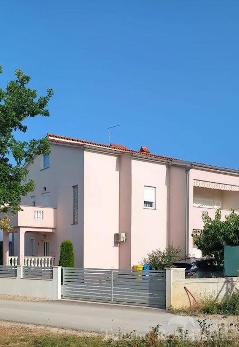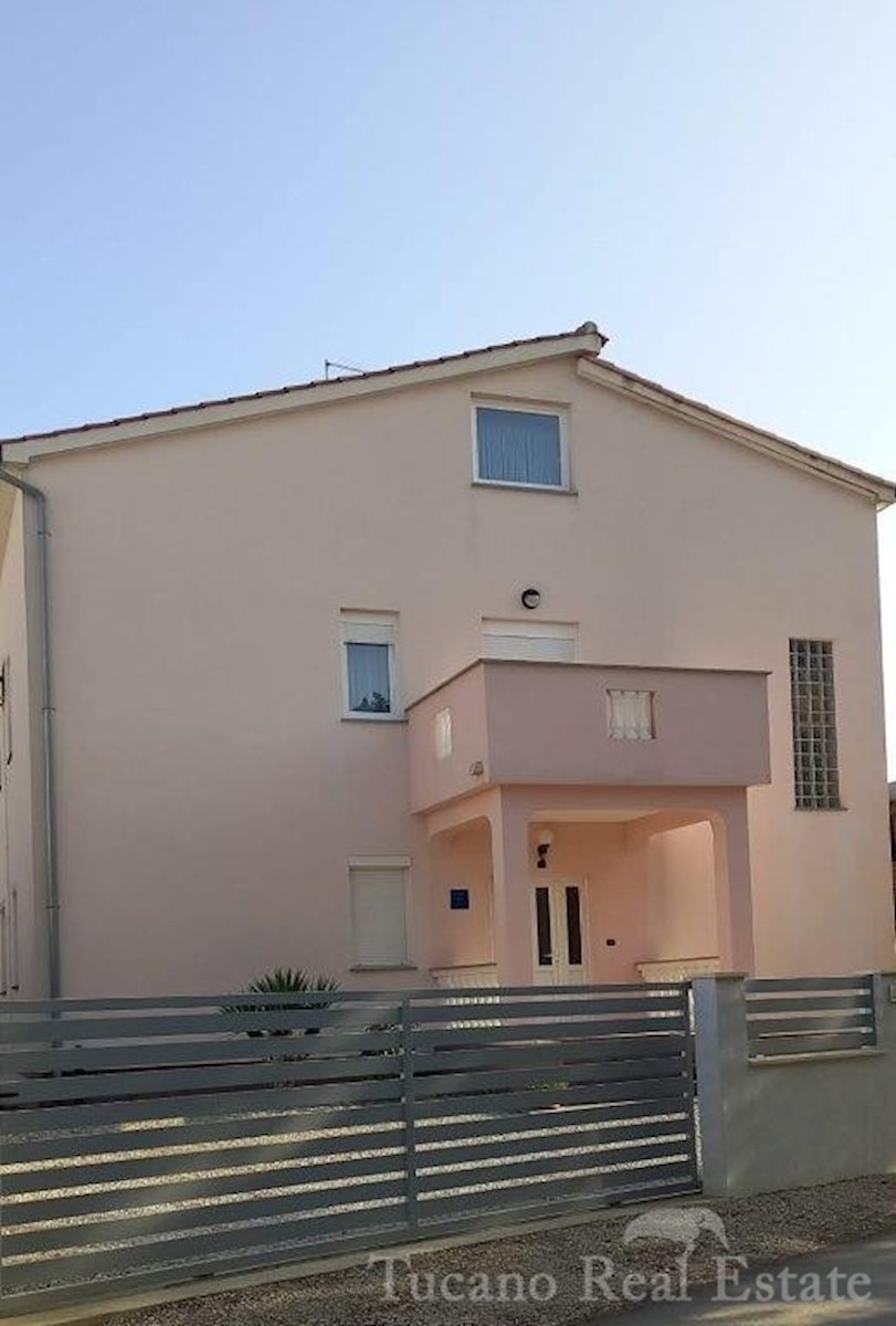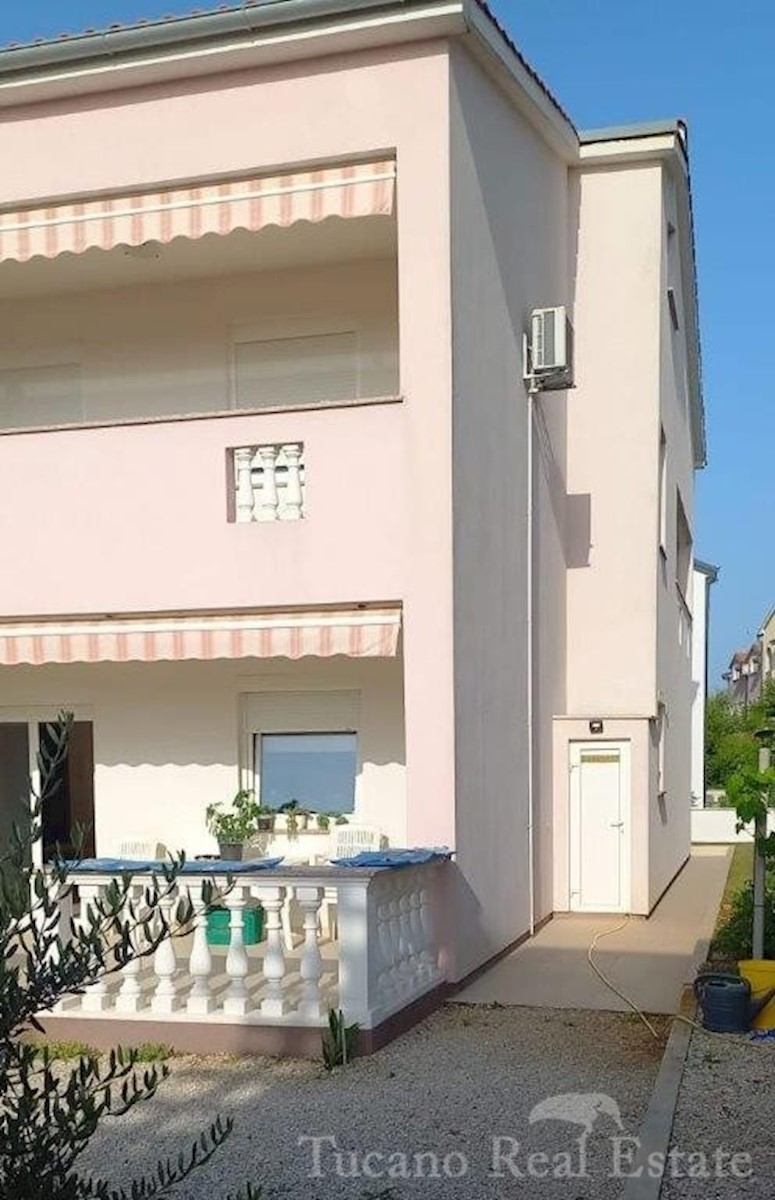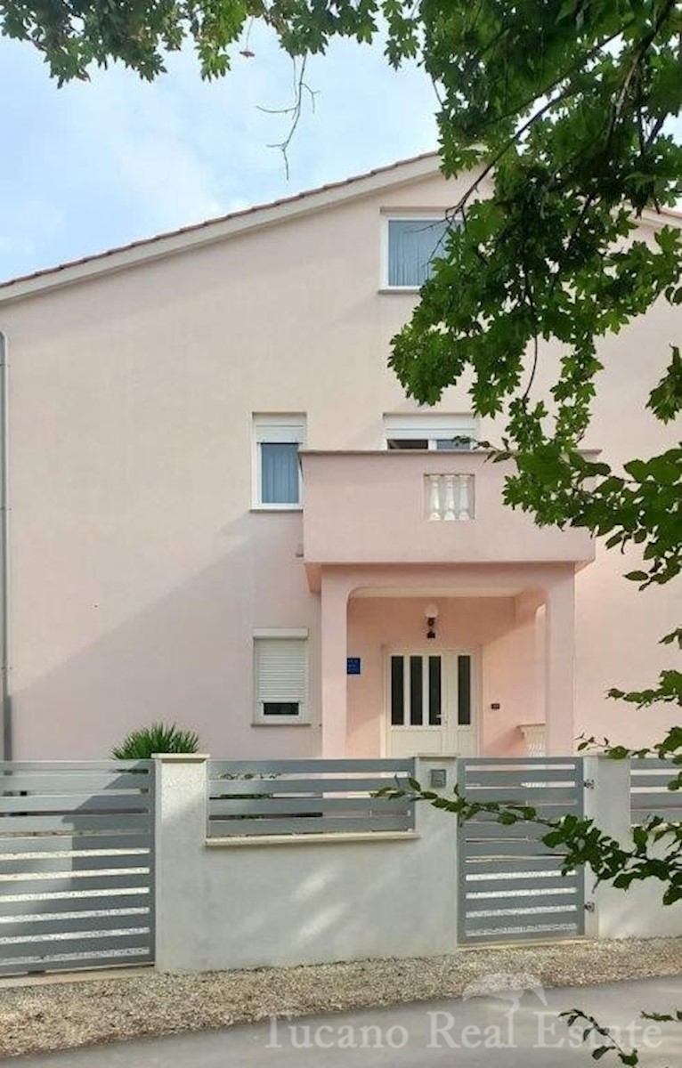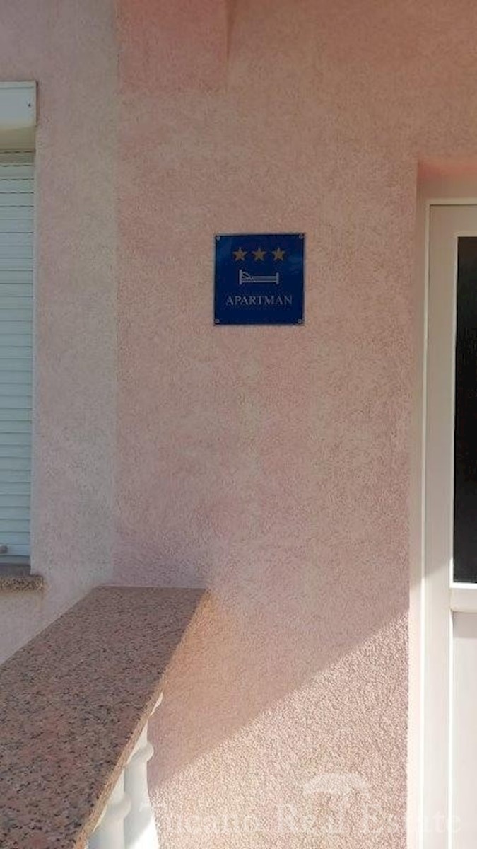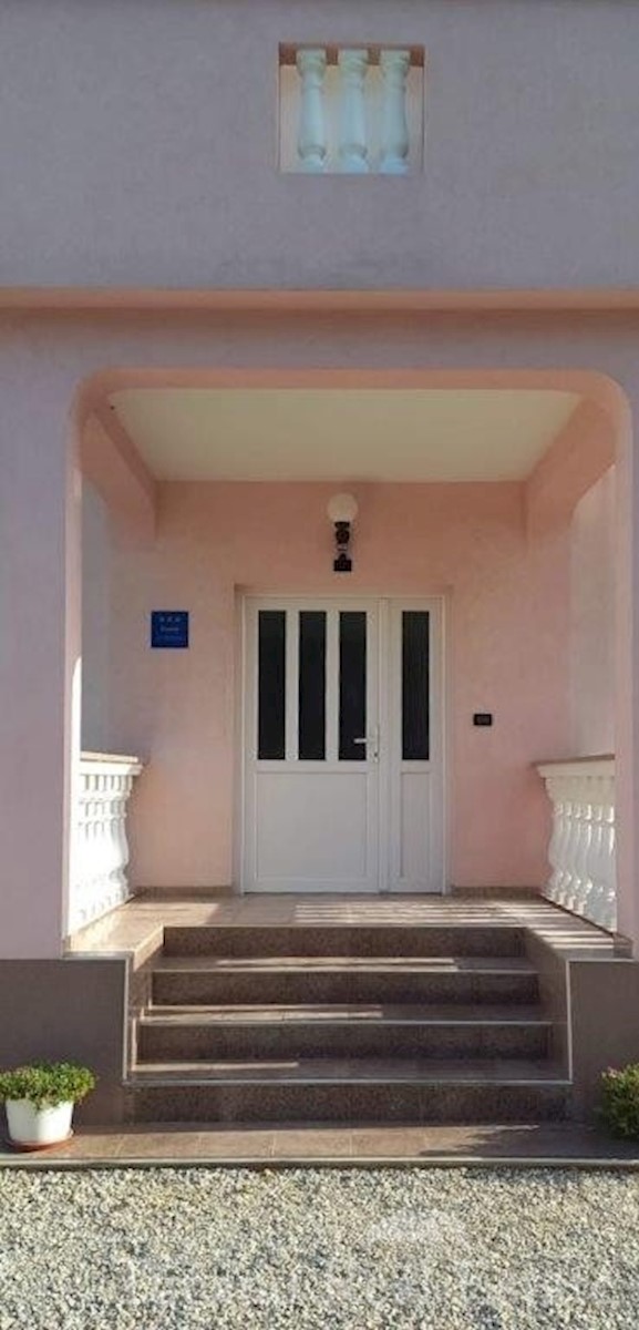 Samostojeća apartmanska kuća , 800 m od mora , na parceli od 545 m2 , ukupne stambene površine 370 m2 , u 3 etaže : Prizemlje : komforan trosoban stan od 130 m2 , sa kuhinjom , blagovaonicom , dnevnim boravkom , 3 spavaće sobe i dvije kupaonice , spremiš