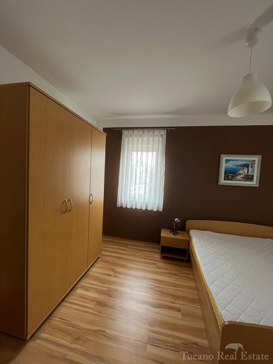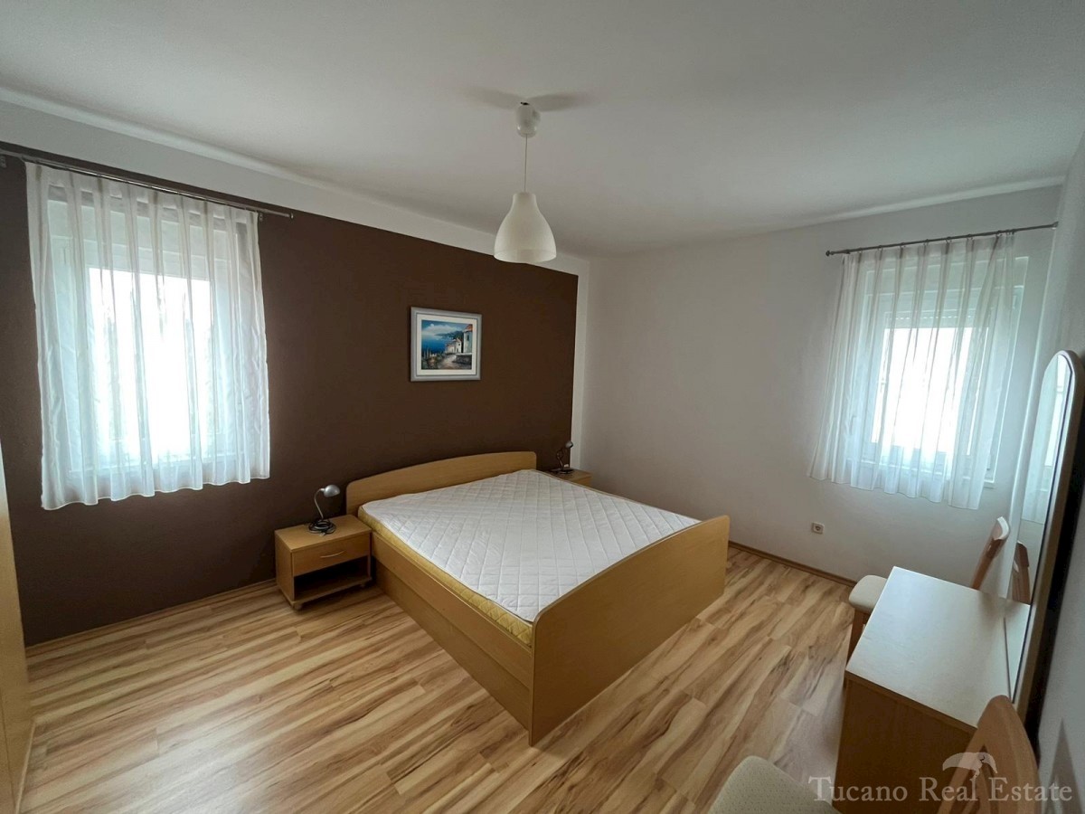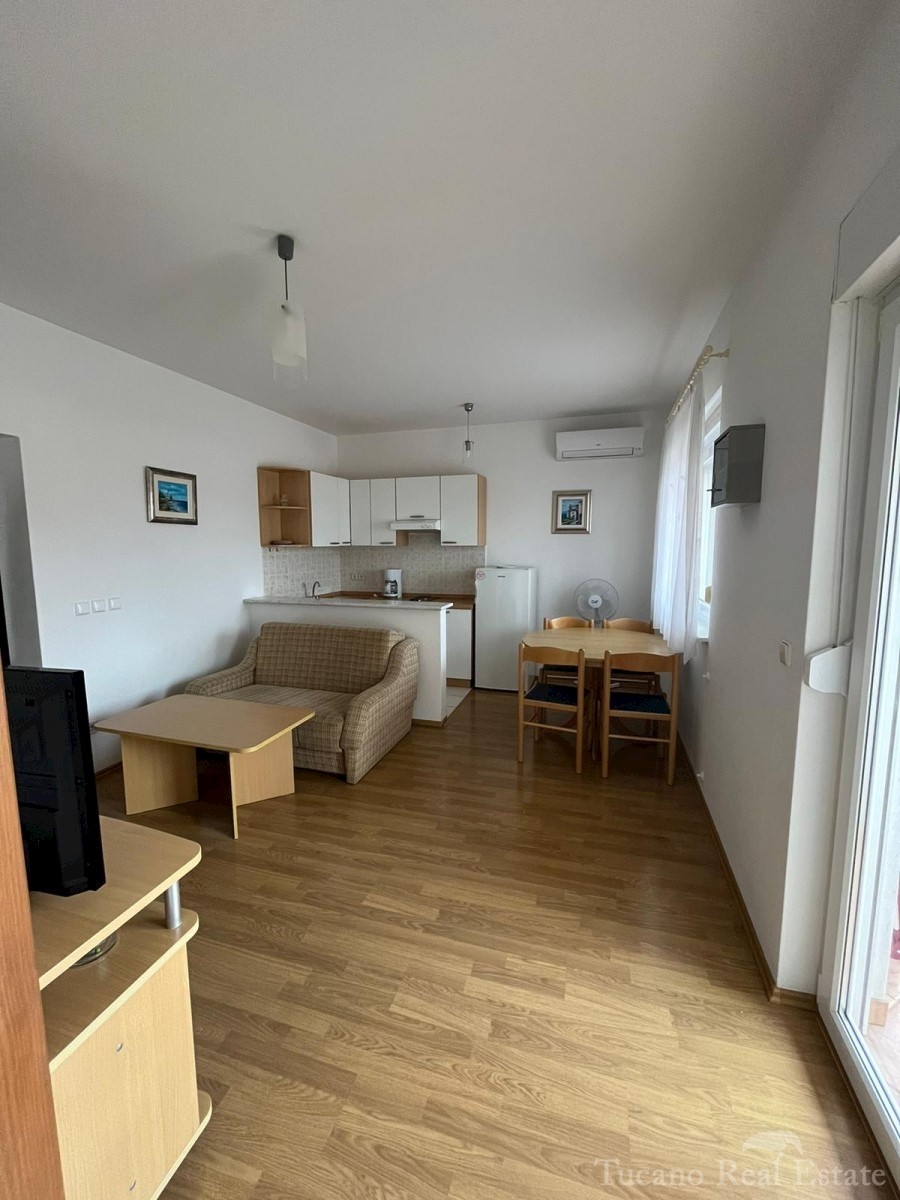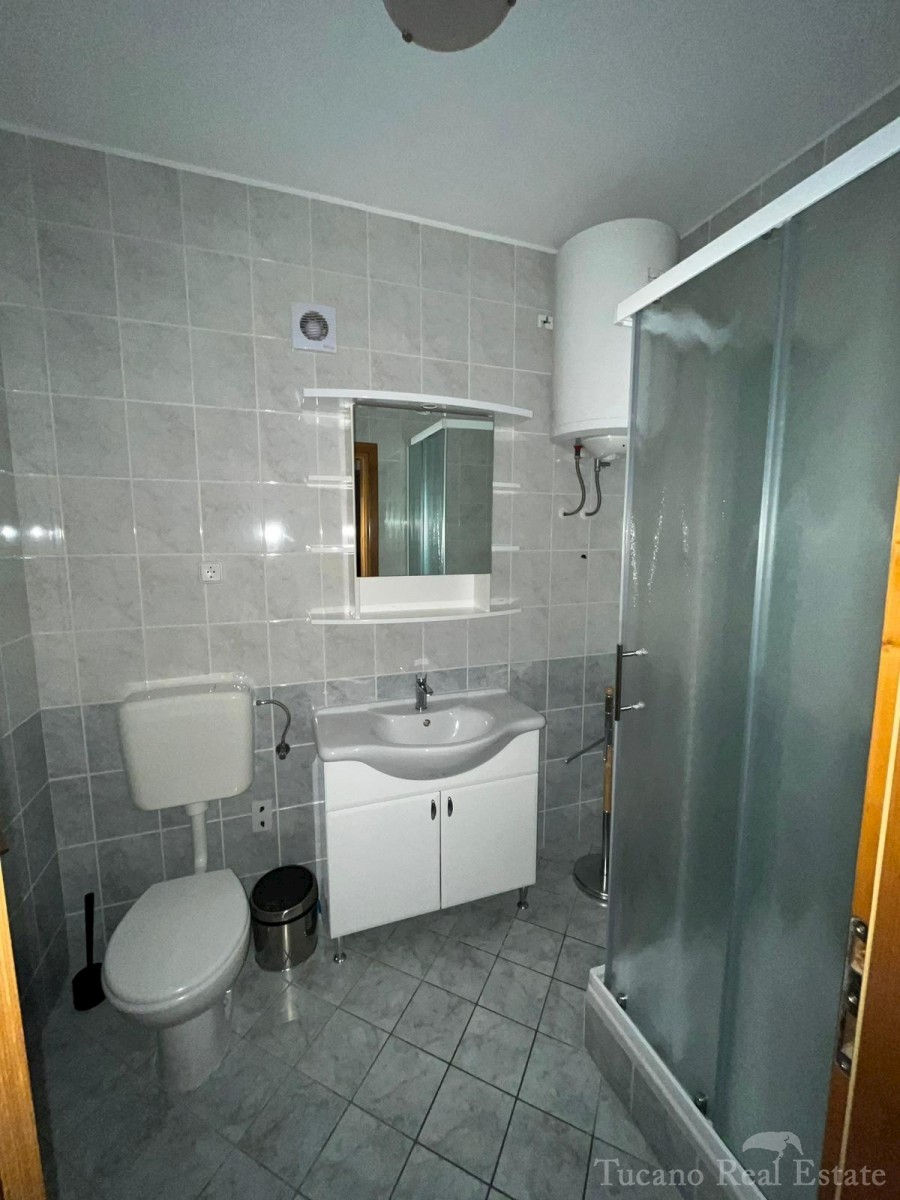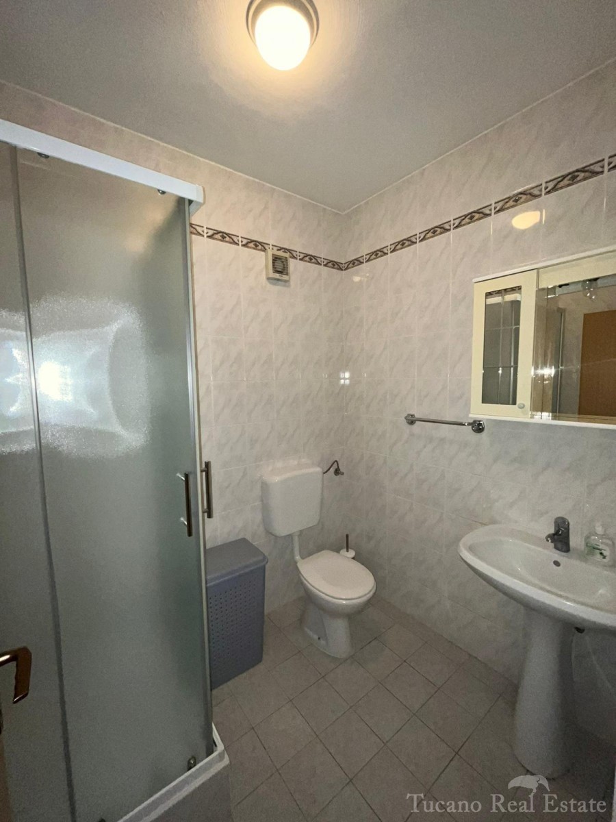 Samostojeća apartmanska kuća , 800 m od mora , na parceli od 545 m2 , ukupne stambene površine 370 m2 , u 3 etaže : Prizemlje : komforan trosoban stan od 130 m2 , sa kuhinjom , blagovaonicom , dnevnim boravkom , 3 spavaće sobe i dvije kupaonice , spremiš