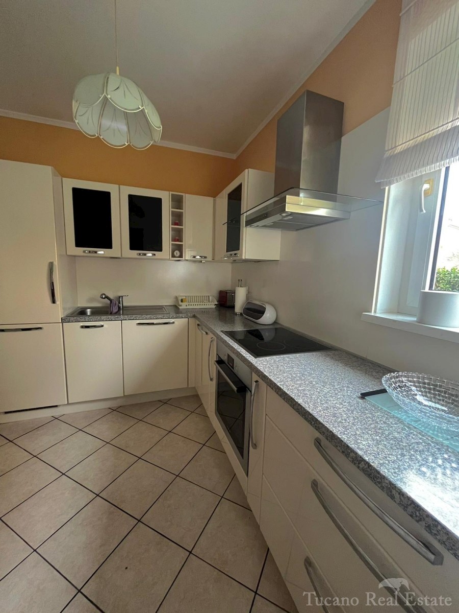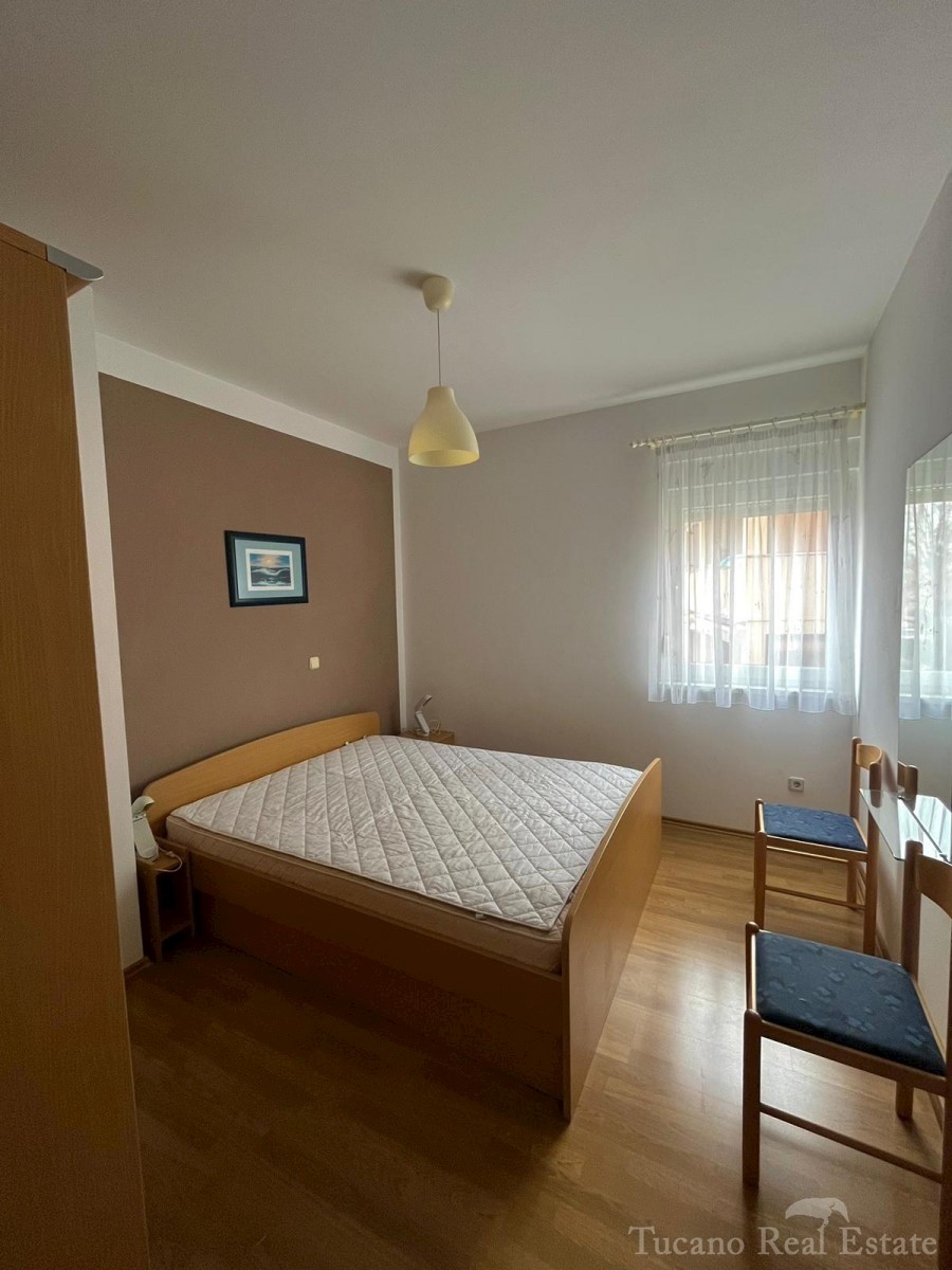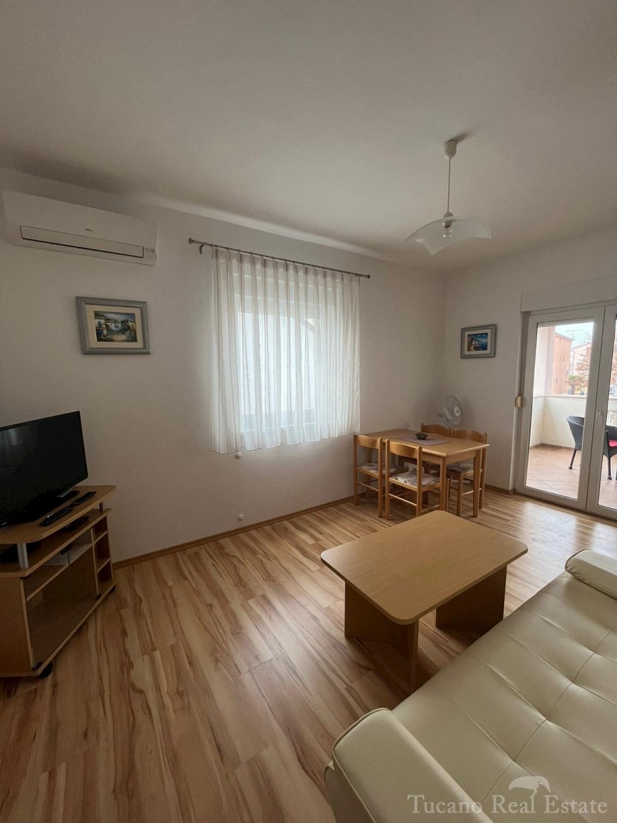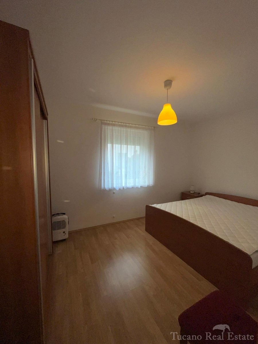 Samostojeća apartmanska kuća , 800 m od mora , na parceli od 545 m2 , ukupne stambene površine 370 m2 , u 3 etaže : Prizemlje : komforan trosoban stan od 130 m2 , sa kuhinjom , blagovaonicom , dnevnim boravkom , 3 spavaće sobe i dvije kupaonice , spremiš