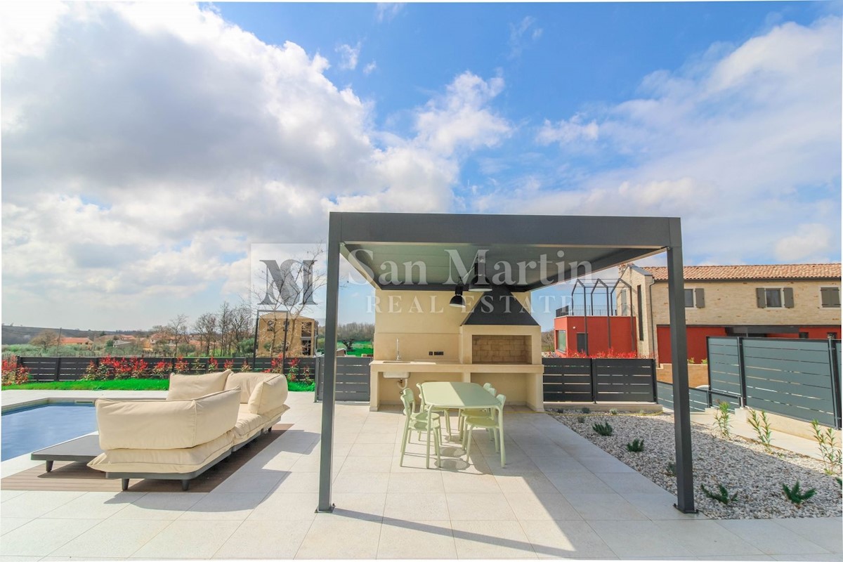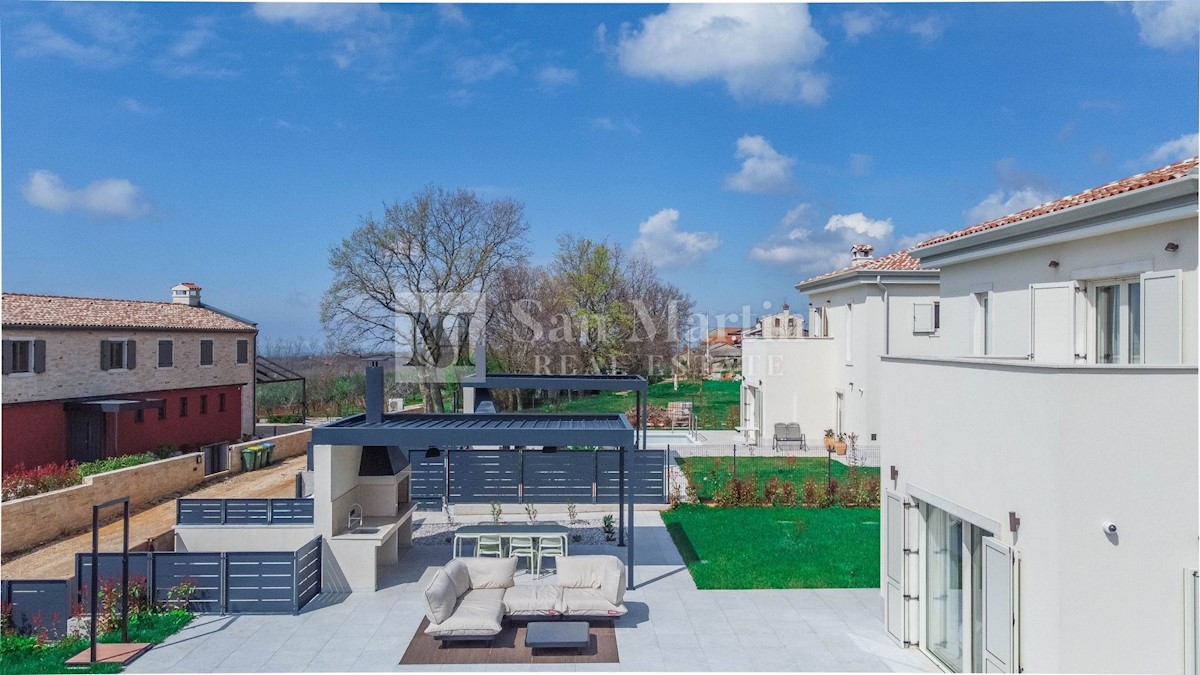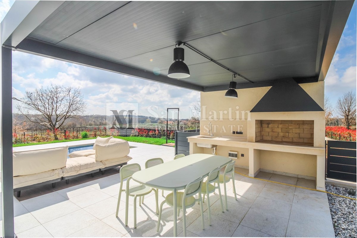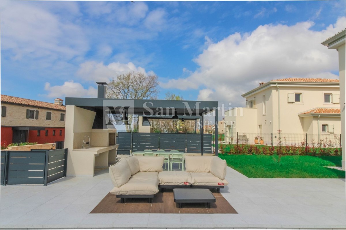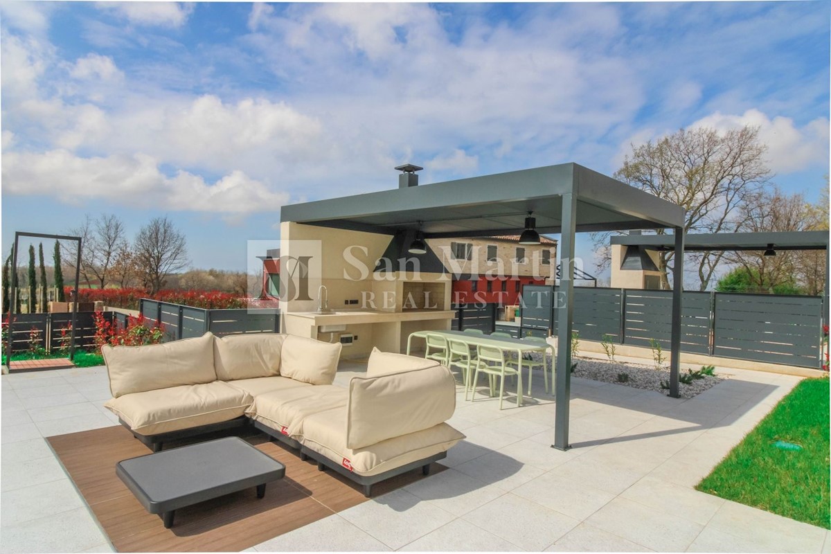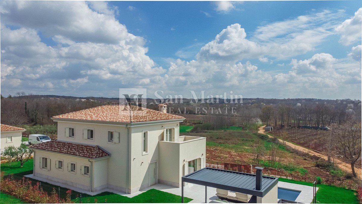 Poreč - okolica U mjestu nedaleko od Poreča smjestila se ova atraktivna kuća modernog uređenja. Ova novoizgrađena kuća se nalazi na rubu lijepog naselja sa kojega se pružaju lijepi pogledi na vinograde i zelenilo. Njena površina iznosi cca 180 m, te se