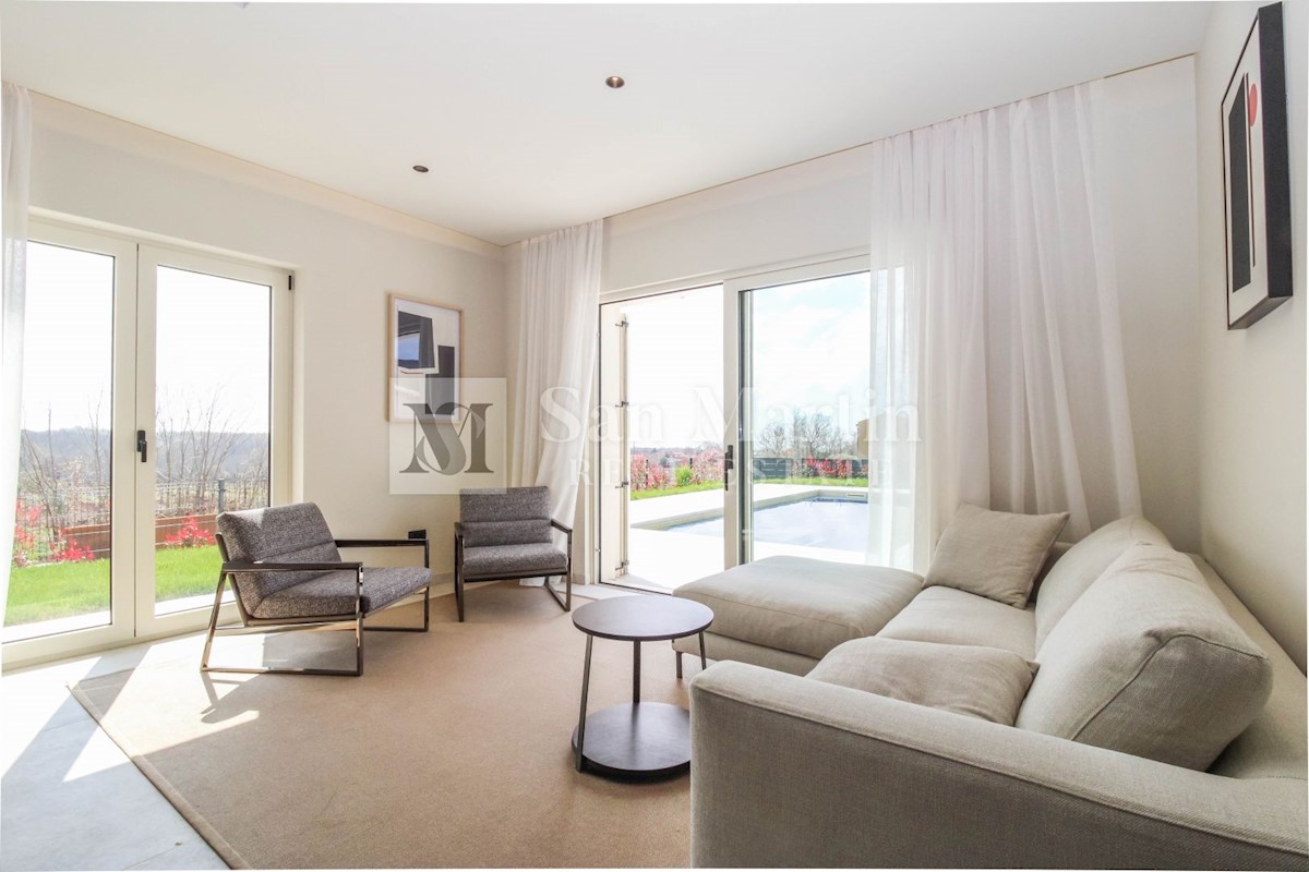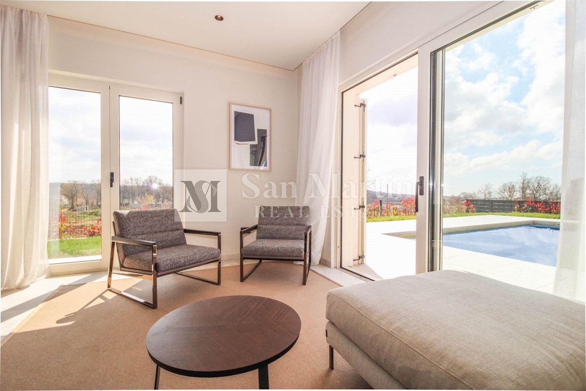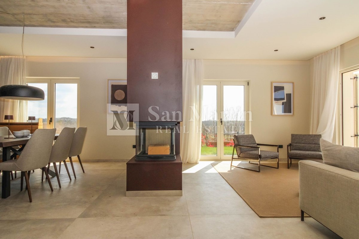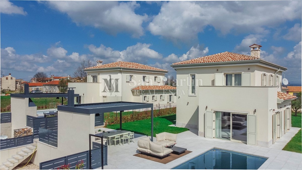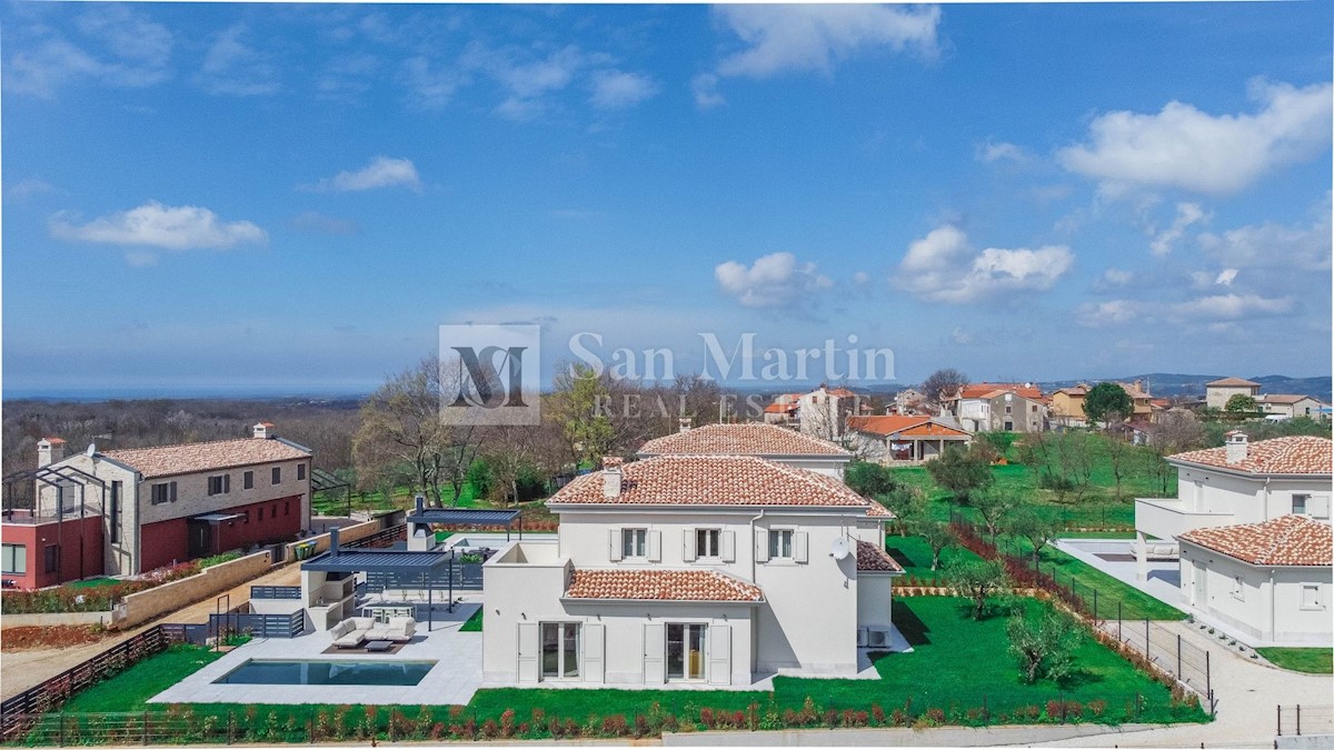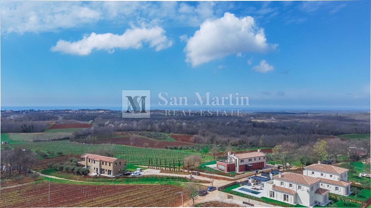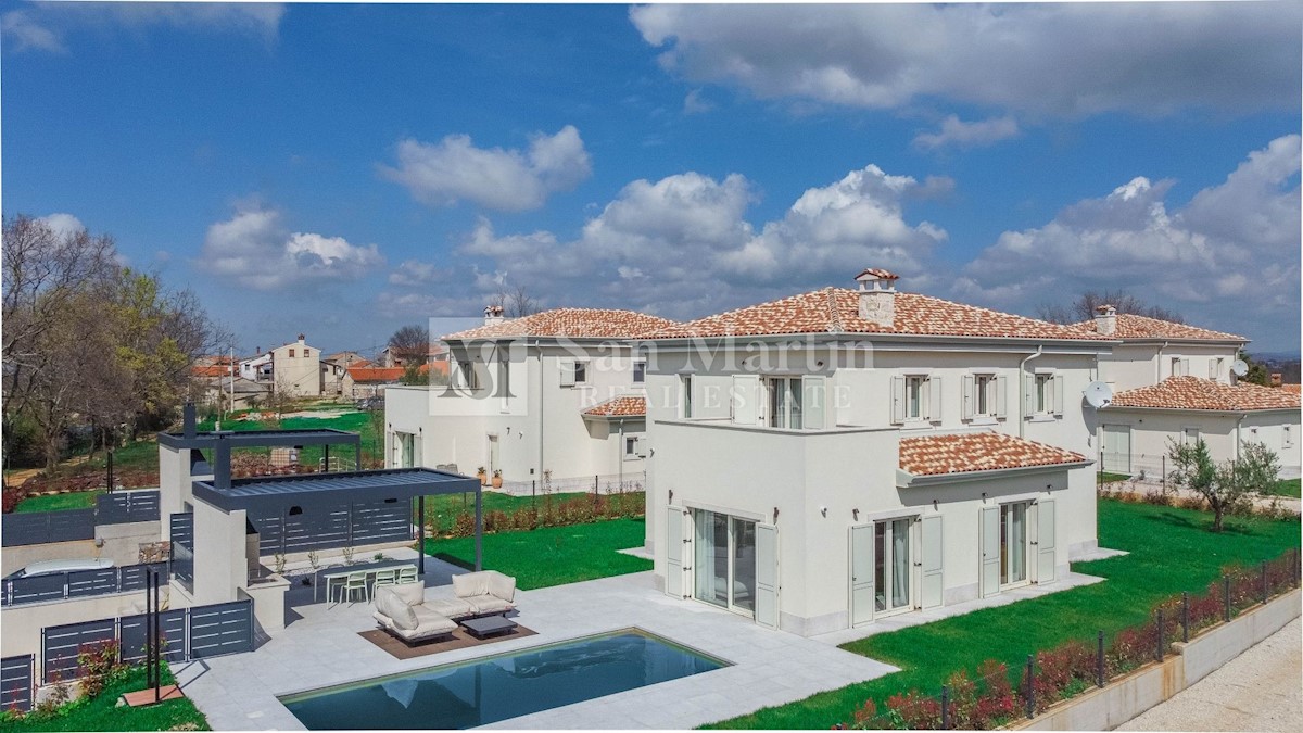 Poreč - okolica U mjestu nedaleko od Poreča smjestila se ova atraktivna kuća modernog uređenja. Ova novoizgrađena kuća se nalazi na rubu lijepog naselja sa kojega se pružaju lijepi pogledi na vinograde i zelenilo. Njena površina iznosi cca 180 m, te se
