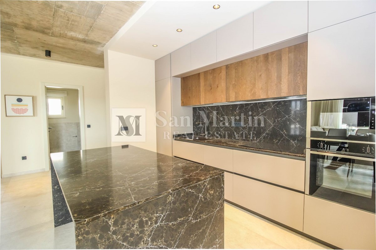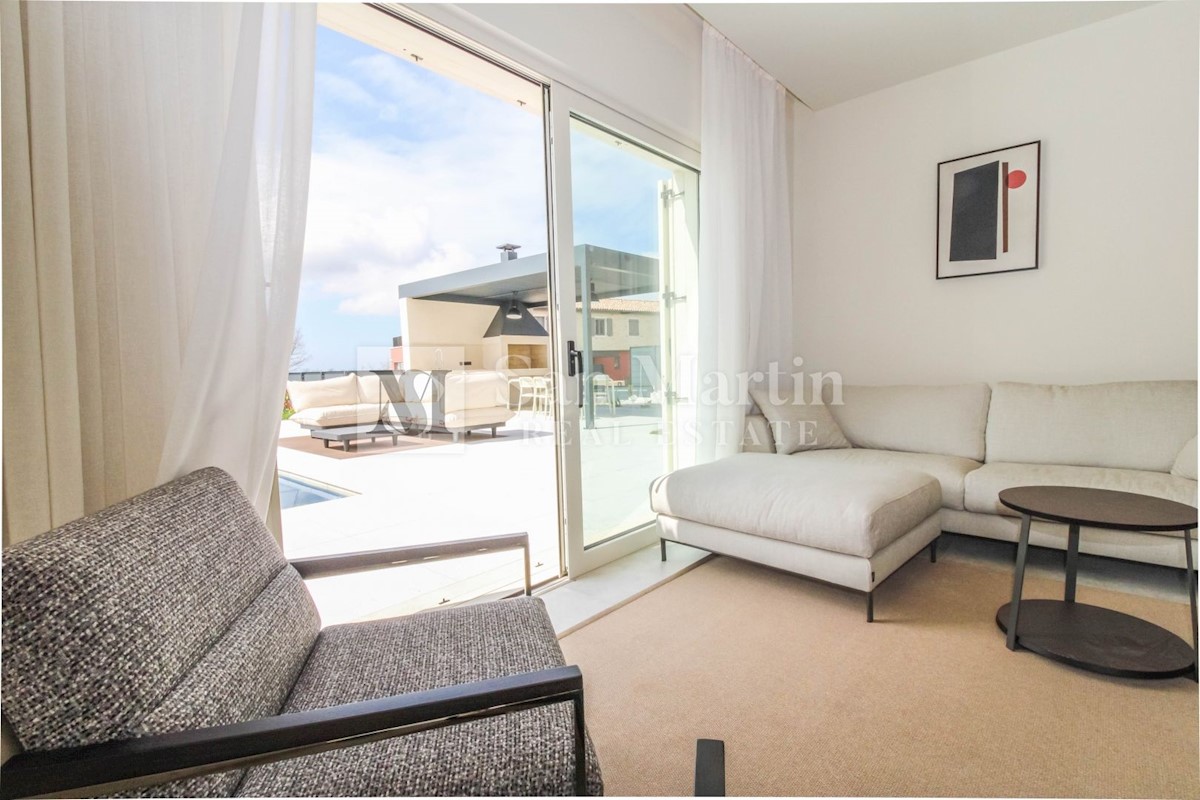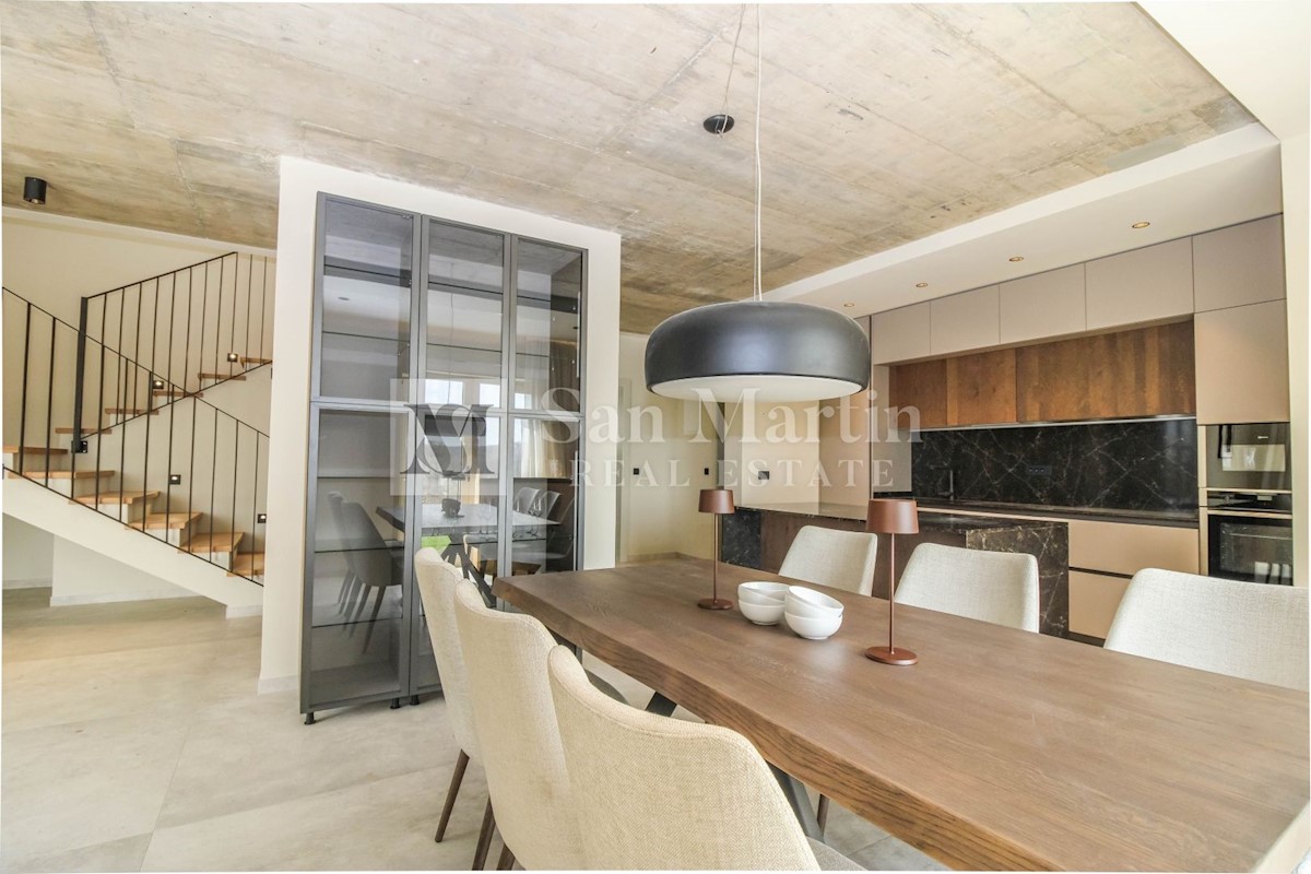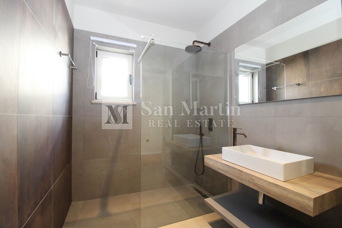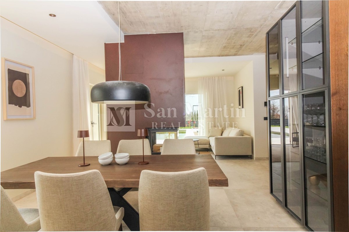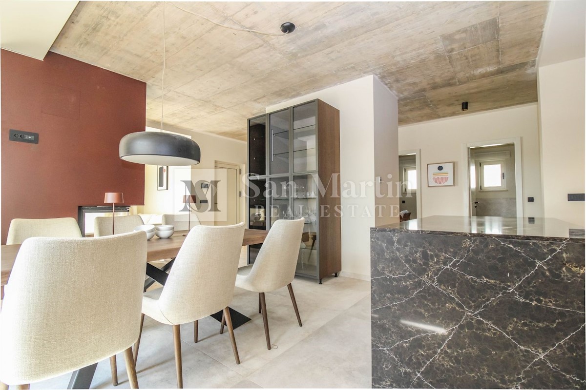 Poreč - okolica U mjestu nedaleko od Poreča smjestila se ova atraktivna kuća modernog uređenja. Ova novoizgrađena kuća se nalazi na rubu lijepog naselja sa kojega se pružaju lijepi pogledi na vinograde i zelenilo. Njena površina iznosi cca 180 m, te se