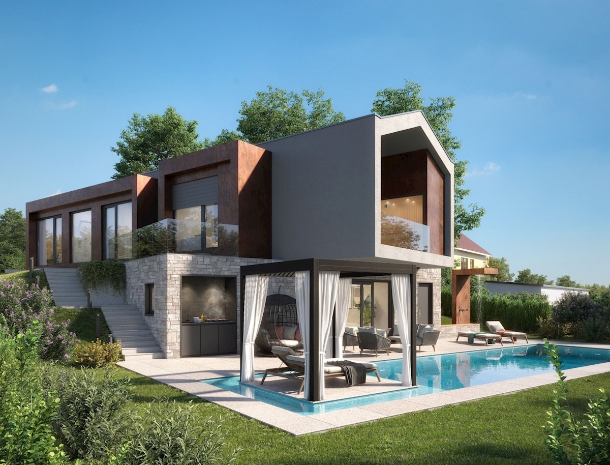Projekt- Moderna luksuzna Vila sa bazenom, ca. 13 kn od Poreča i mora, na parceli od 873 m2- vila ima 200 m2 - Uređeni vrt sa grijanim bazenom od 56m2 sa sunčalištem- 4 spavaće sobe, 3 kupatila, 1 wc. Sve prostorije su klimatizirane i cijela kuća je sa po
