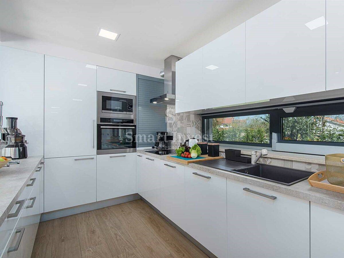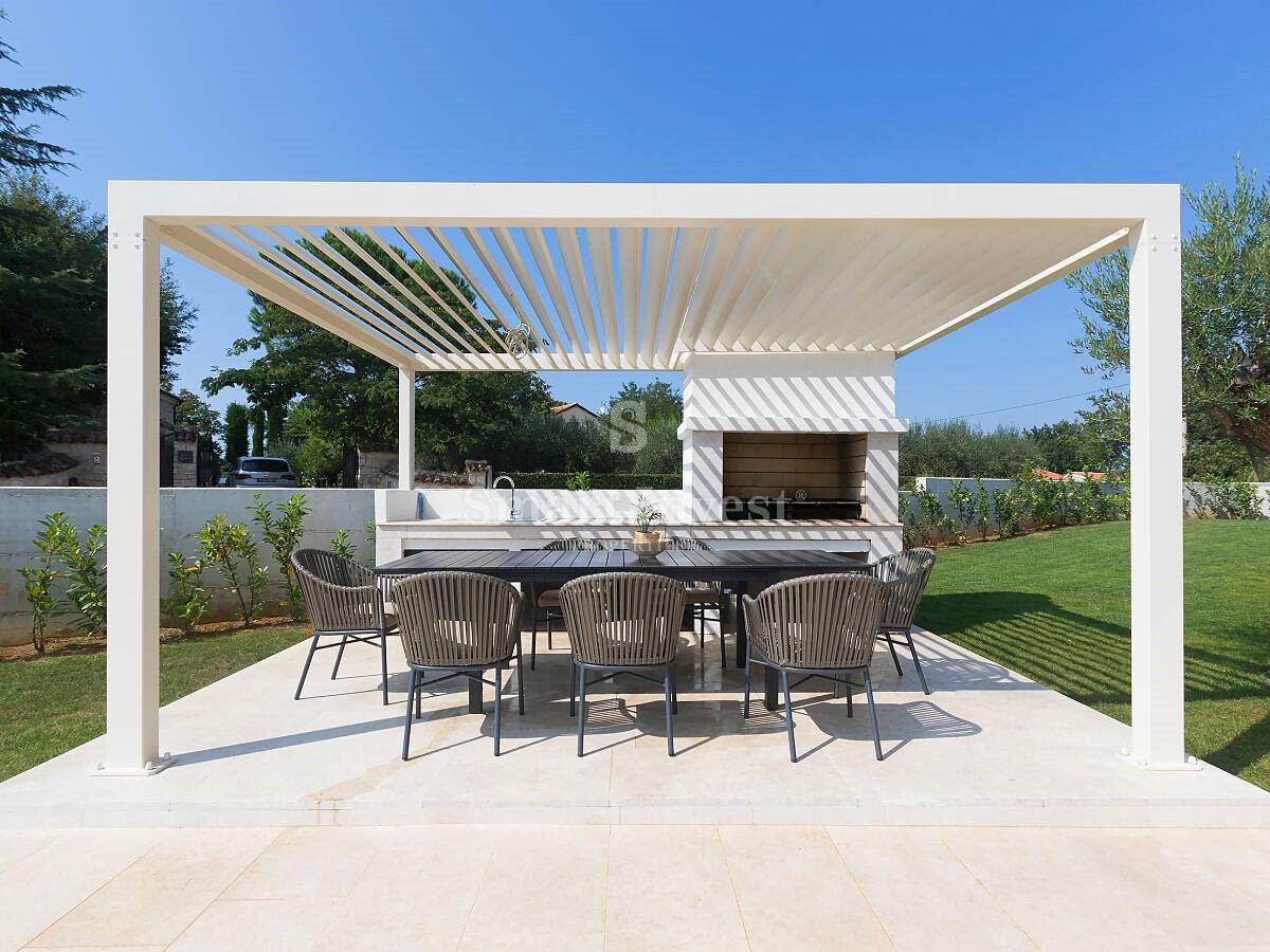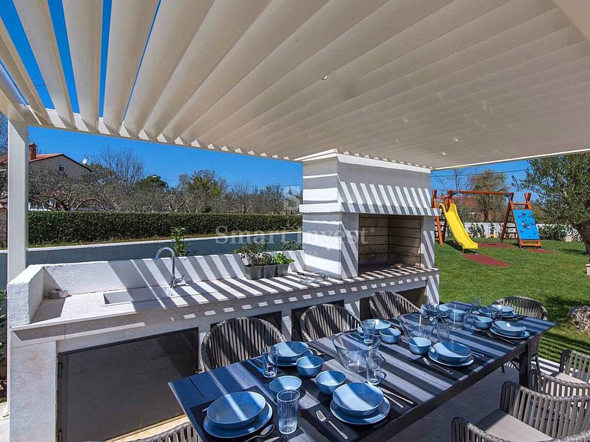 POREČ okolica, Na prodaju je atraktivna moderna vila s grijanim bazenom na lijepoj mirnoj lokaciji u malom istarskom selu nedaleko od Poreča. Kuća neto površine 201,38 m2 smještena je na lijepo uređenom zemljištu površine 1.065 m2, ima 4 spavaće sobe, 4