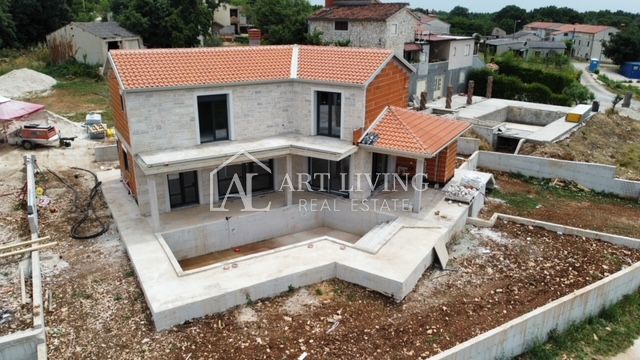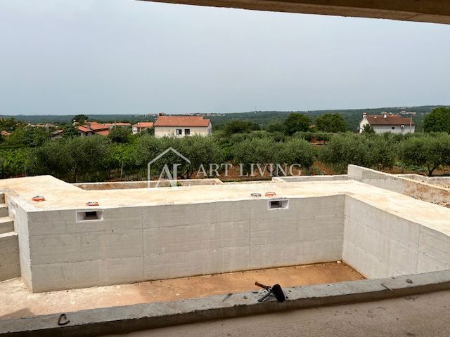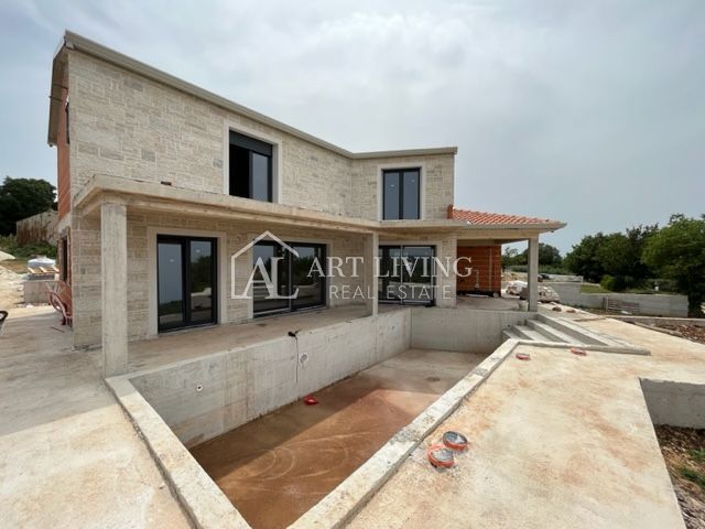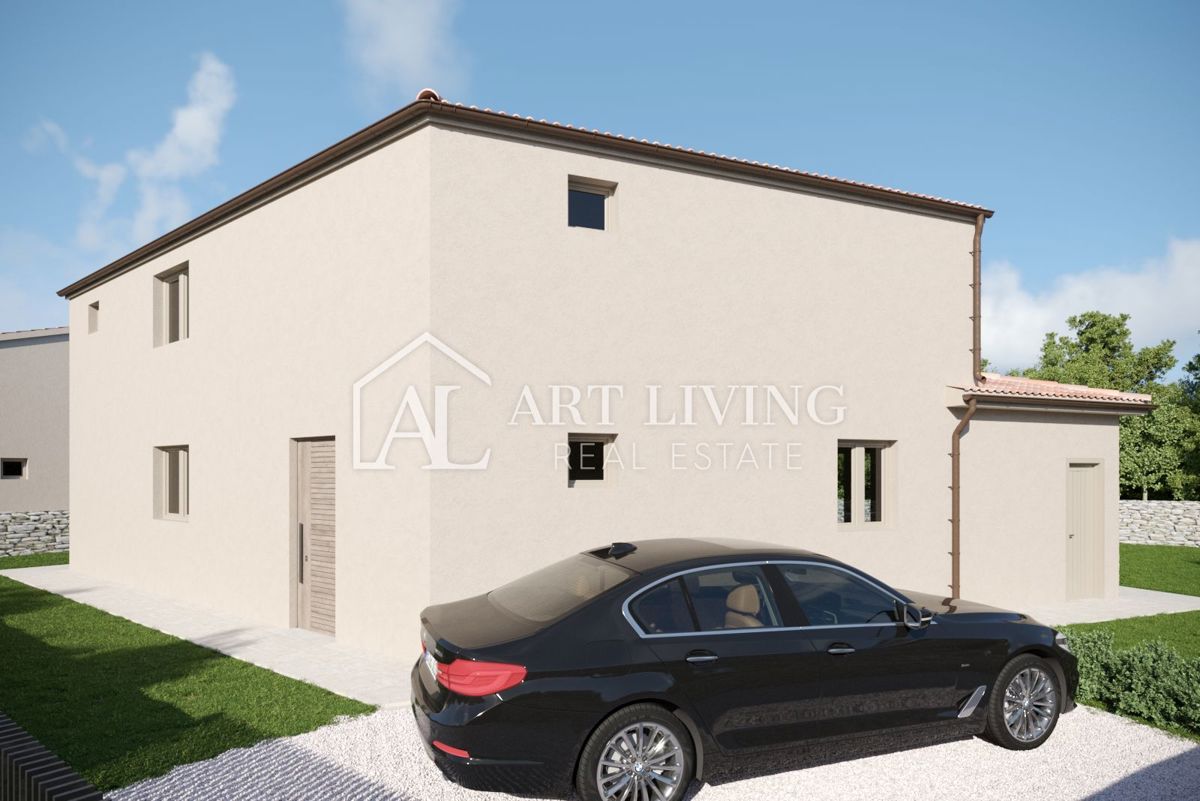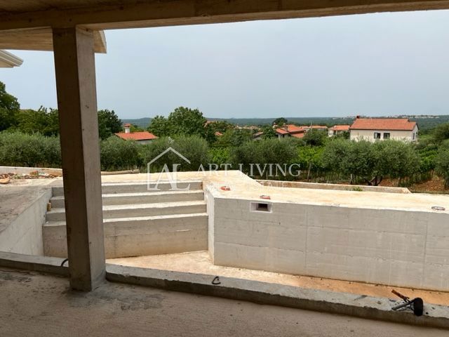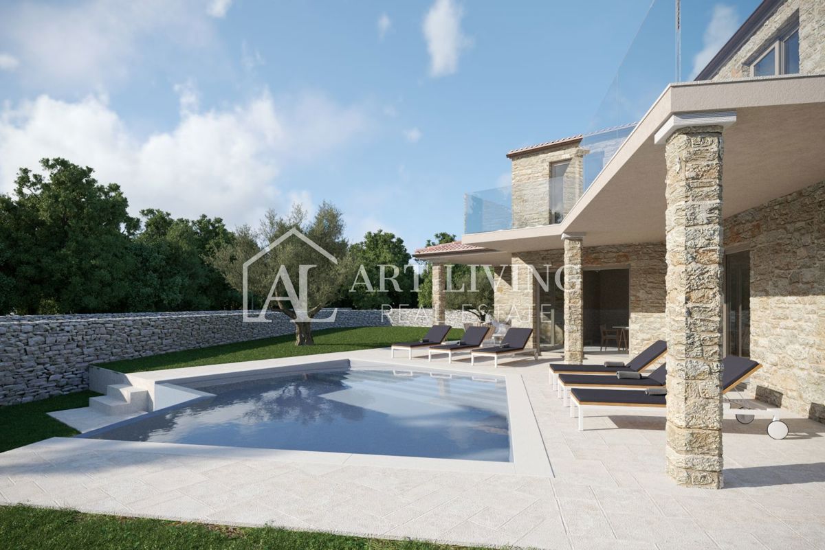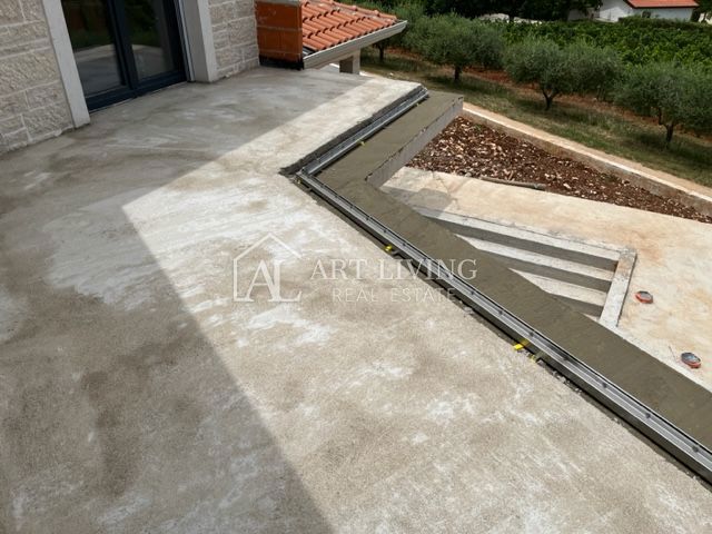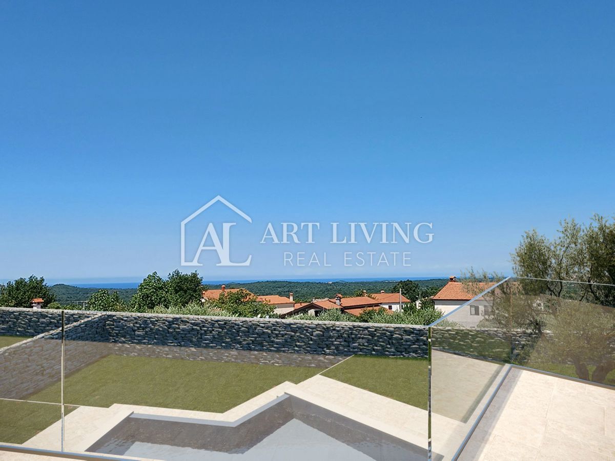 Poreč, okolica, Prodaje se prekrasna Vila u istarskom stilu moderne arhitekture s bazenom i otvorenim pogledom na more i pejzaž. Vila je smještena na mirnoj lokaciji i okružena prirodom i zelenilom. Udaljena je 8 km od mora i grada Poreča. Ova šarmantna