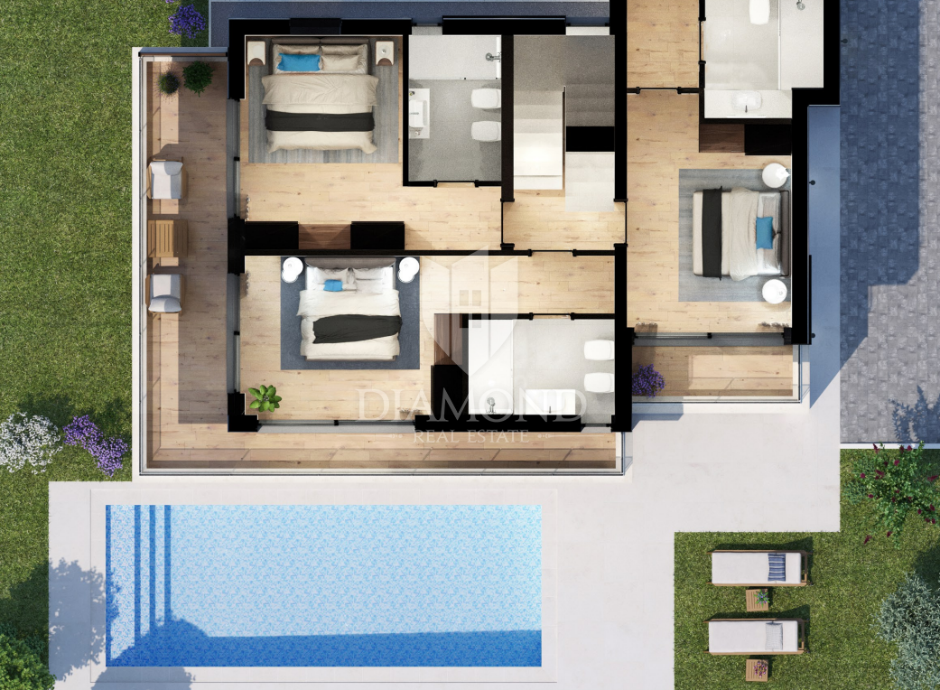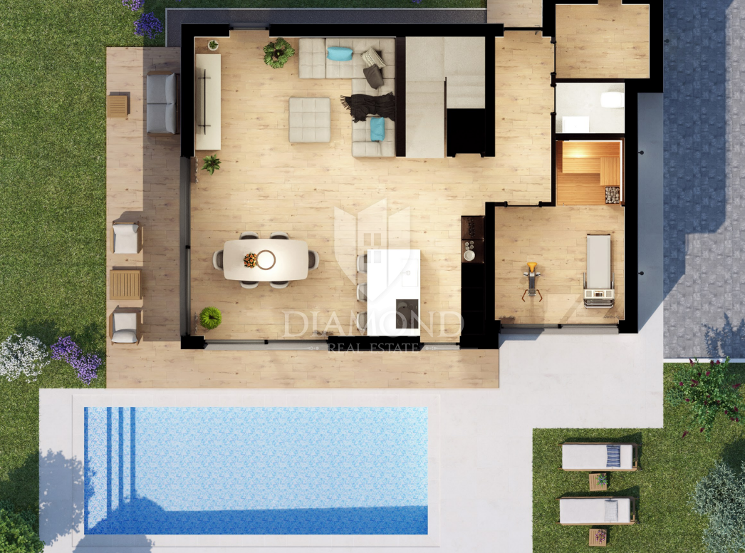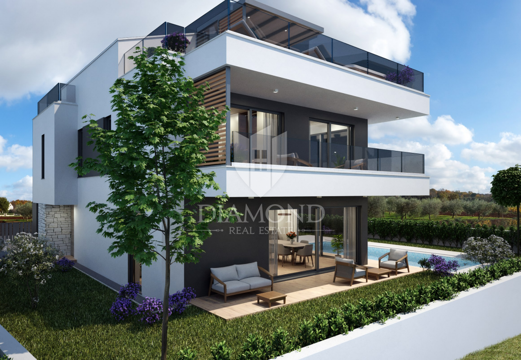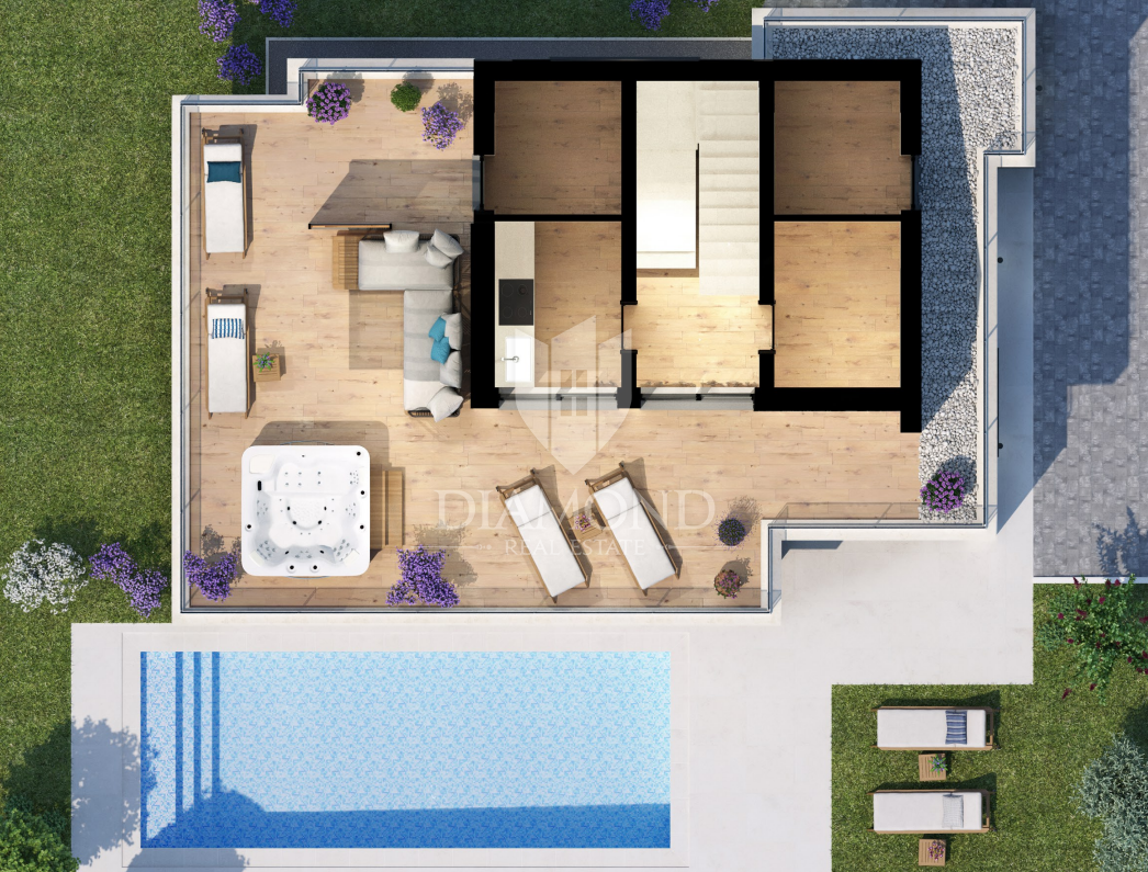 Poreč, luksuzna moderna vila 4 km od mora! Ova se impozantna i prostrana vila smjestila u mirnom djelu manjeg mjesta u predgrađu Poreča. Mjesto je udaljeno od samog centra i prvih plaža svega 4 km. Vila je smještena na zemljištu od 543 m2 i njena površi