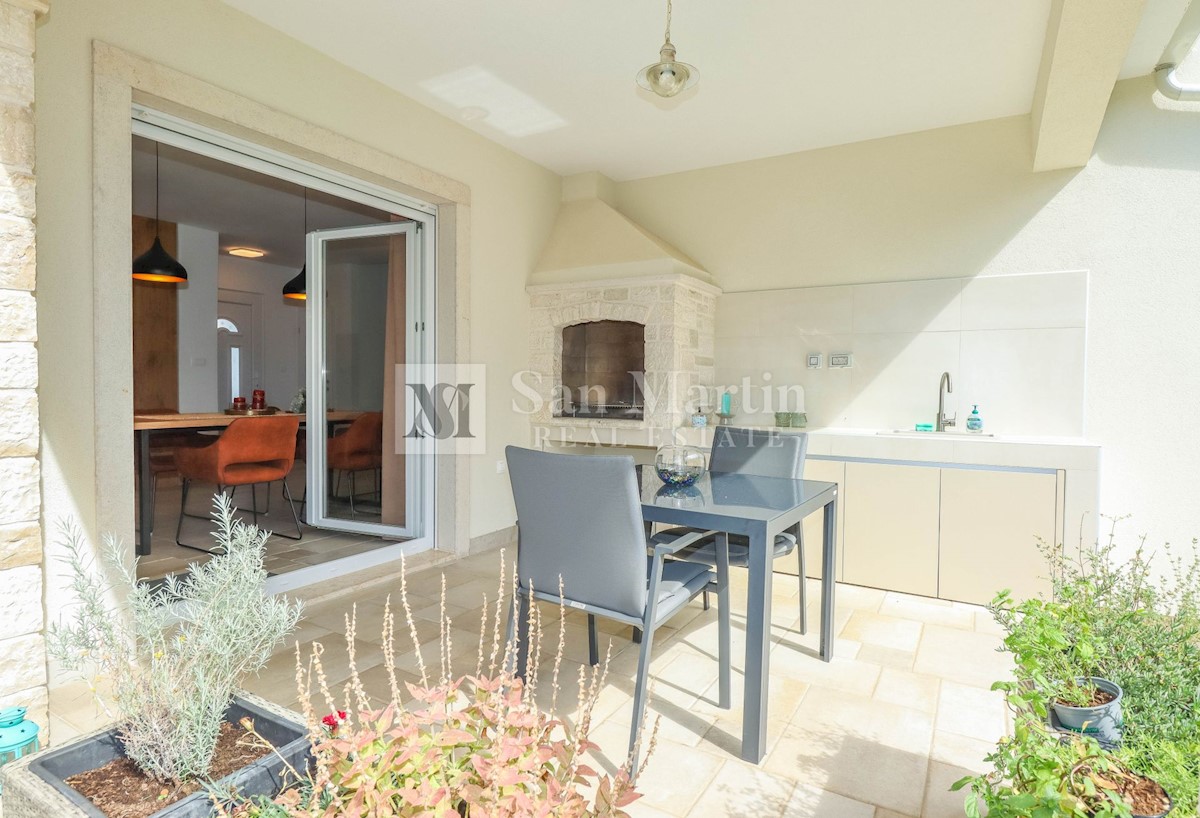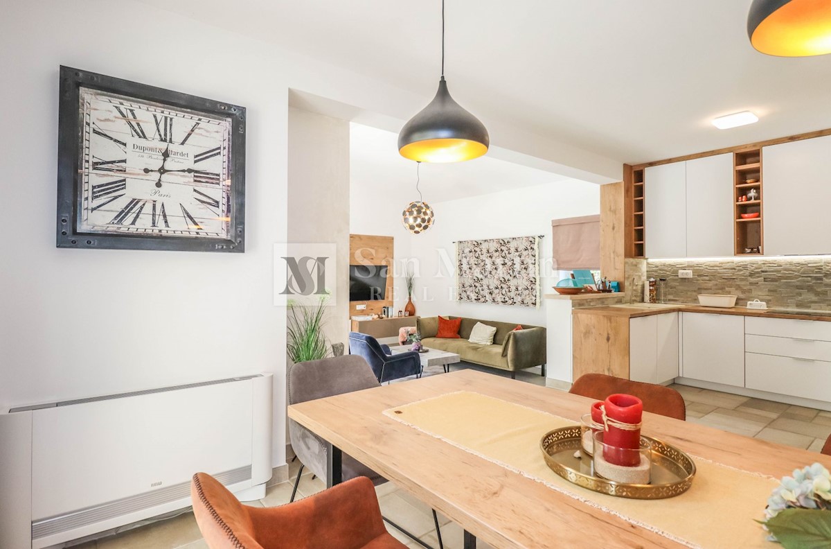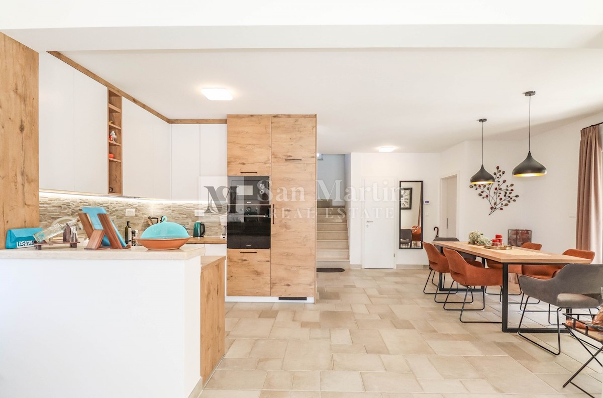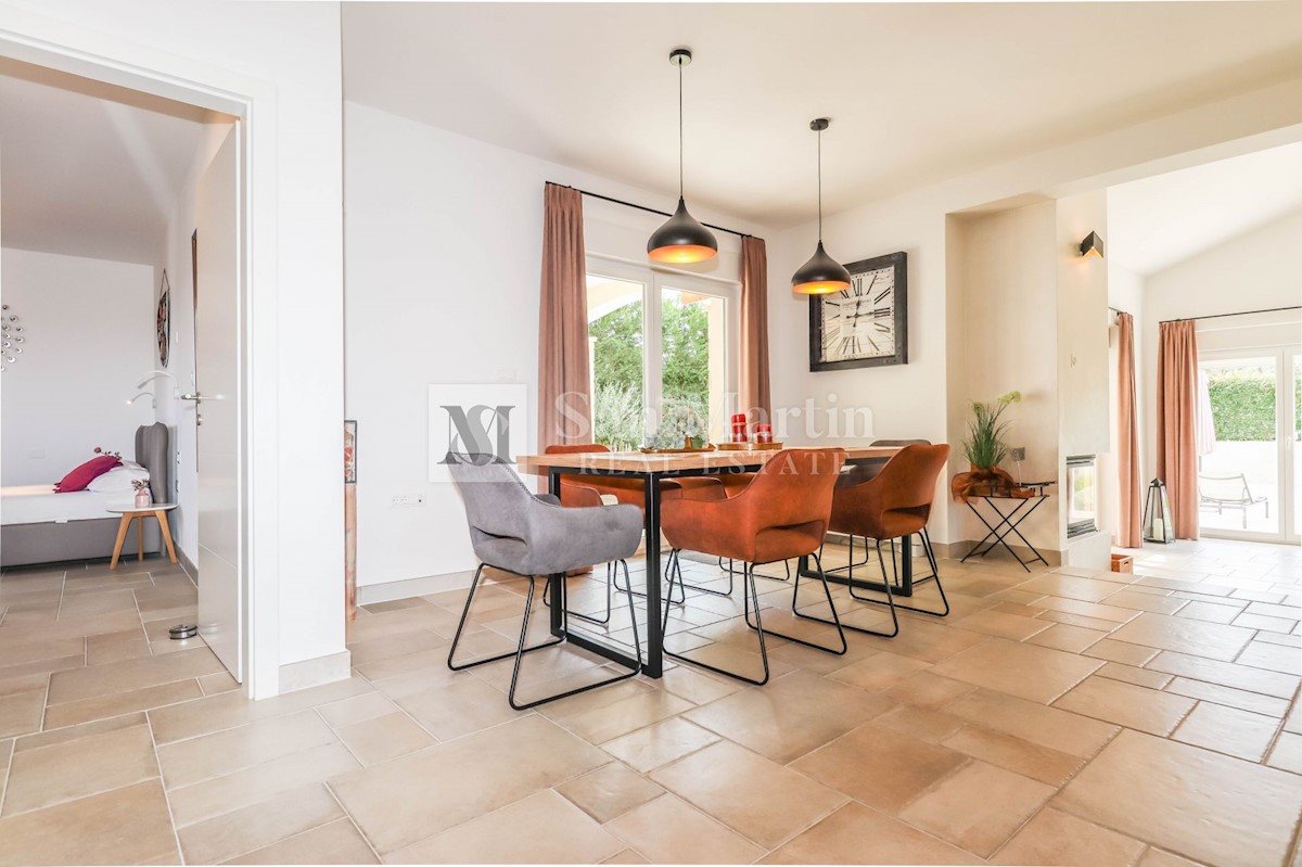 Poreč, okolica, kuća s bazenom Na pješačkoj udaljenosti od manjeg mjesta, u blizini dućana, restorana i kafića te na samo 2 kilometar od mora, prodaje se kuća s bazenom. U prizemlju kuće nalazi se dnevni dio s kuhinjom i blagovaonicom, gostinjski WC te