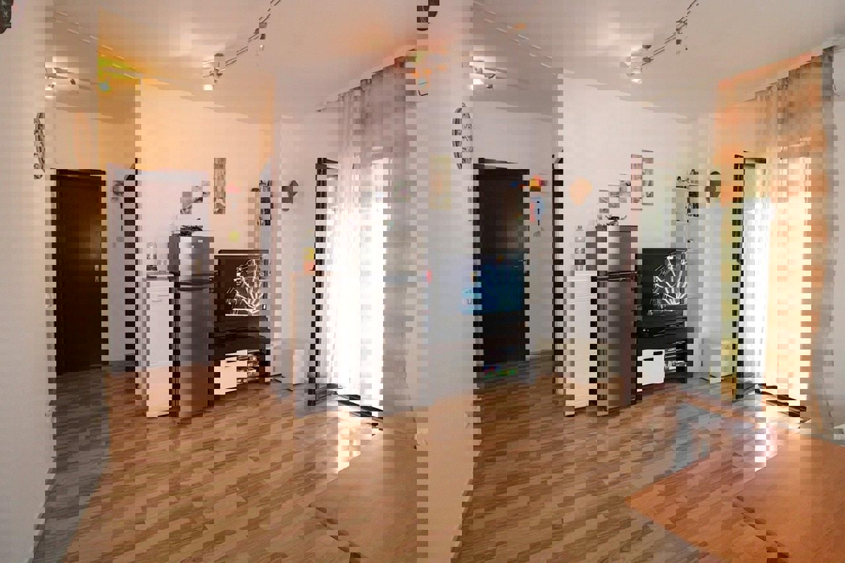 - Poreč - Apartma v 1. nadstropju v mirni soseski in 1000 m od prvih plaž in morja.Stanovanje ima lastno stopnišče, pod katerim je shramba cca. 2m2.Stanovanje v izmeri 65m2 obsega prostorno dnevno sobo, jedilnico in kuhinjo, veliko kopa